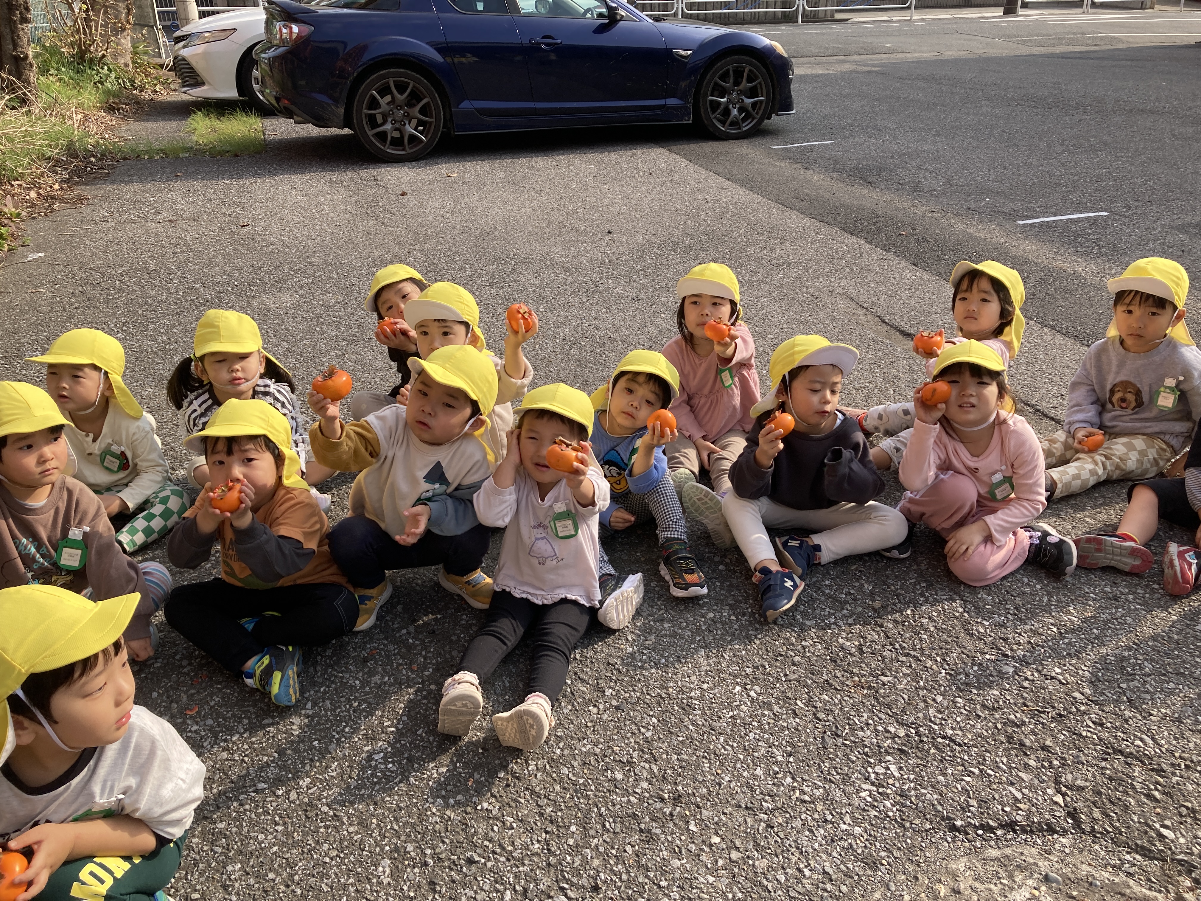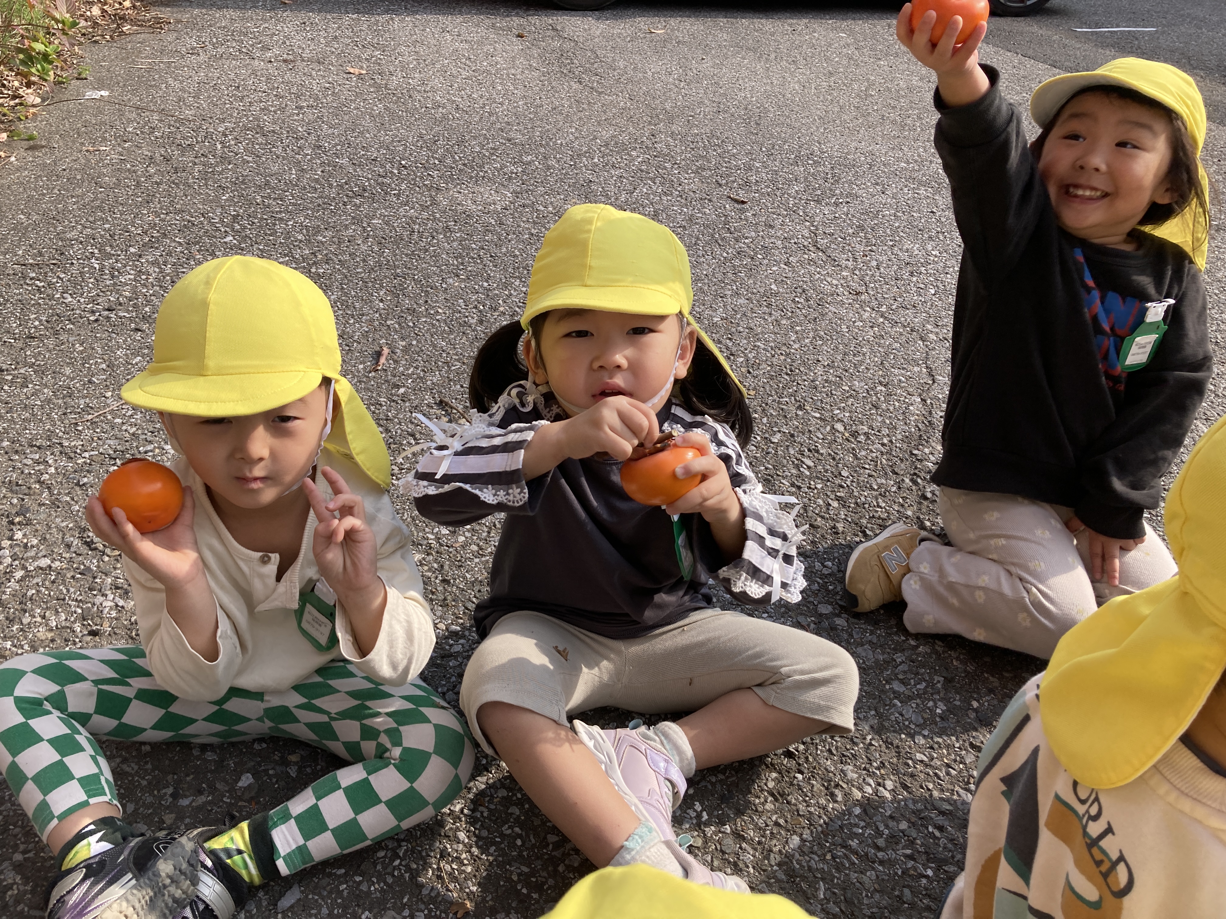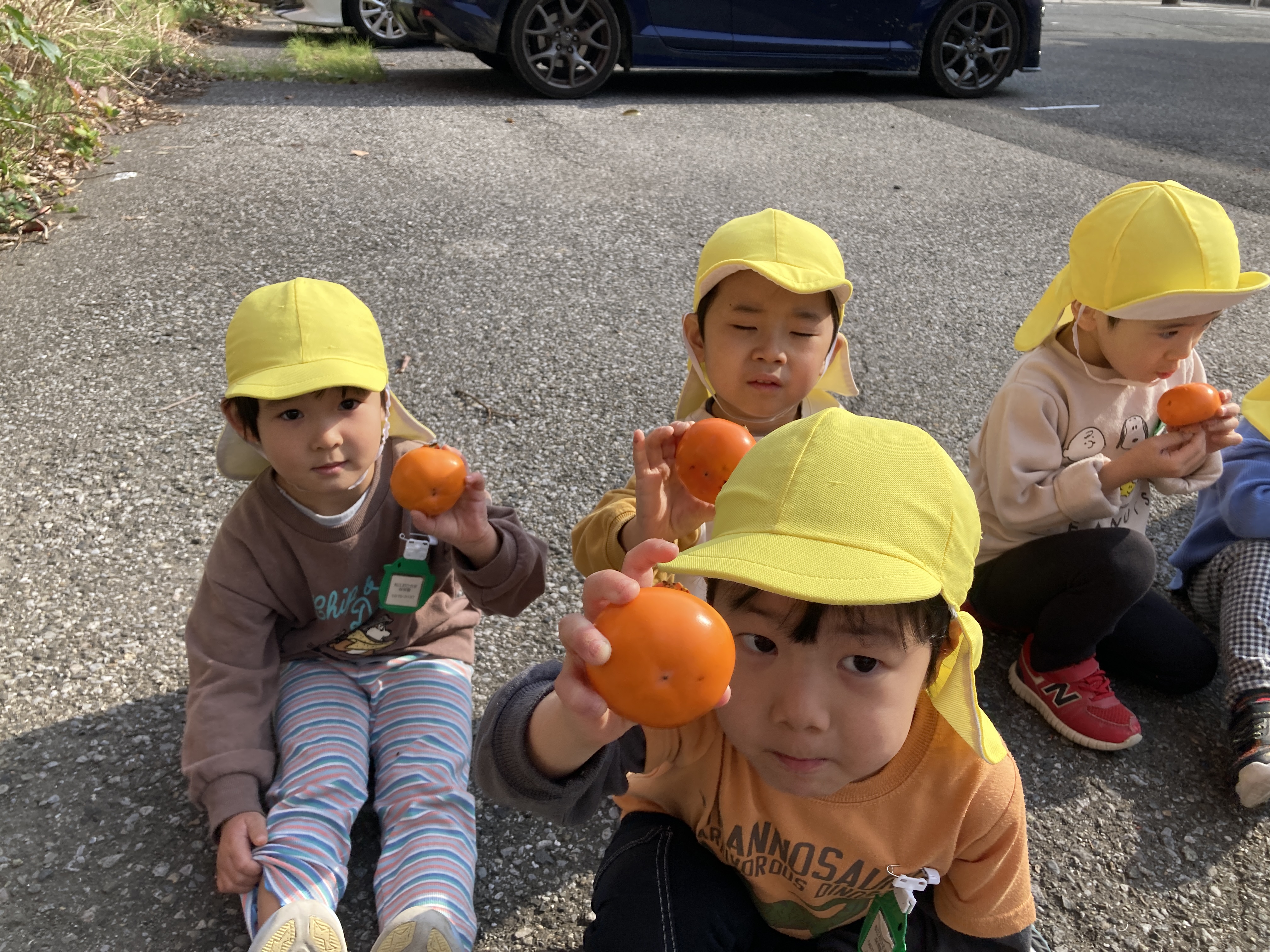 カメラを向けると自慢気に柿をみせアピールするかわいい子ども達。