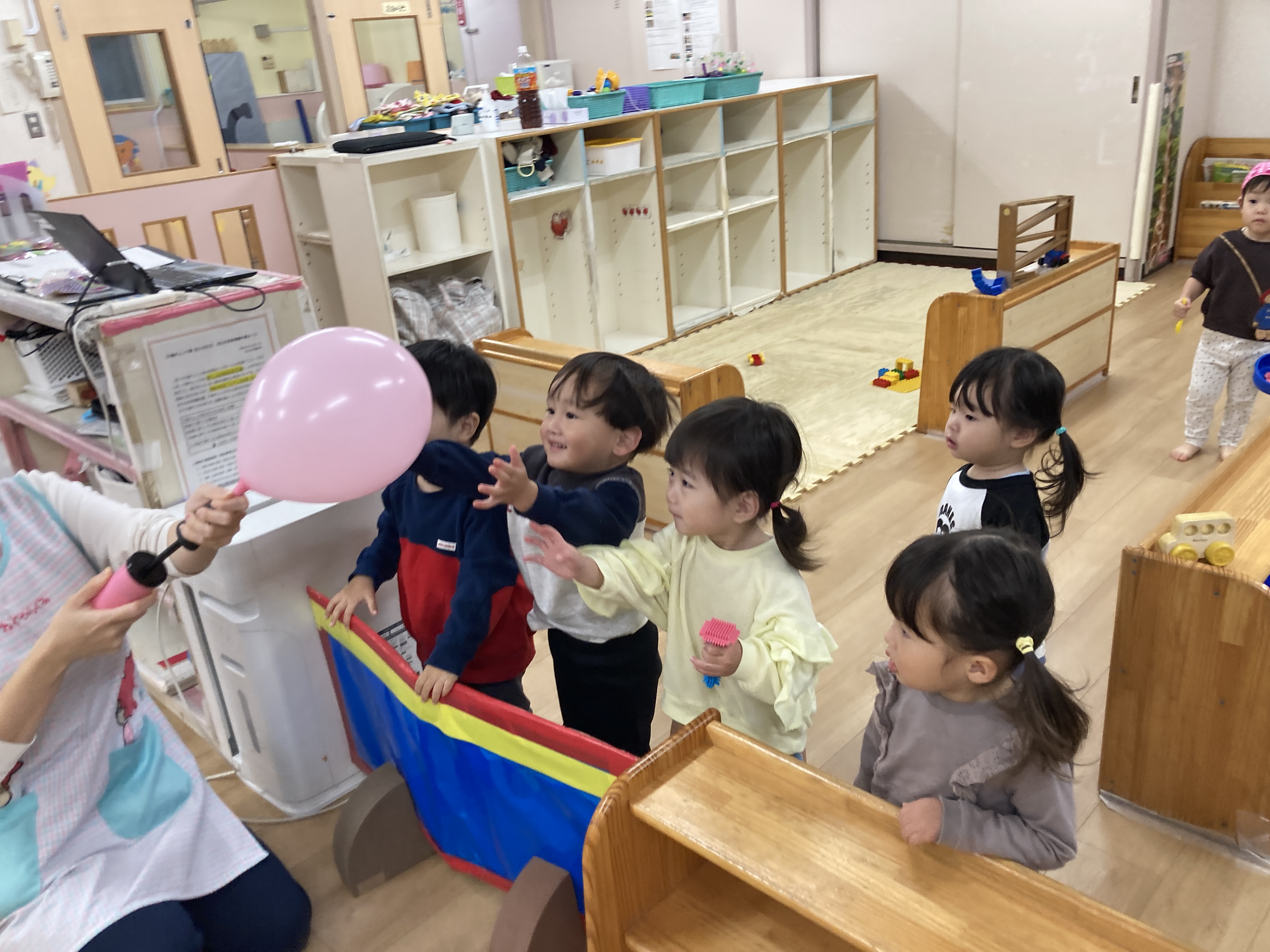 先生が風船を膨らませているところを見て子ども達は興味津々。