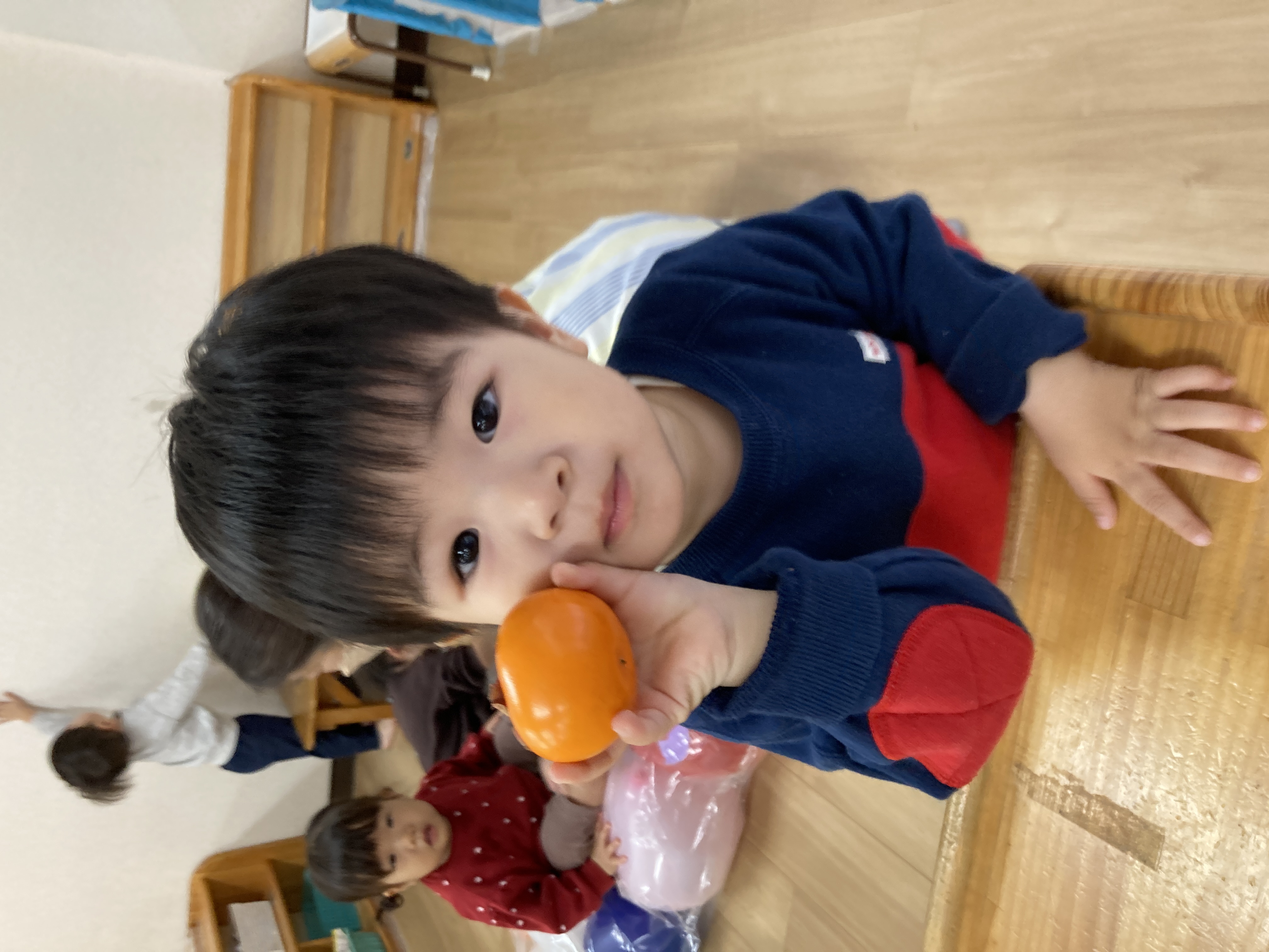今日は3歳児さんが柿の収穫をしてきてくれた柿を見せてもらいました。