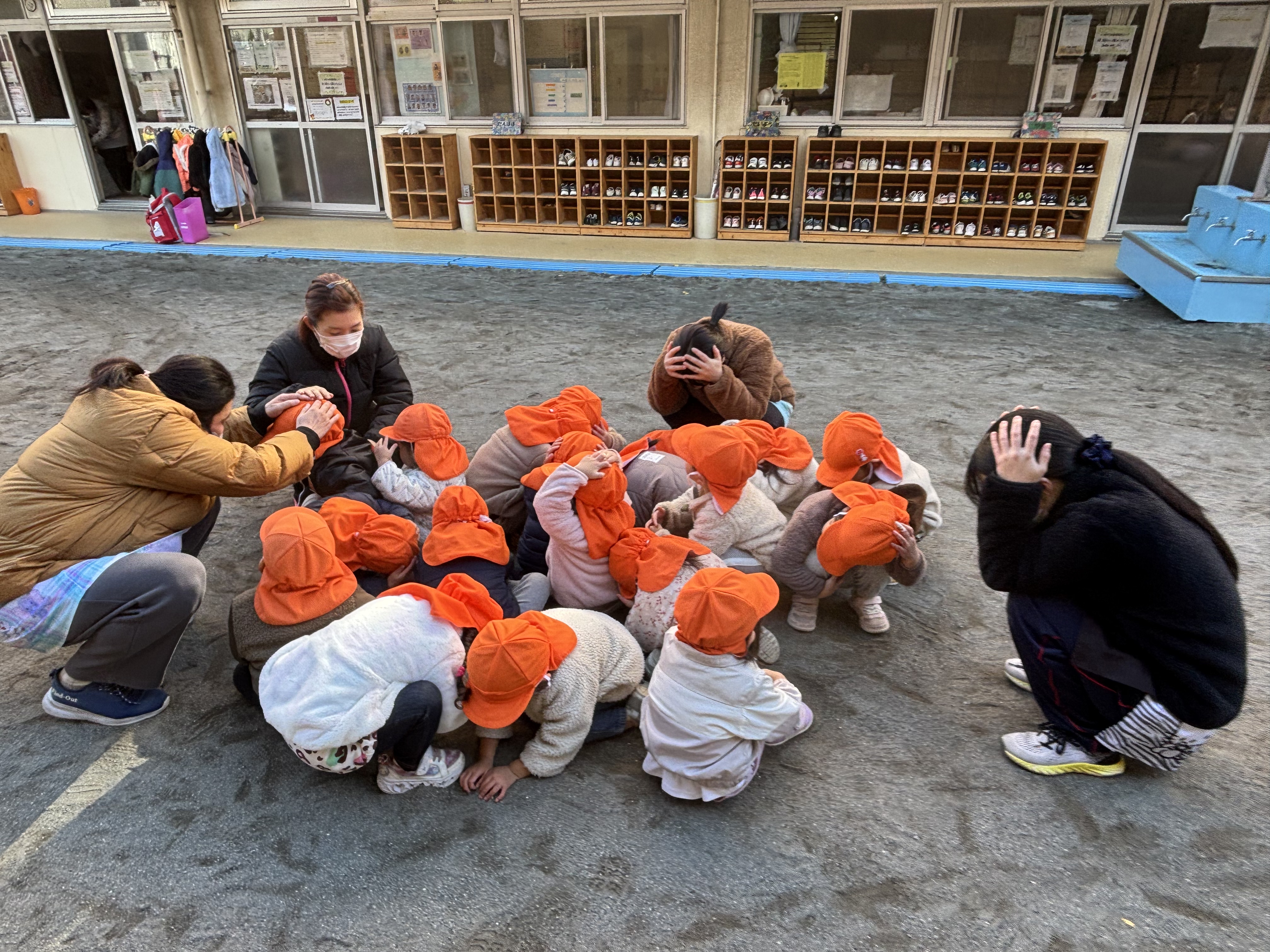 幼児さんはお部屋で机の下に身体を隠して自分の身を守る事ができました。乳児さんは園庭遊びをしていましたが、保育士の声を聞くとすぐに集まってくることができました。