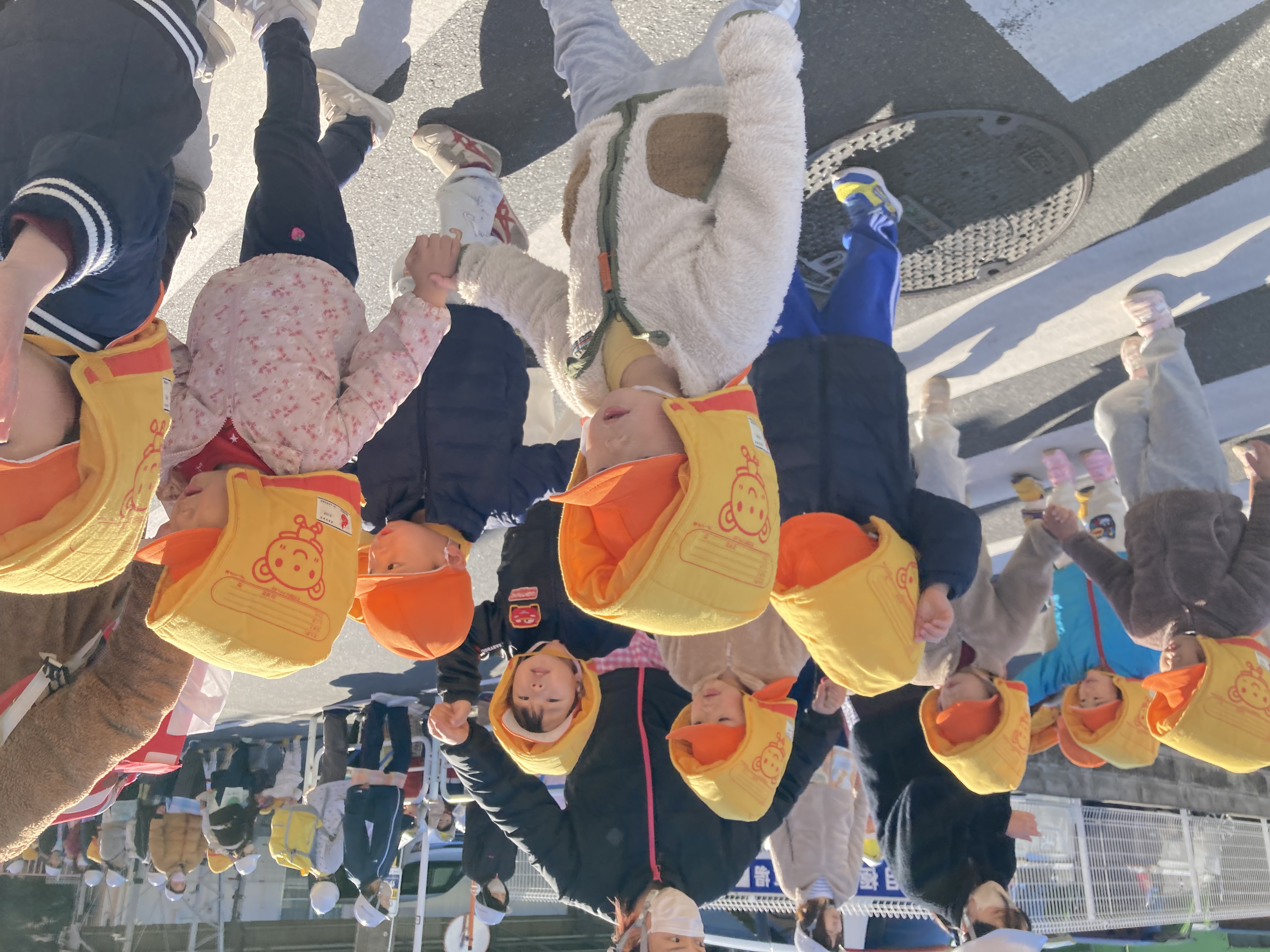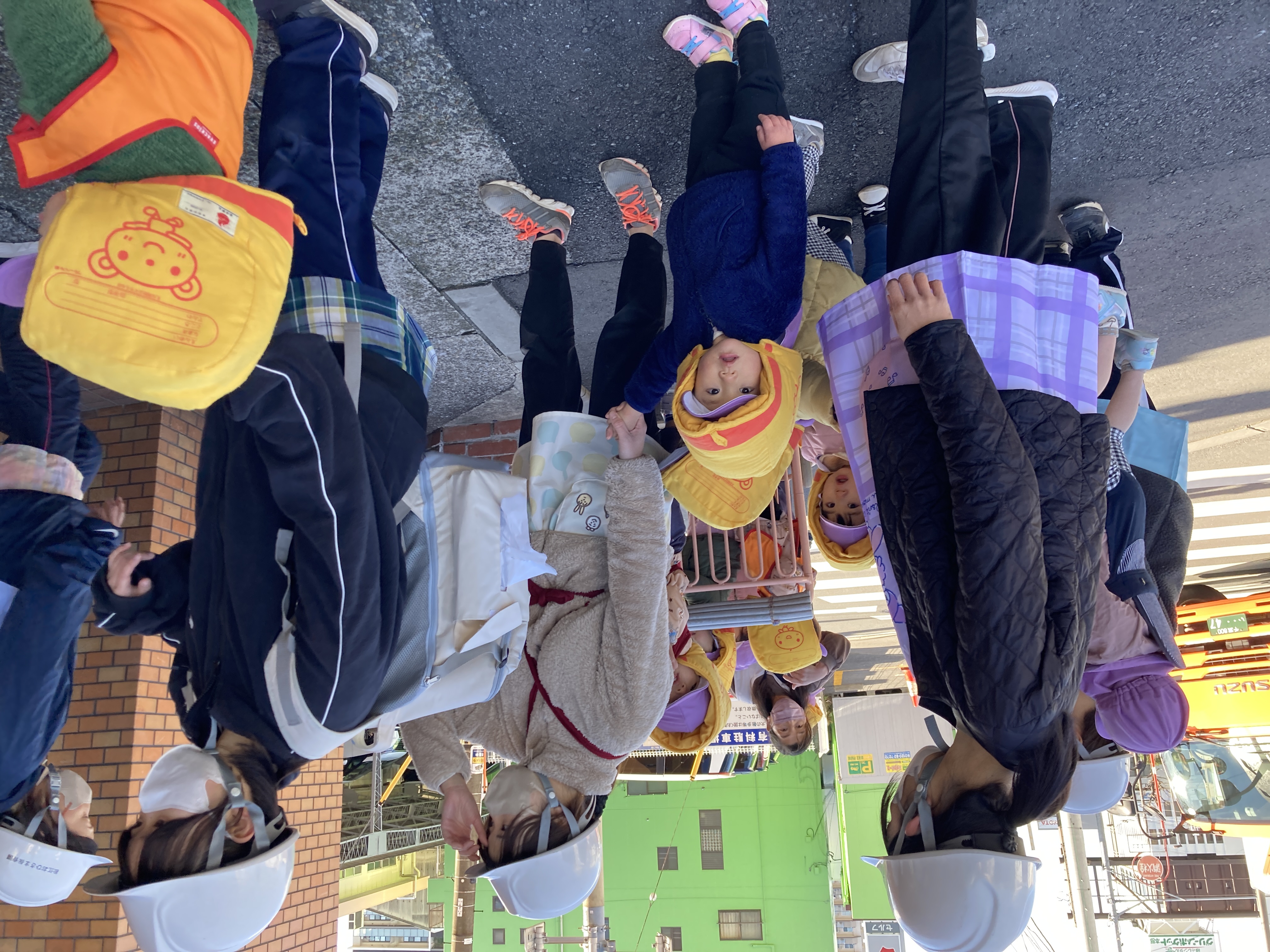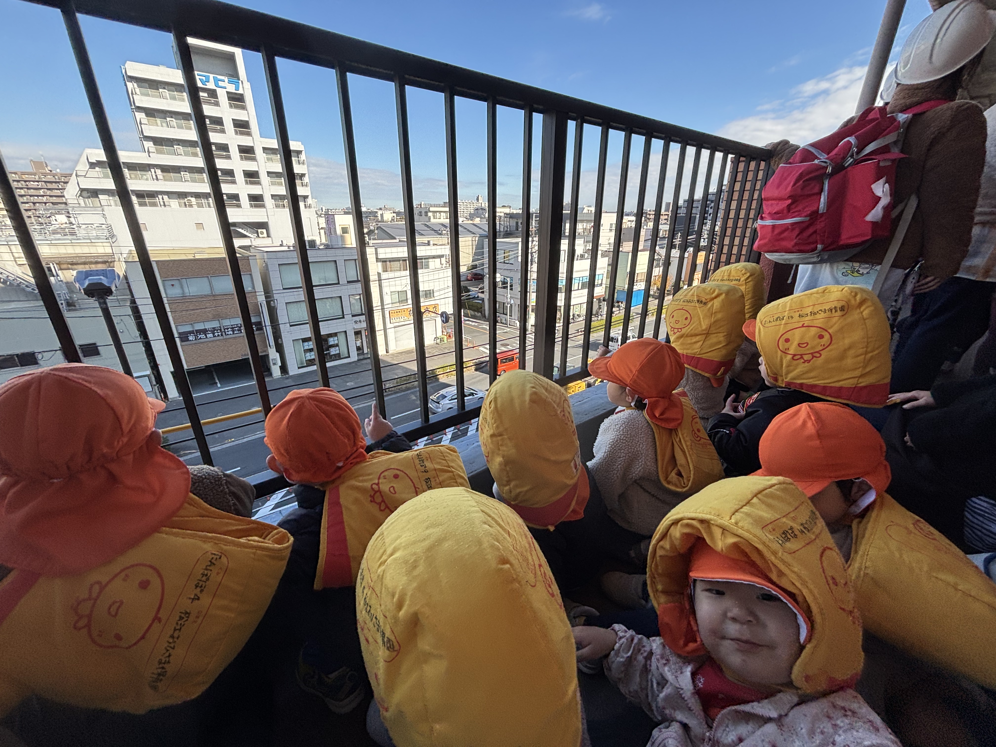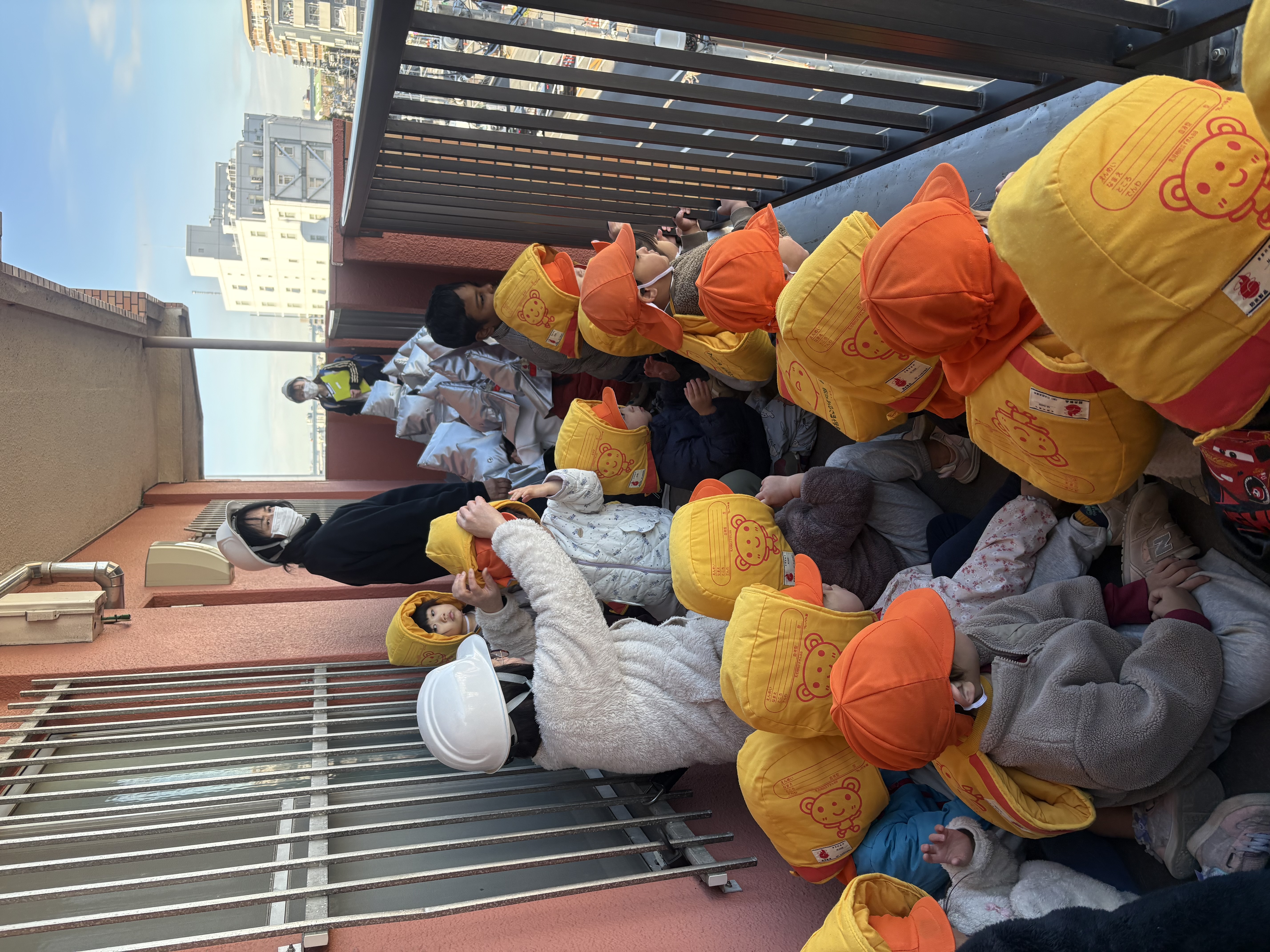 一番小さいクラスのつくし組さんは、避難車に乗ってマンションの下まで避難しました。数名は保育士がおんぶ紐を使って背負い、あとの子どもたちも一生懸命階段を登って無事に5階までたどり着くことができました。