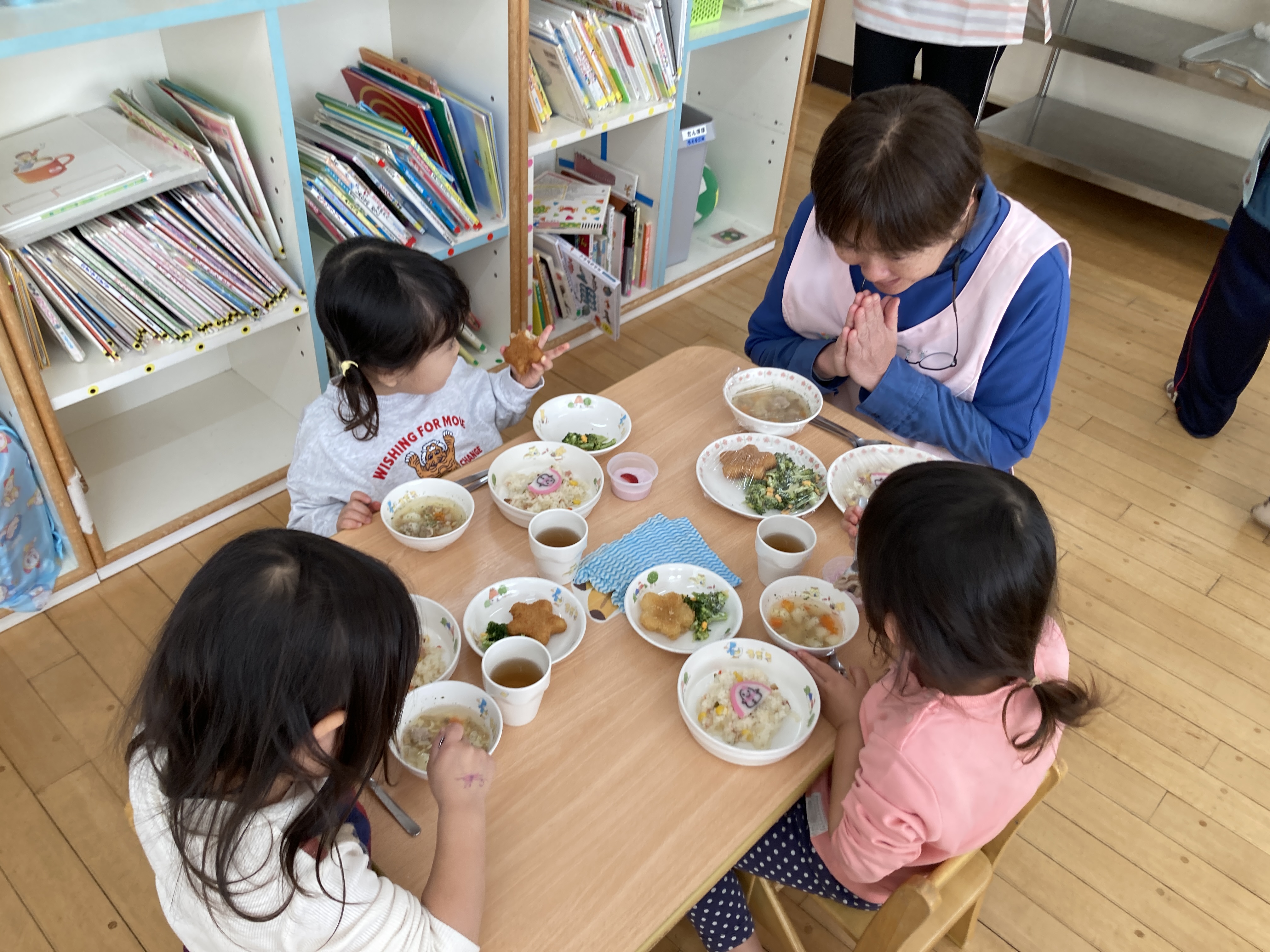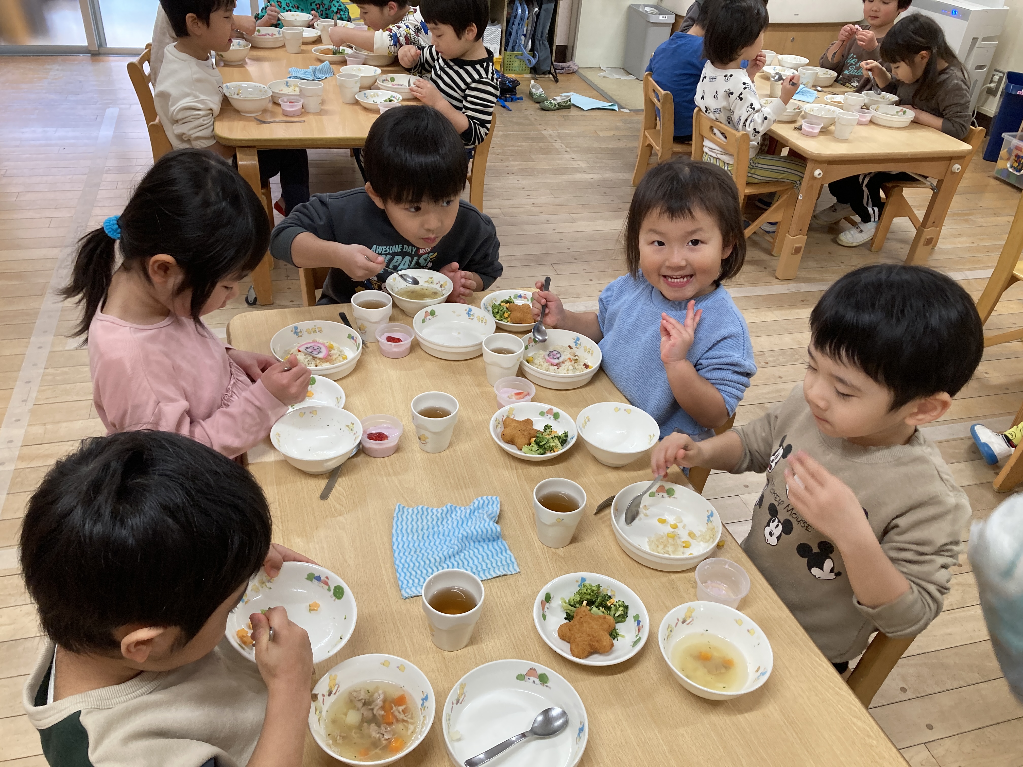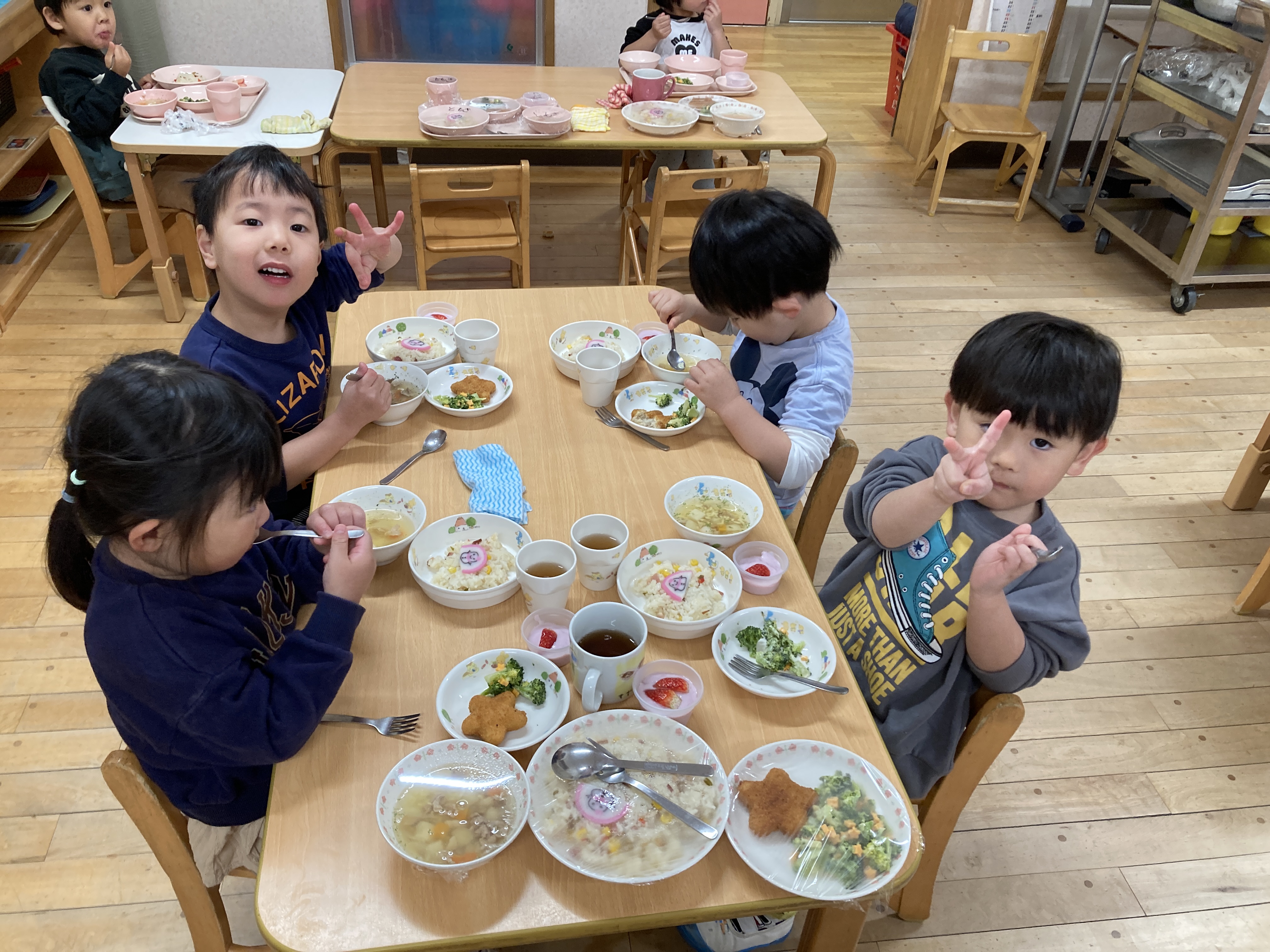 2歳児たんぽぽ組では、園長先生や給食を作っている先生と一緒にいただきました!