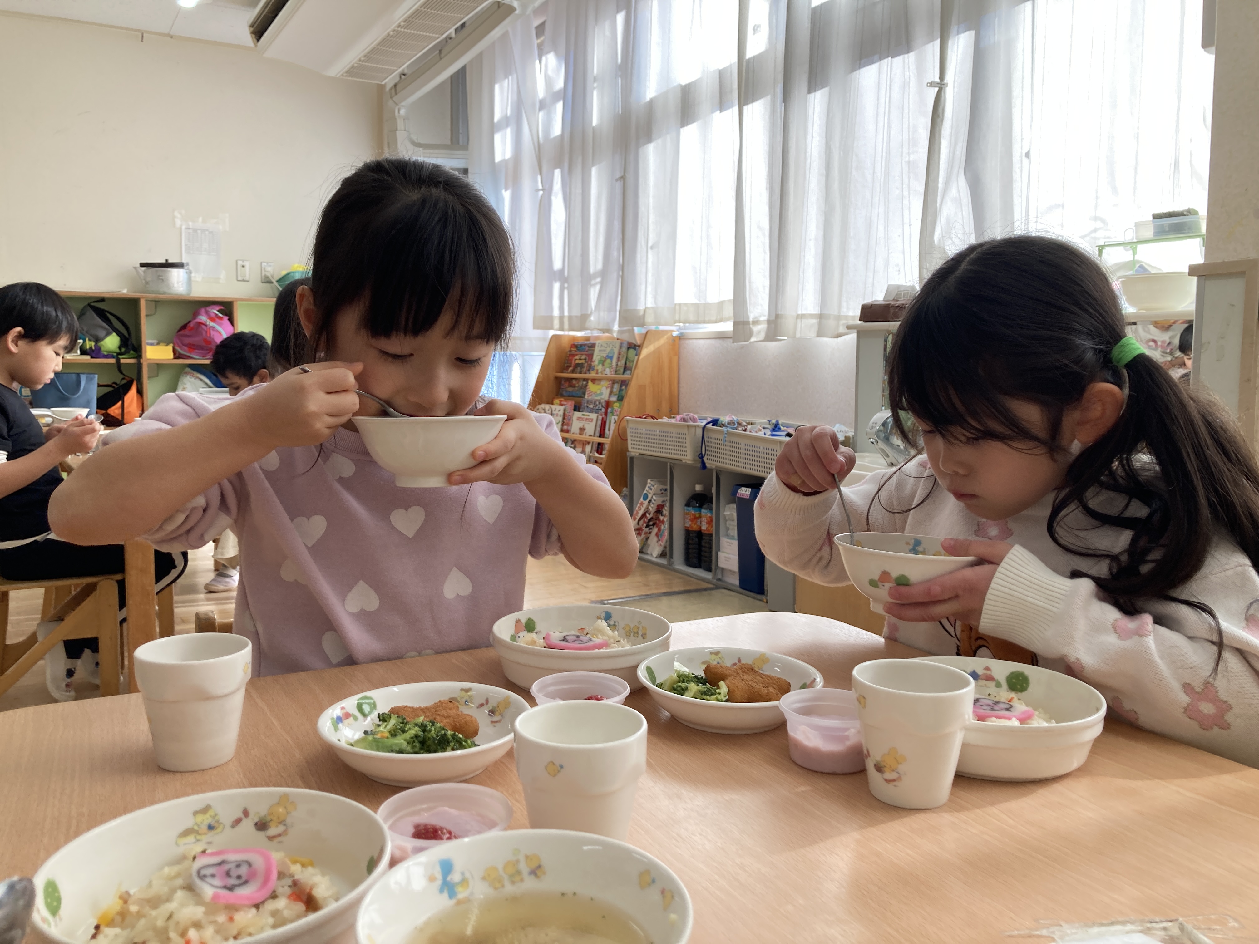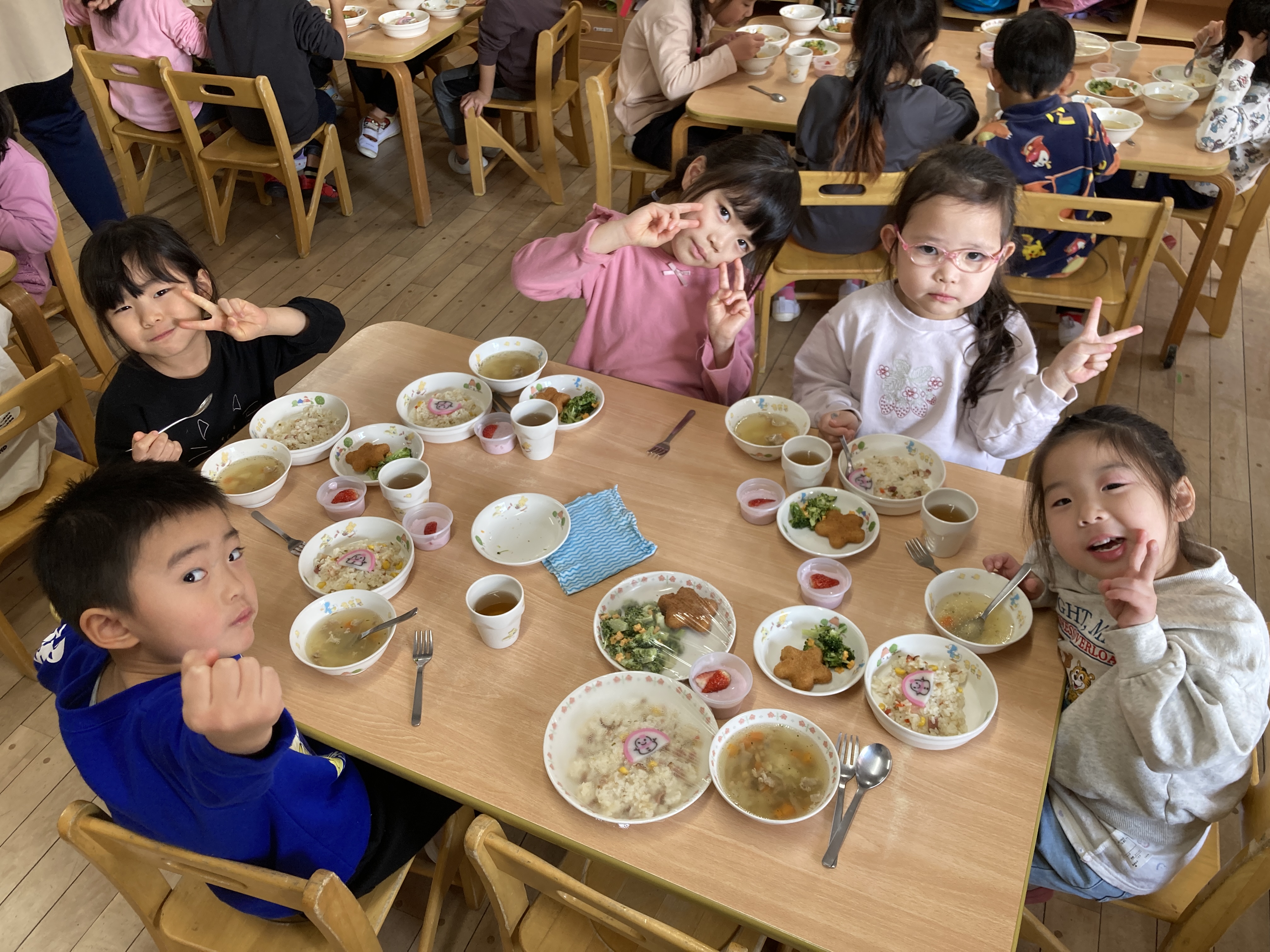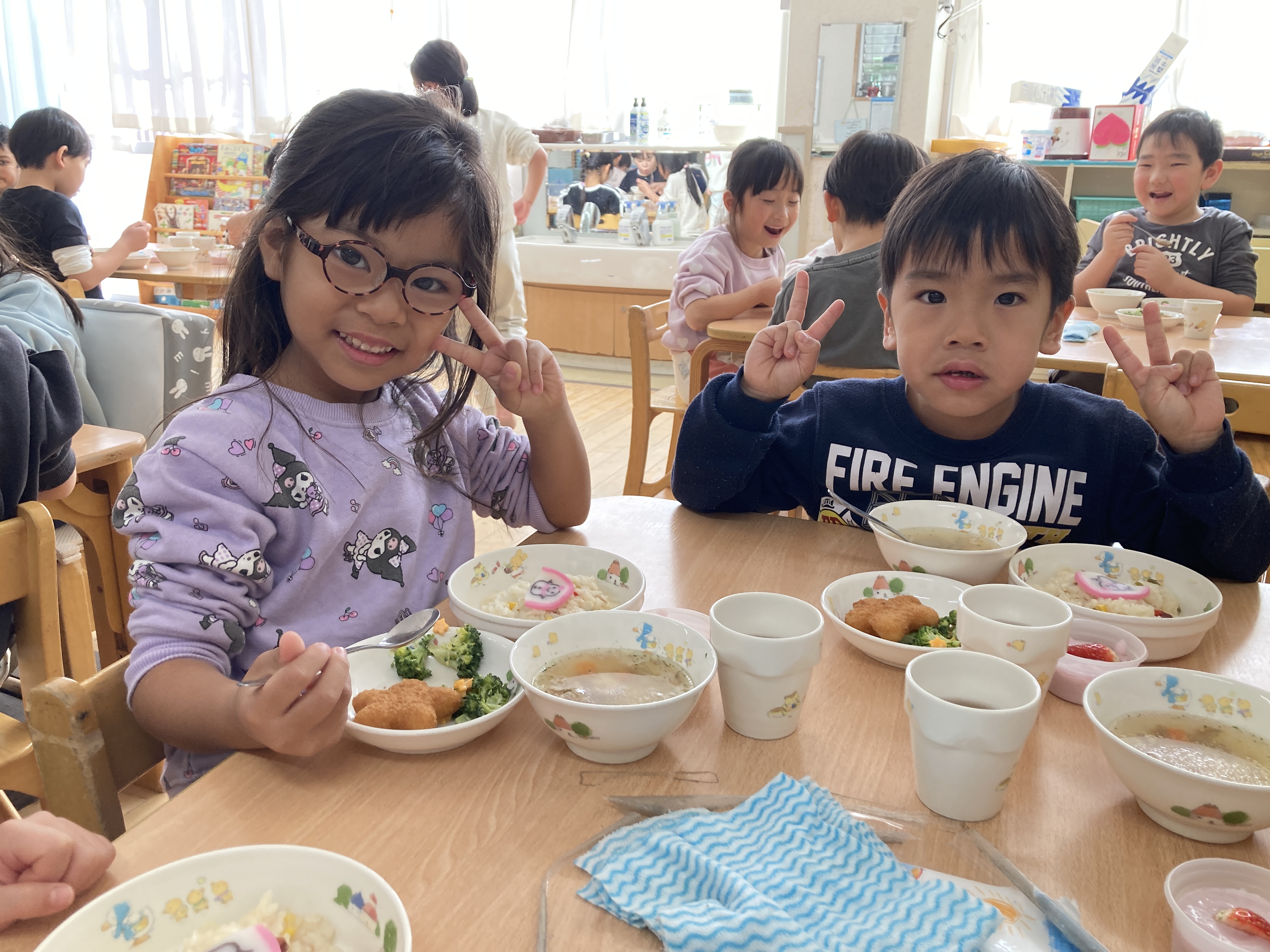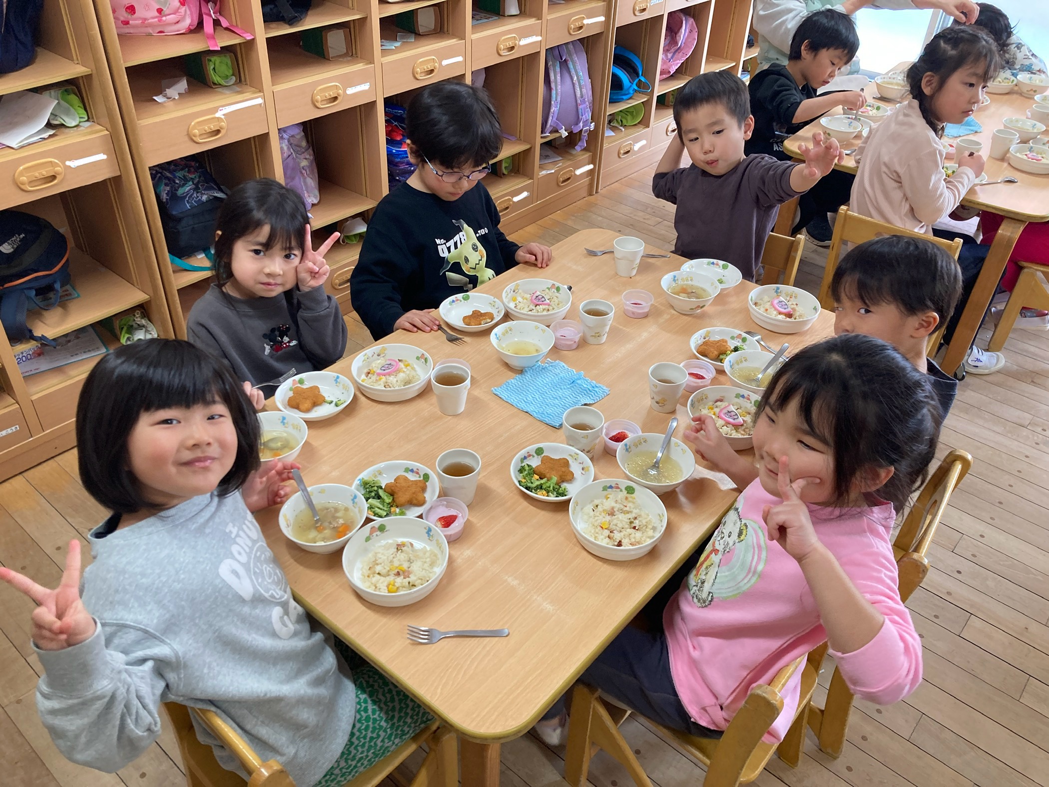 2歳児たんぽぽ組では、園長先生や給食を作っている先生と一緒にいただきました!