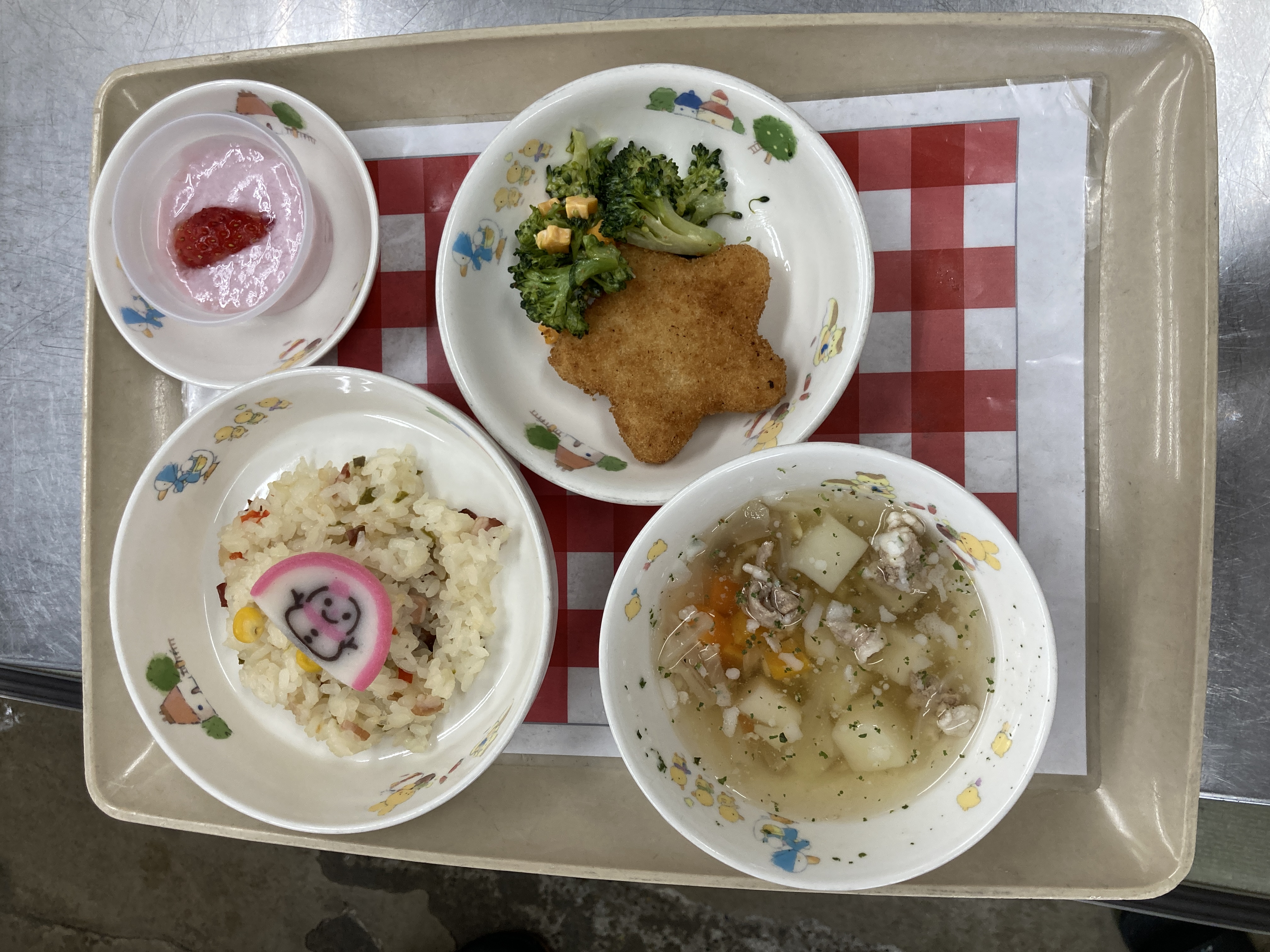 ピラフの上に乗っていたかまぼこには雪だるまの絵が載っていました!