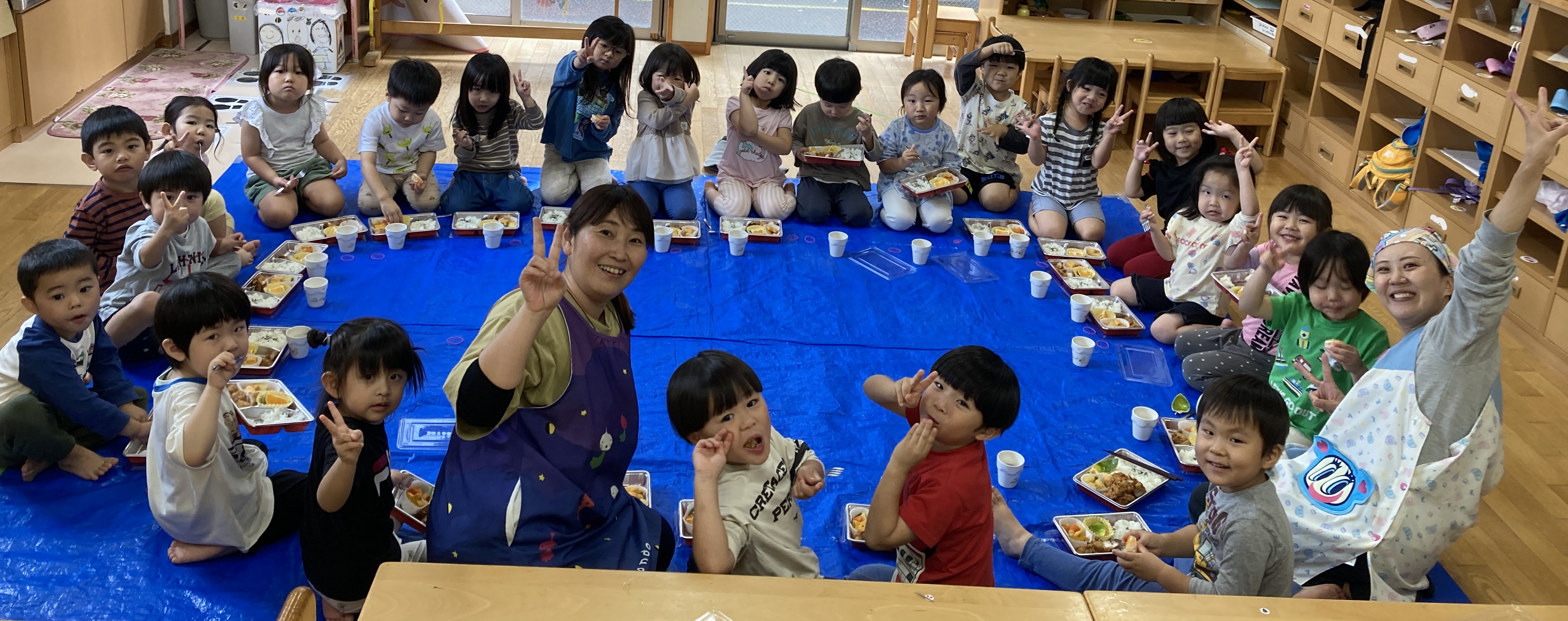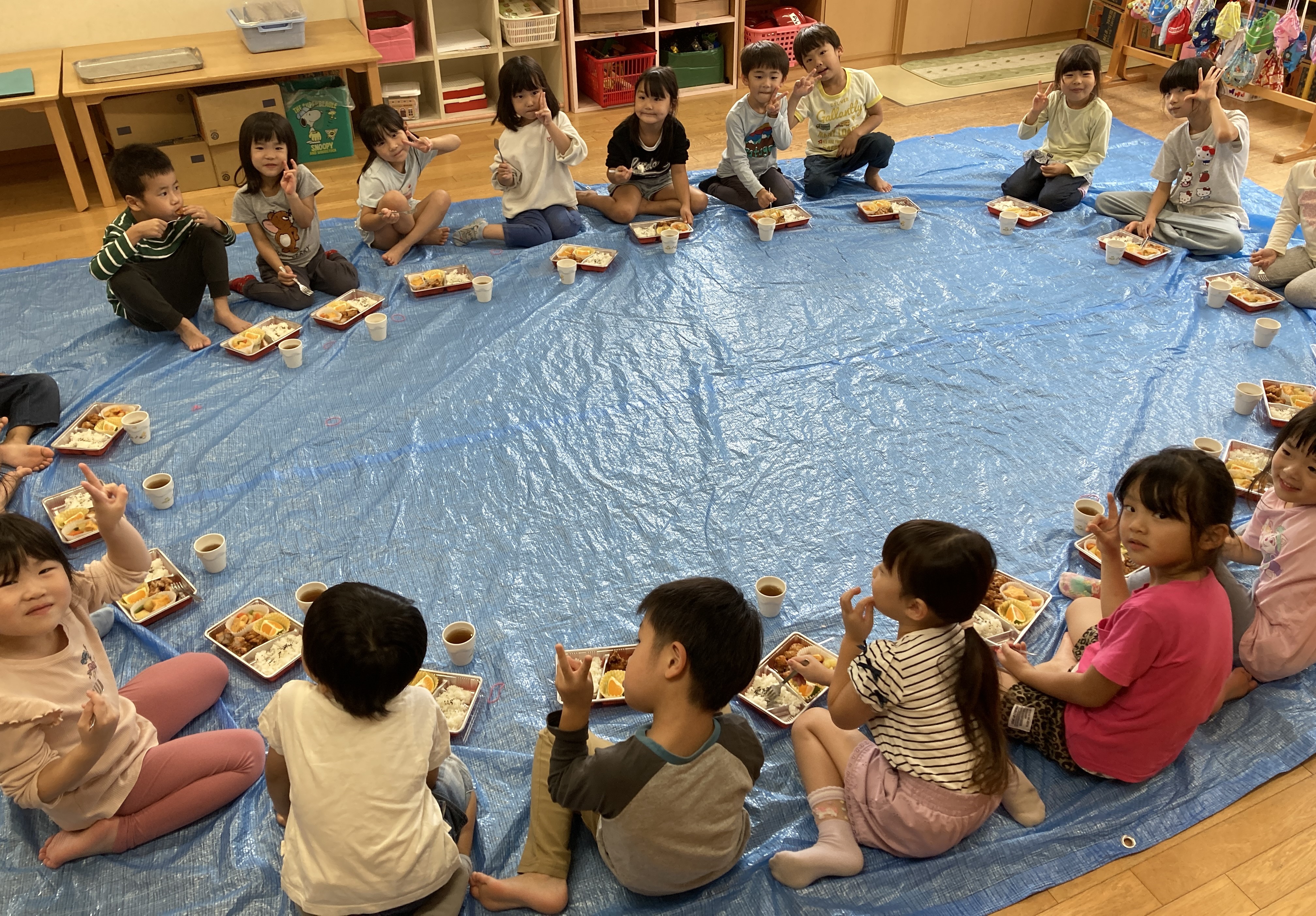 お部屋にブルーシートを敷いて丸くなってお弁当給食を楽しんだり、4歳児5歳児は交流を楽しみながらワイワイ食事を楽しみました!