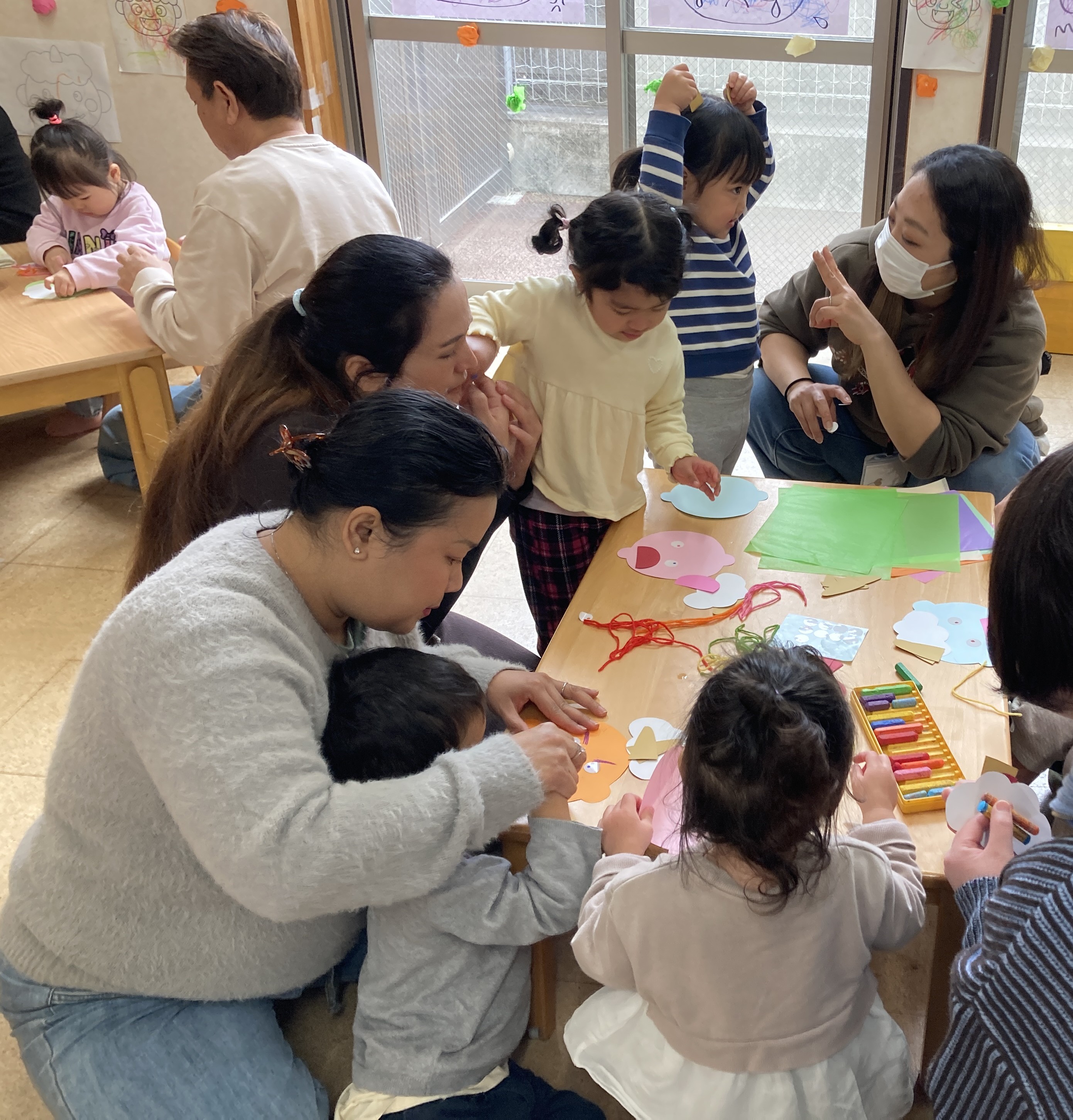 おうちの方と一緒に保育園で過ごし、鬼のお面制作や園庭遊びを楽しみました。