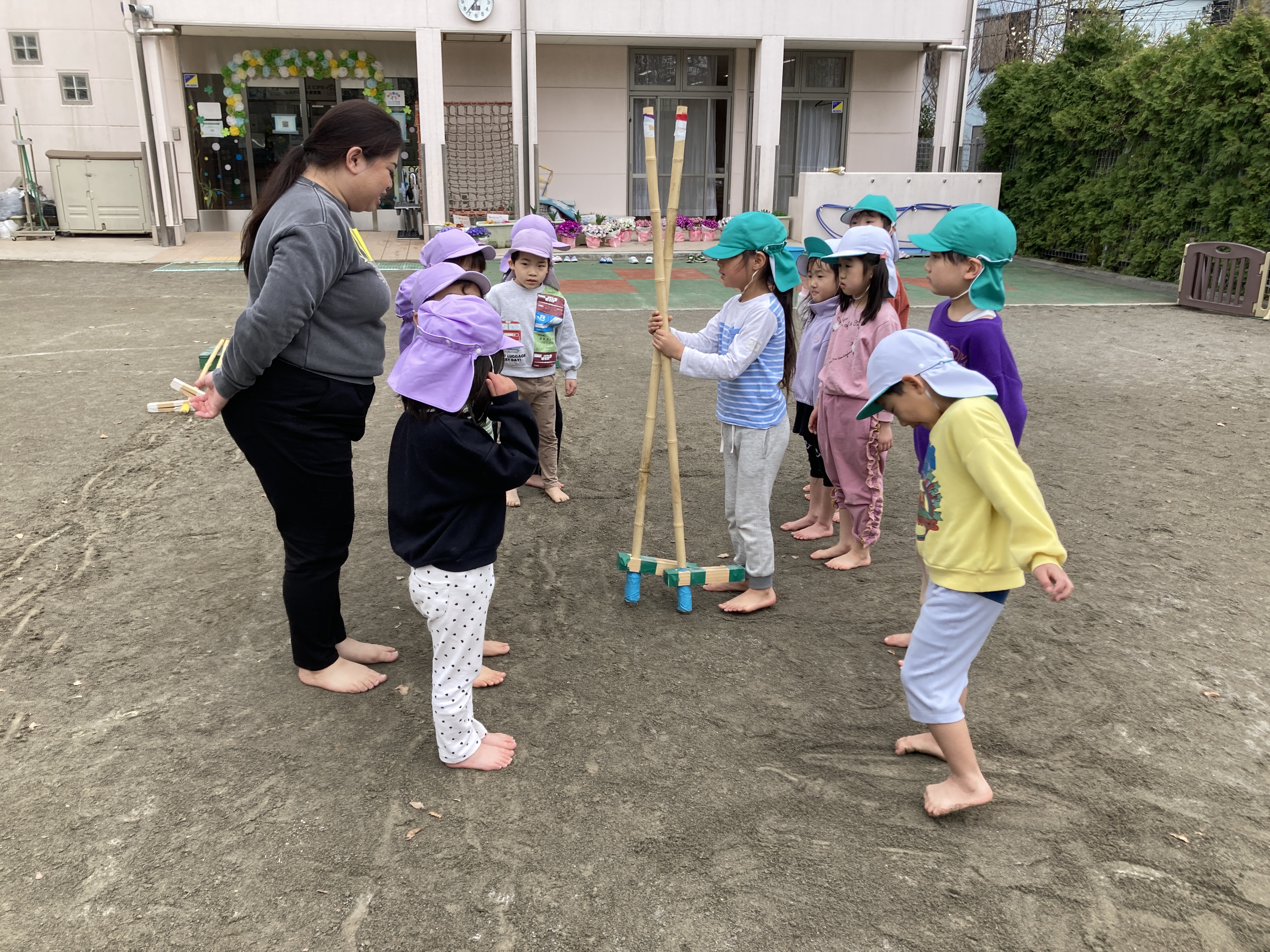 竹馬の引継ぎ式を行い、らいおん組さんからきりん組さんへ竹馬を披露し、