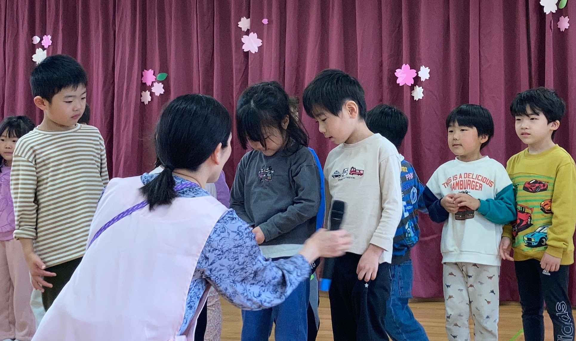 担任の先生に名前を呼ばれて返事をした後一人ずつ、アーチをくぐって並びみんなで進級をお祝いしました。そして園長先生から新クラスの名札、小学校に進学する子どもたちは「卒園おめでとう」バッチをもらいドキドキしながらも進級した喜びを感じている様子がありました。