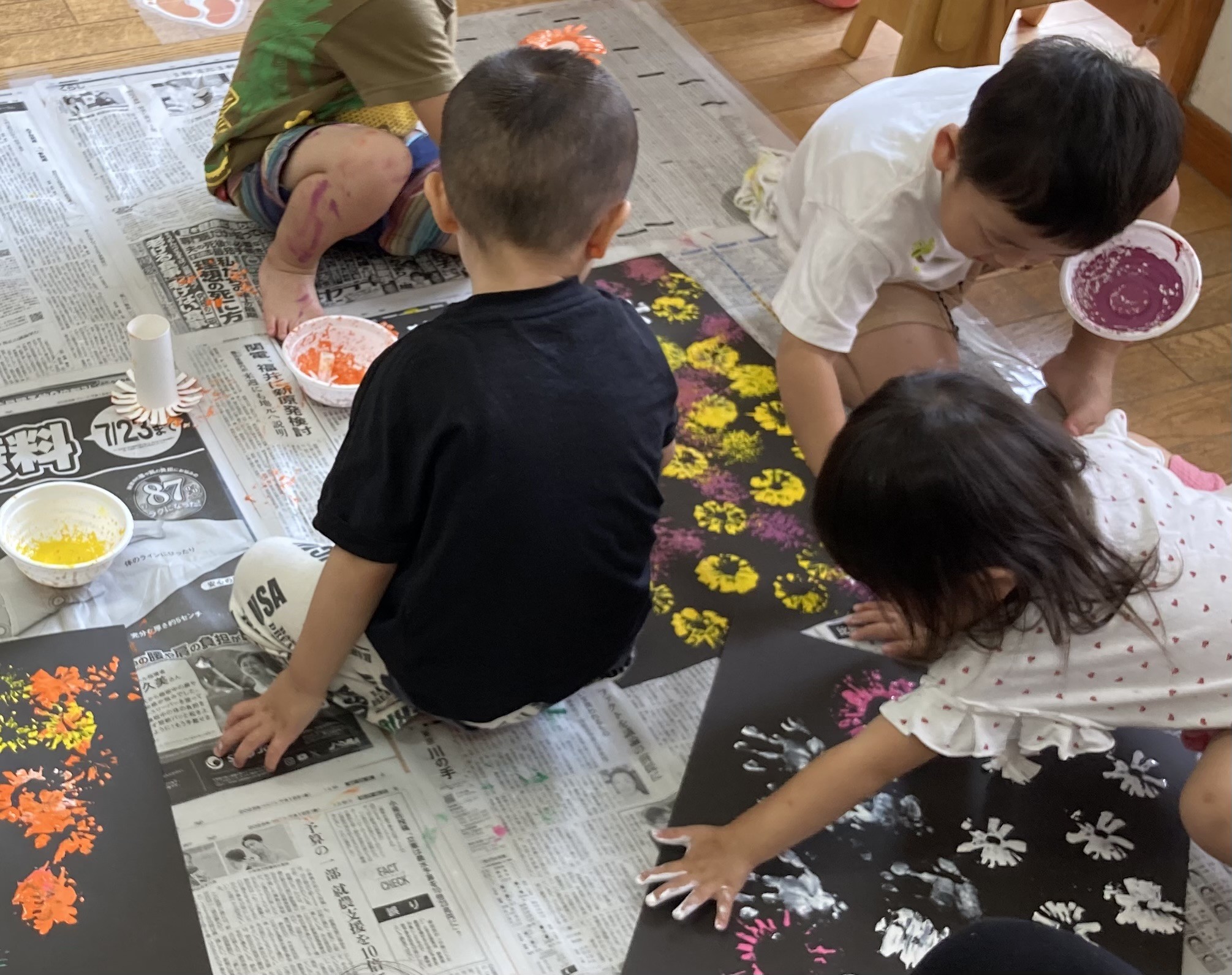 絵の具の感触を味わい、手のひらで花火を作りました。