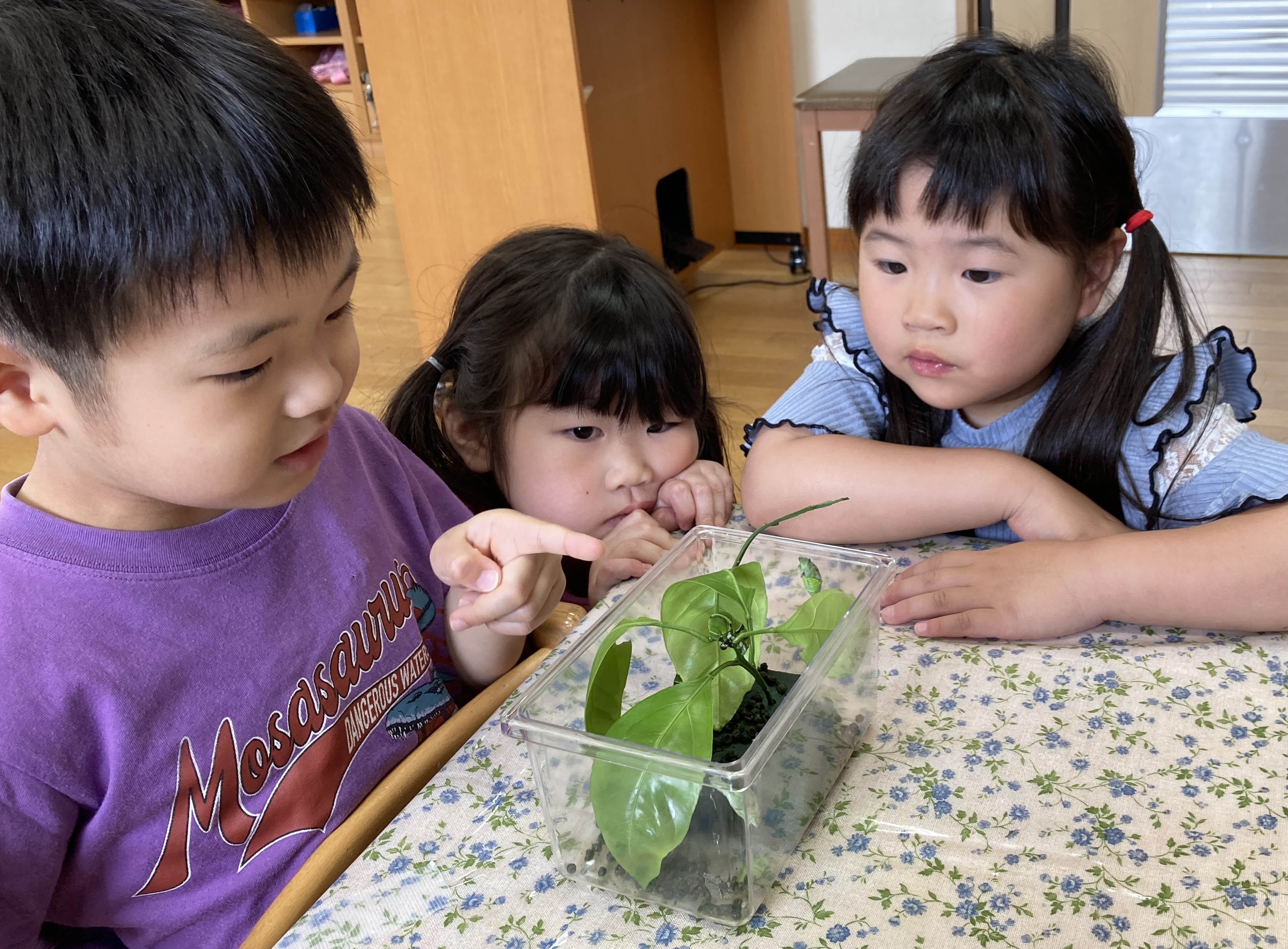 各クラス虫かごの中で観察することで、命の大切さや身近な自然にたくさん触れることができます。