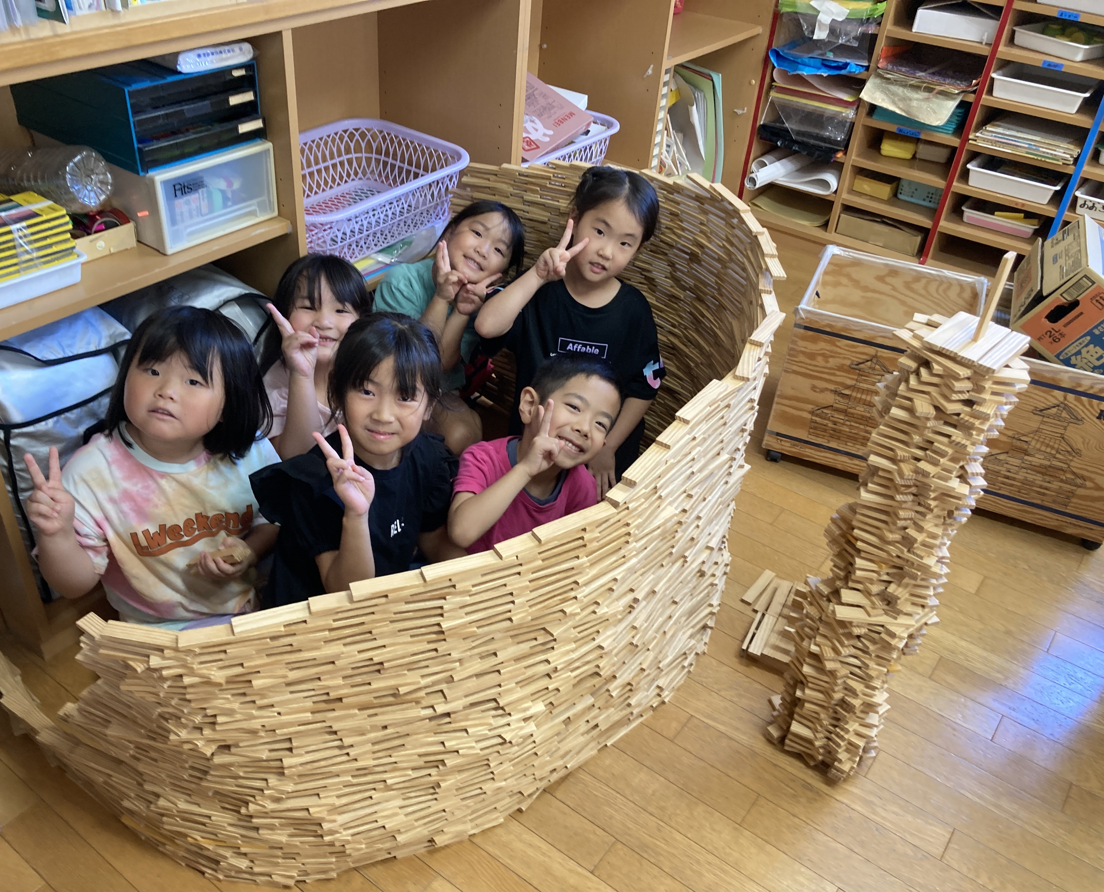 5歳児らいおん組。カプラで作ったおうちです。子ども達の発想力には驚かされます。子どもたちのわくわくの種を伸ばしていきたいと思います。