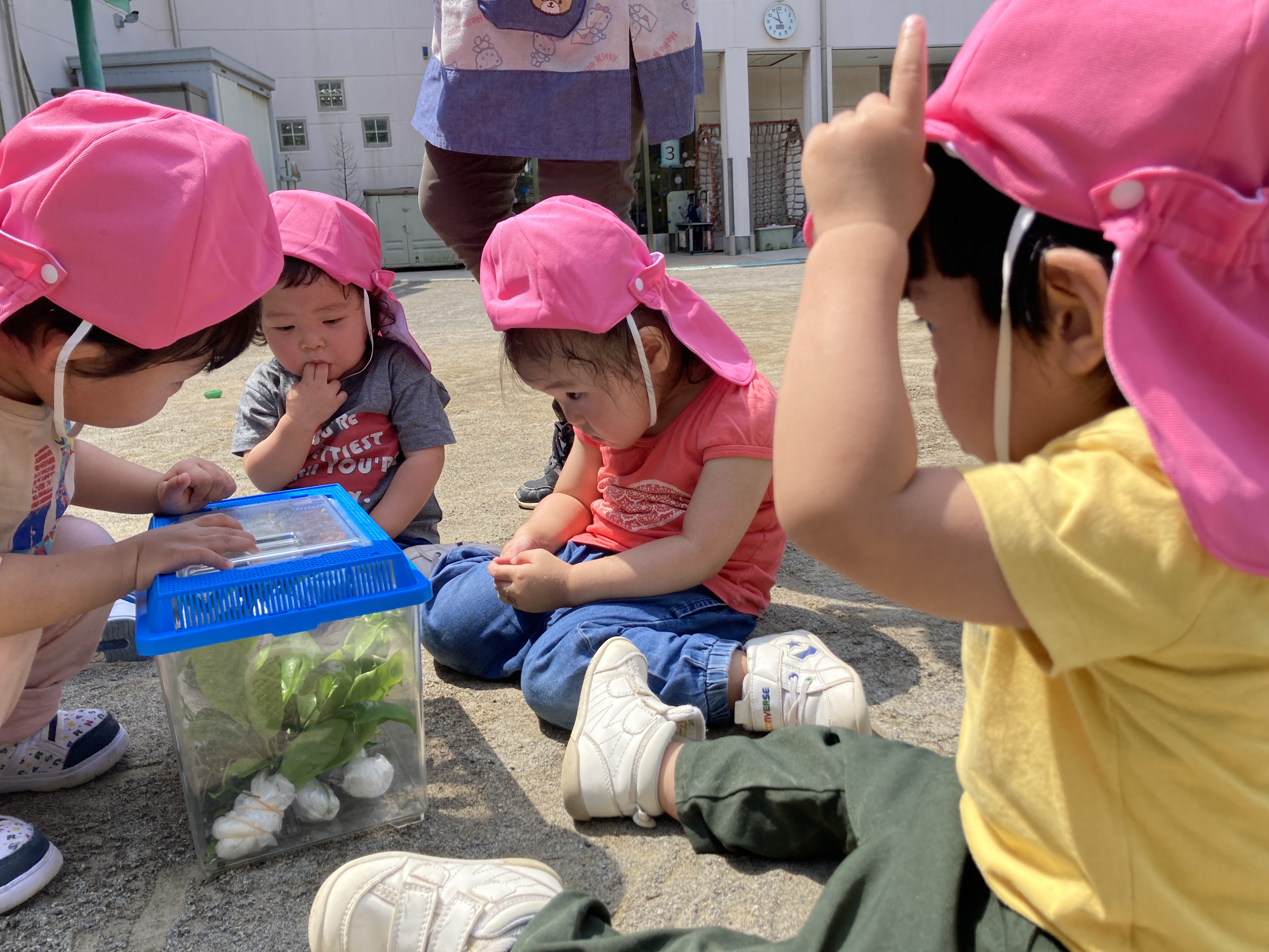 保育園の裏テラスにはみかんの木があり、葉っぱに青虫がいました。