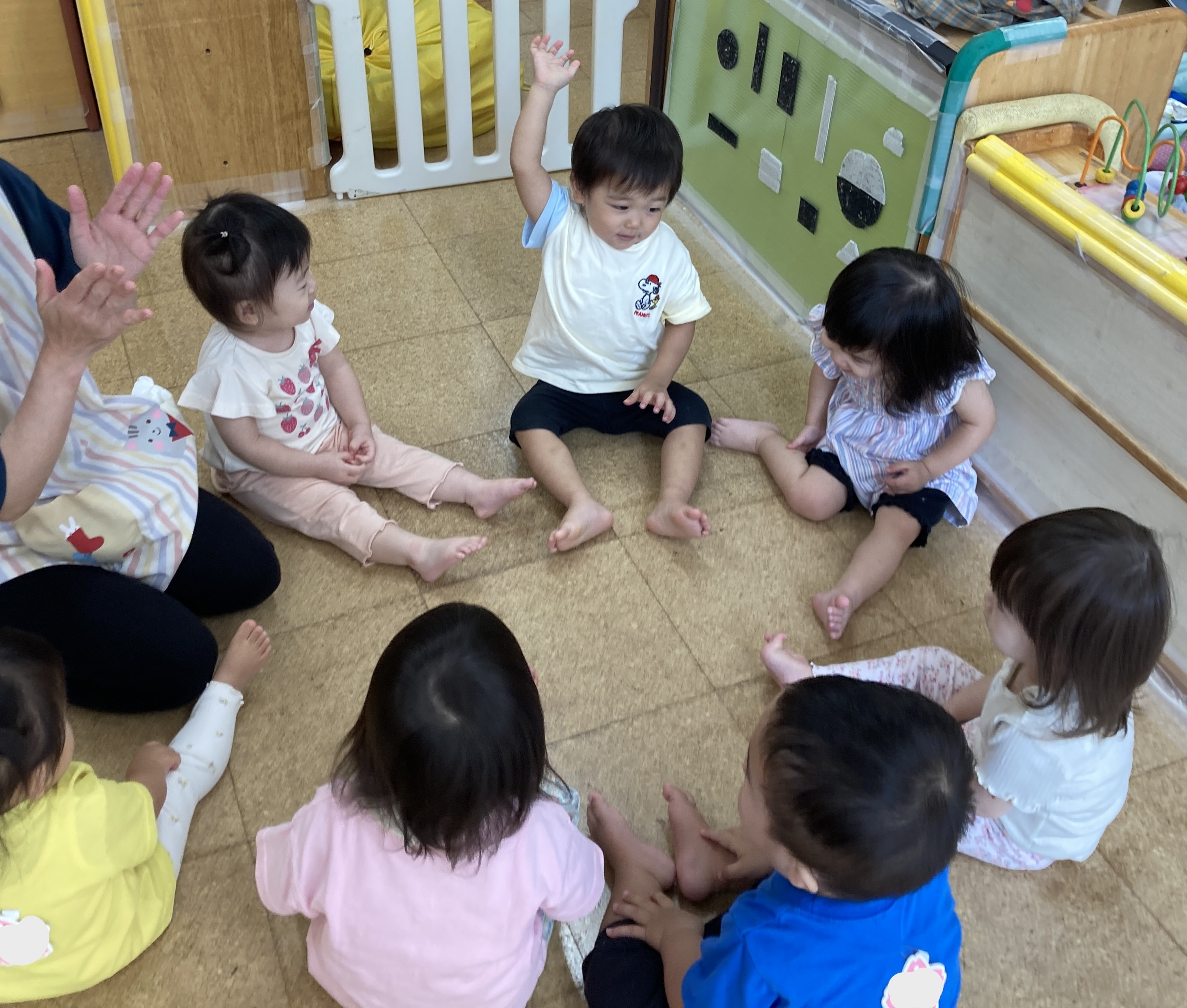1歳児ひよこ組。初めて保護者の方と離れるときは、涙を流していた子ども達も、今ではすっかり保育園に慣れ、たくさんの笑顔を見せてくれています。保育園では、季節に合わせた様々な活動を取り入れ