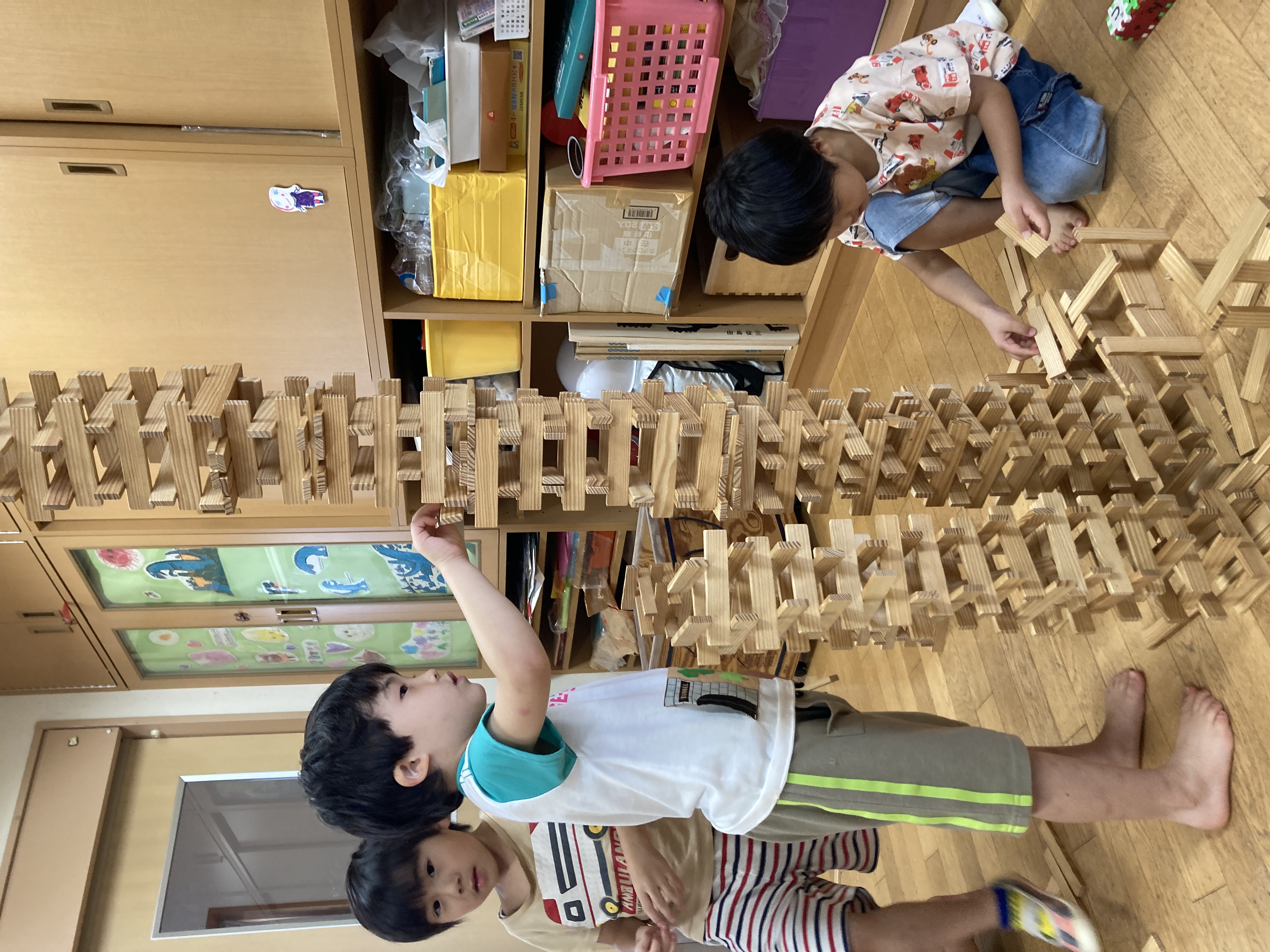 <カプラ遊び>カプラ遊びが流行しています。お友達と一緒に高さを競っていましたが、お友達が「一緒にスカイツリー作ろう」と言ったことがきっかけで、みんなで協力して完成したカプラのスカイツリーです。