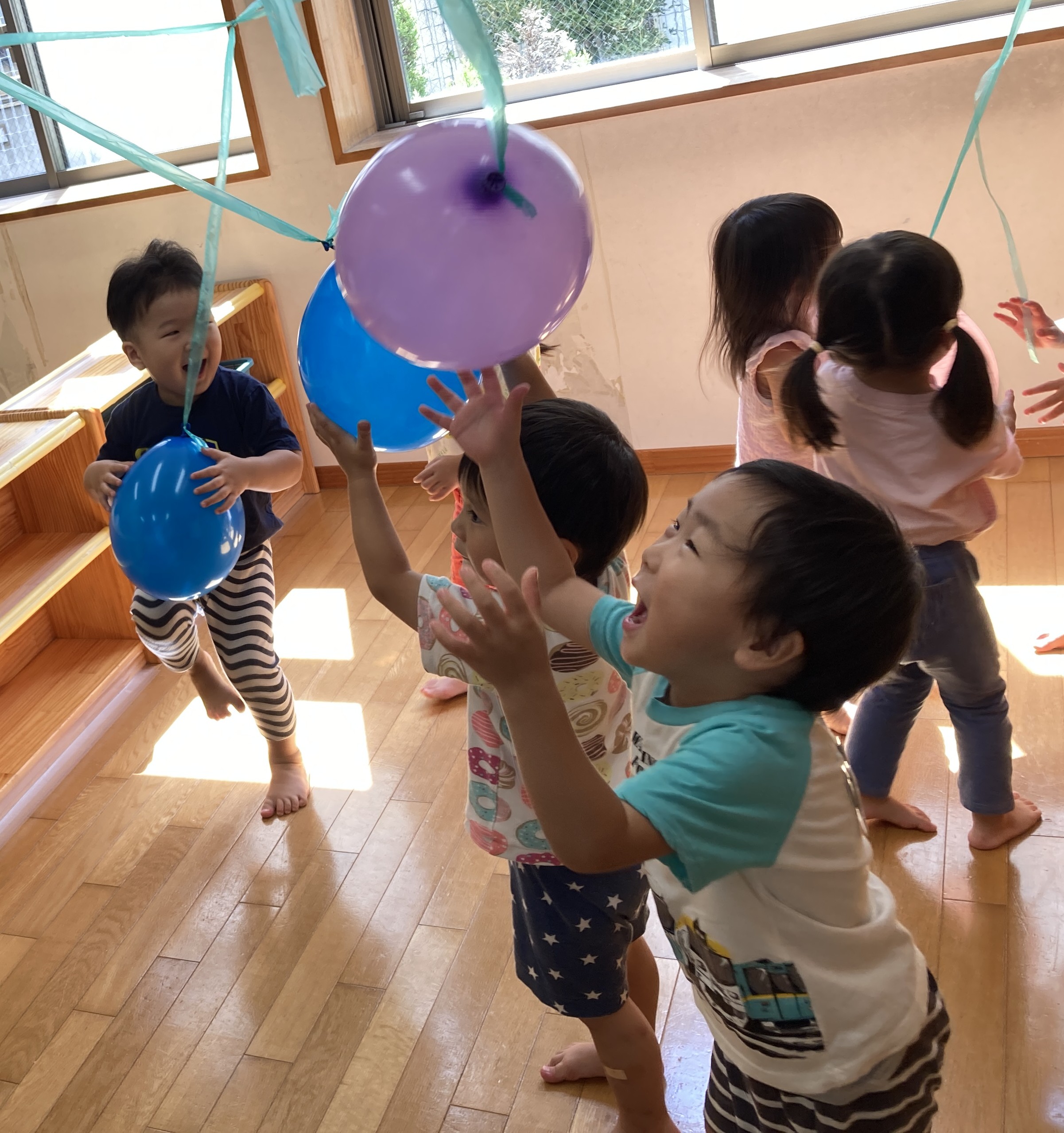 2歳児あひる組。猛暑の時はお部屋を風船パークにして遊びました。
