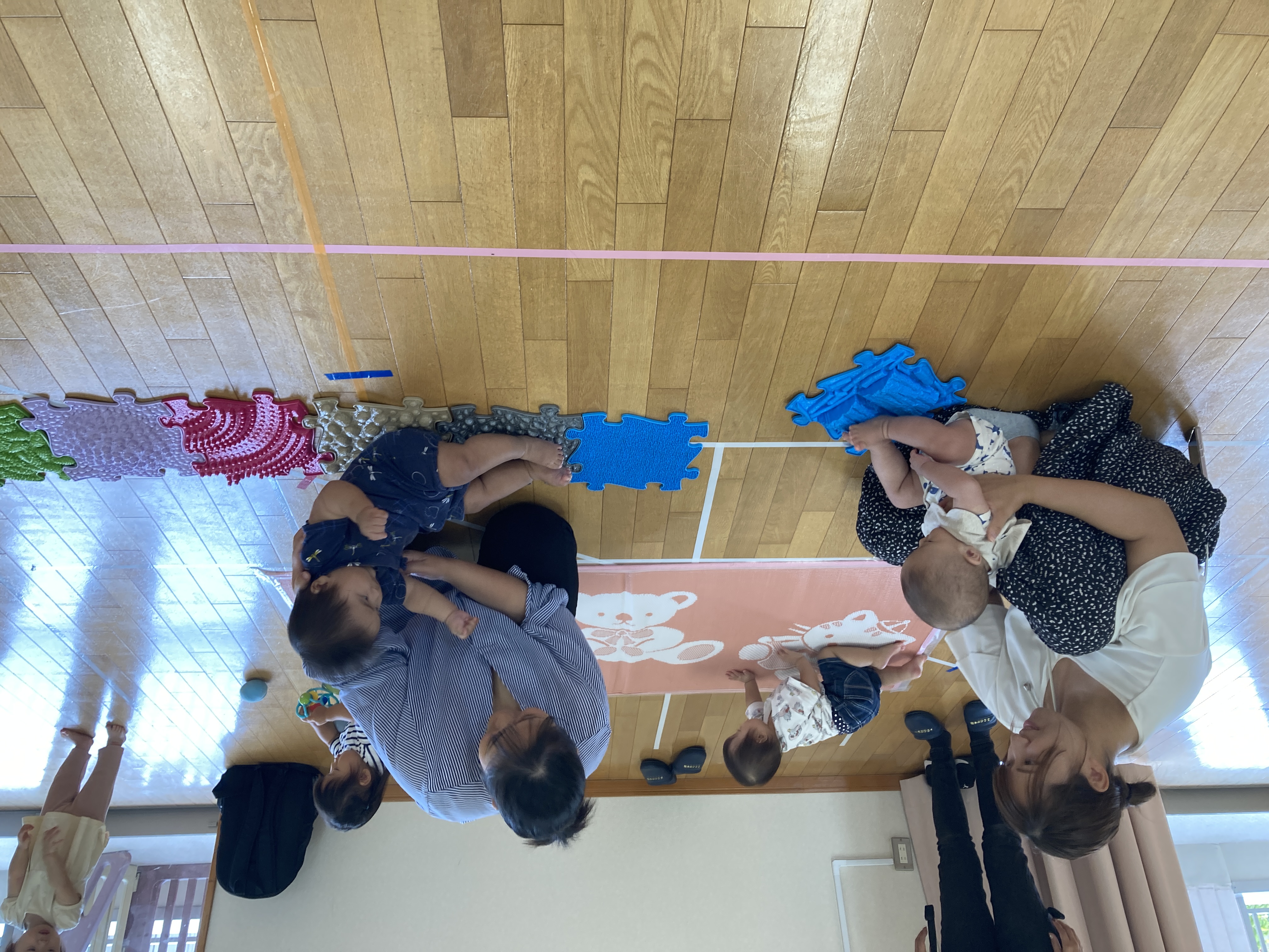 ホールで1歳児のお友達と一緒に保育園の遊びを体験しました。