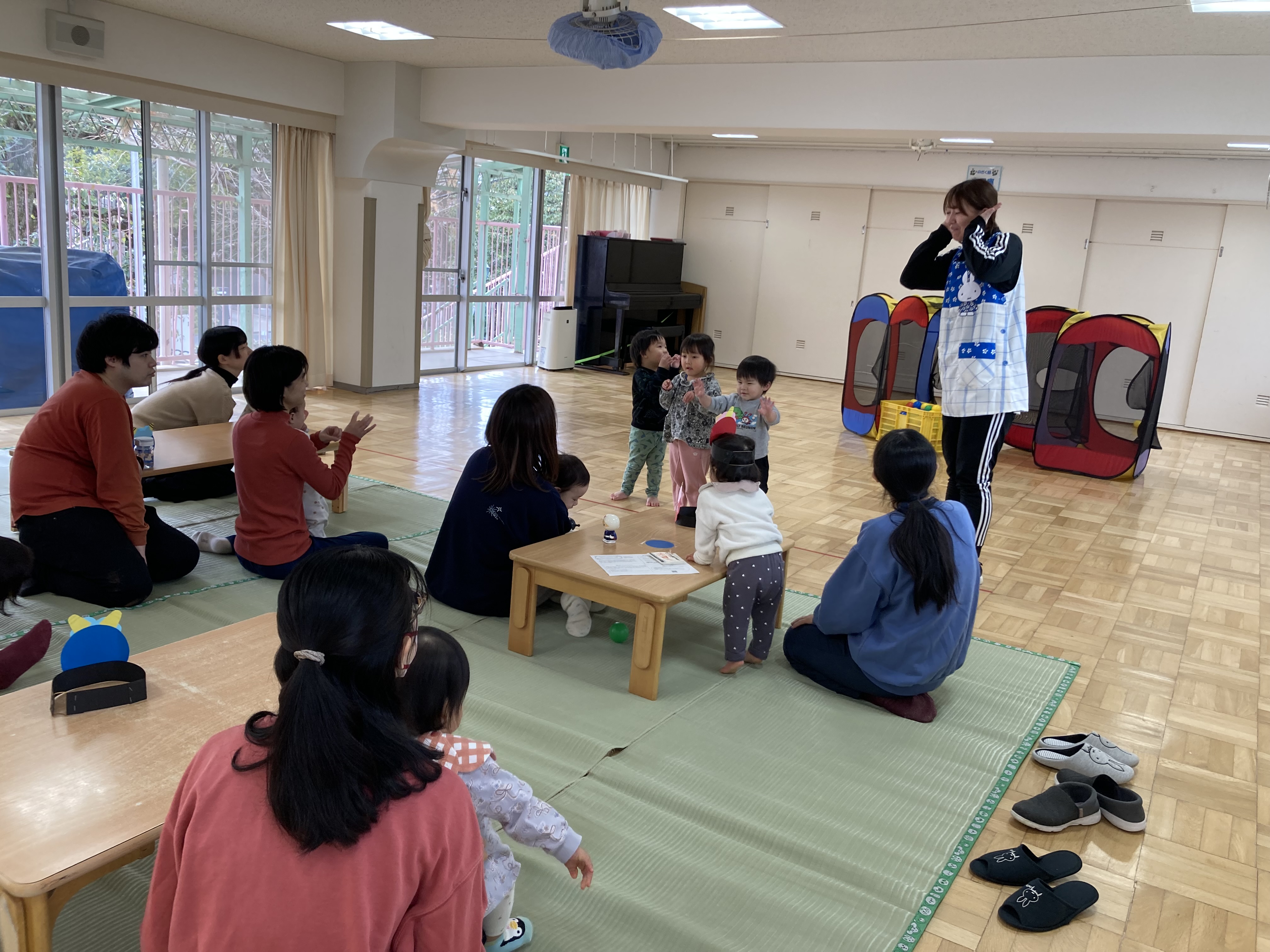 たくさん豆まきを楽しんだ後は、つくし組のお友だちと一緒に「豆まき」の手遊びをしました。