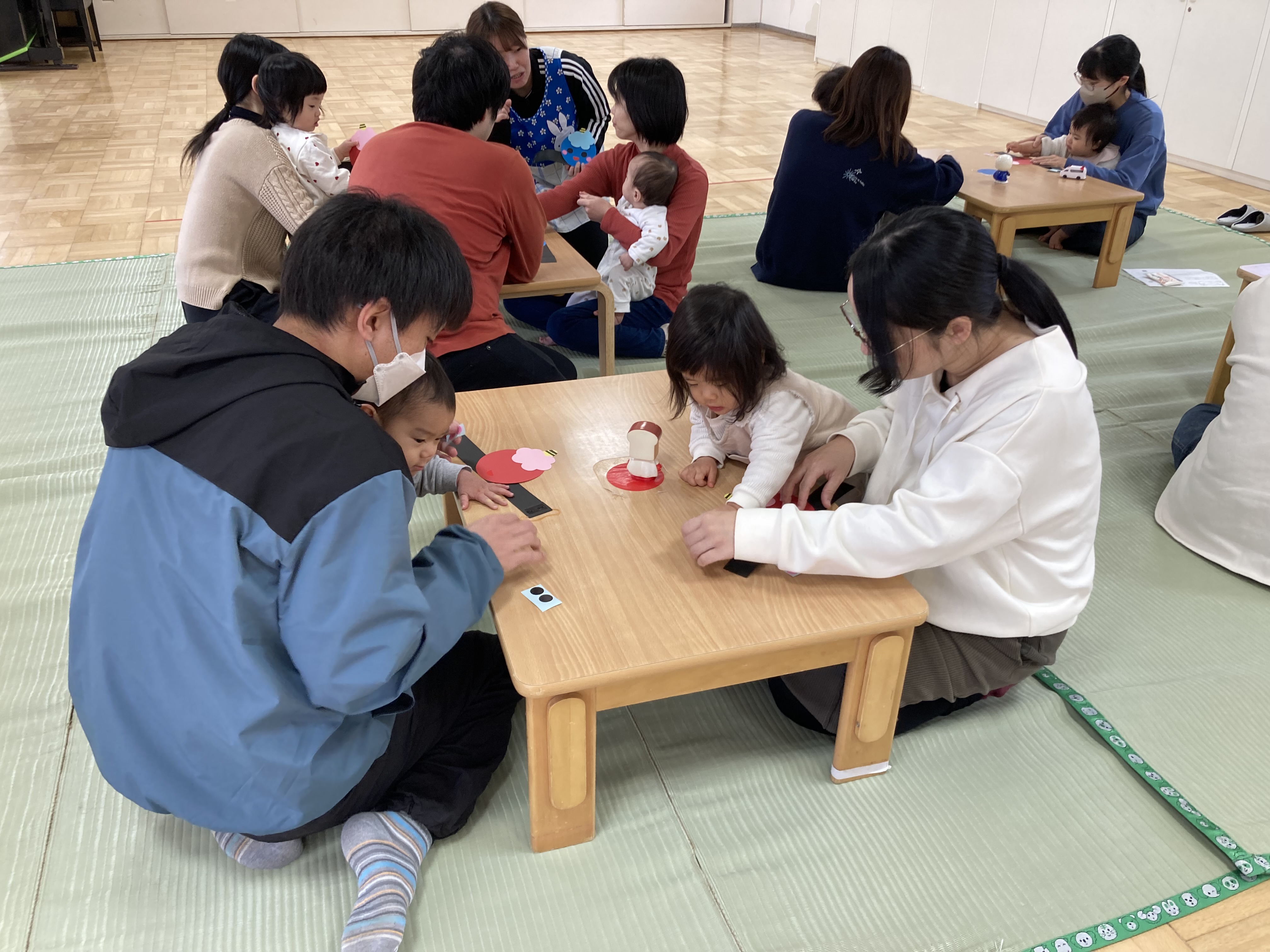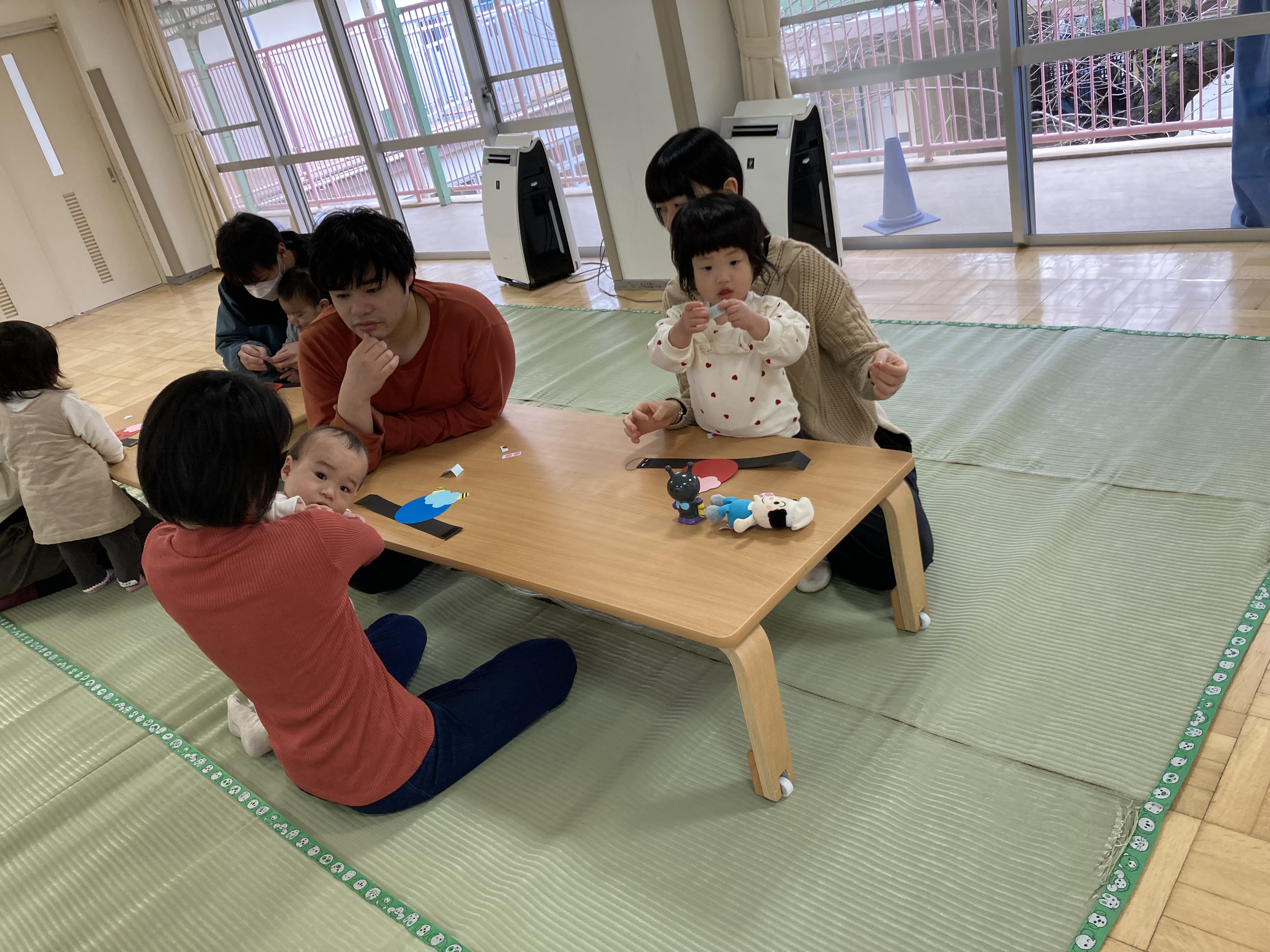 鬼のお面では、赤鬼と青鬼の2種類の好きな色を選んでそこに目と口、頬をシールで貼り、可愛いお面の出来上がり。シールのペタペタする感触を感じながら、お家の方と協力しながら製作する姿はすごく微笑ましかったです。