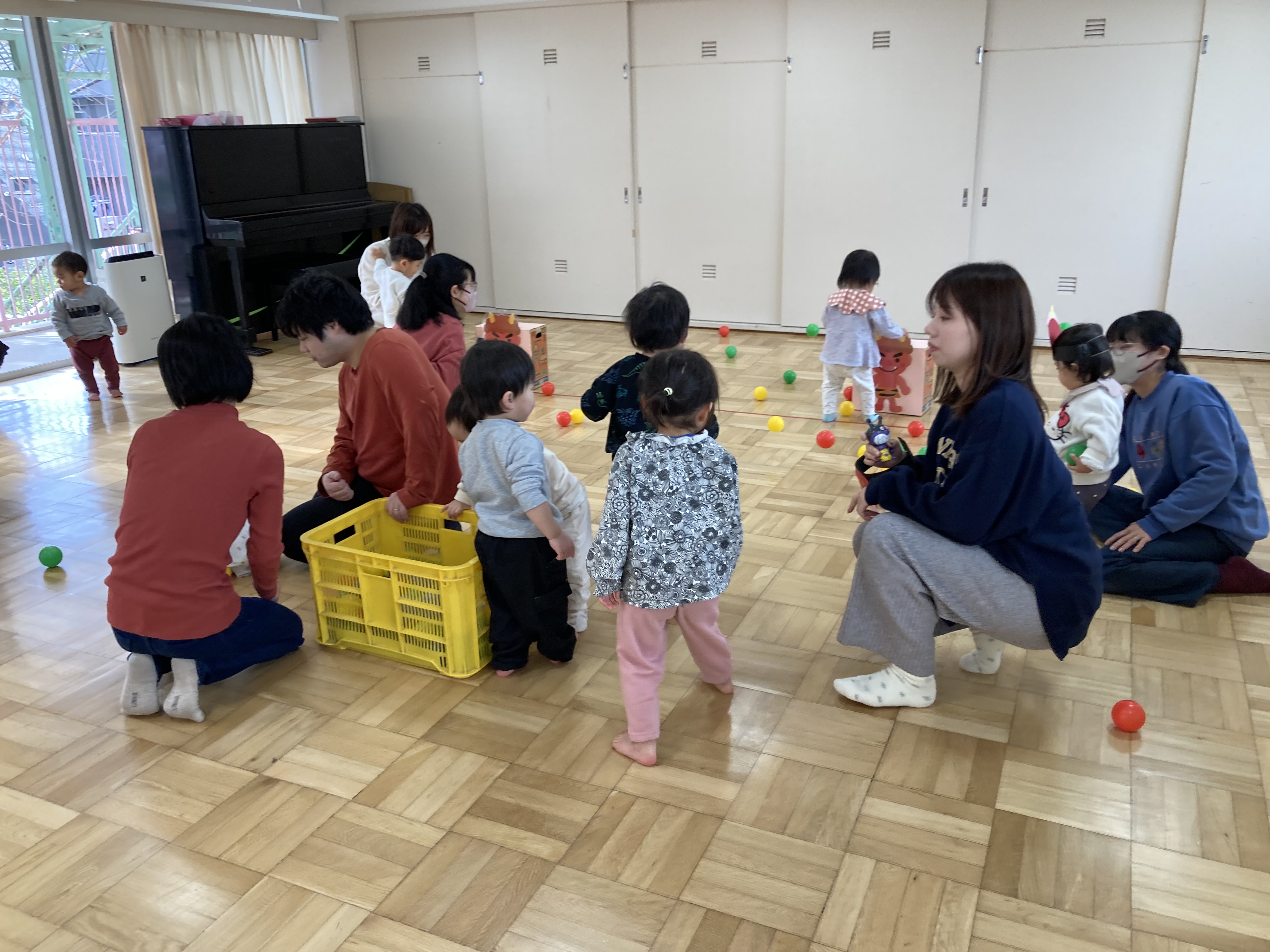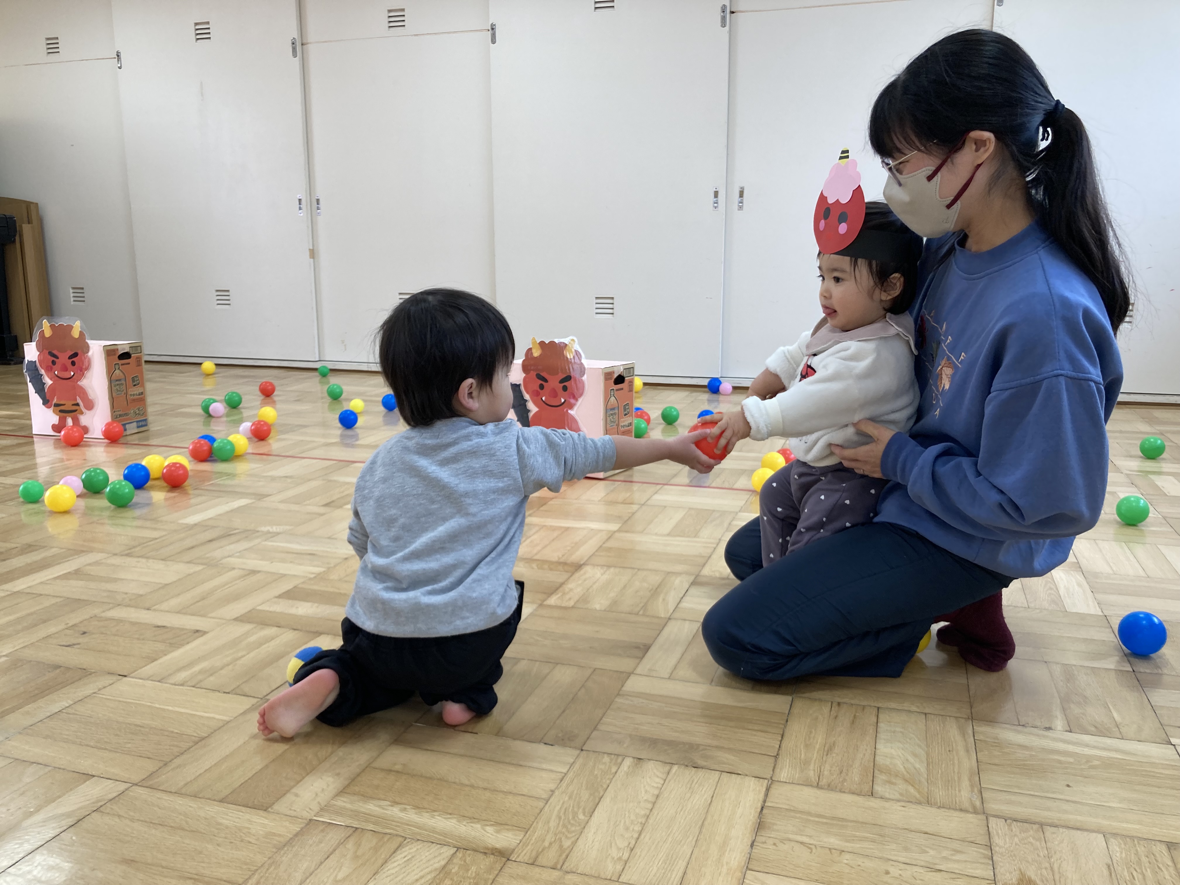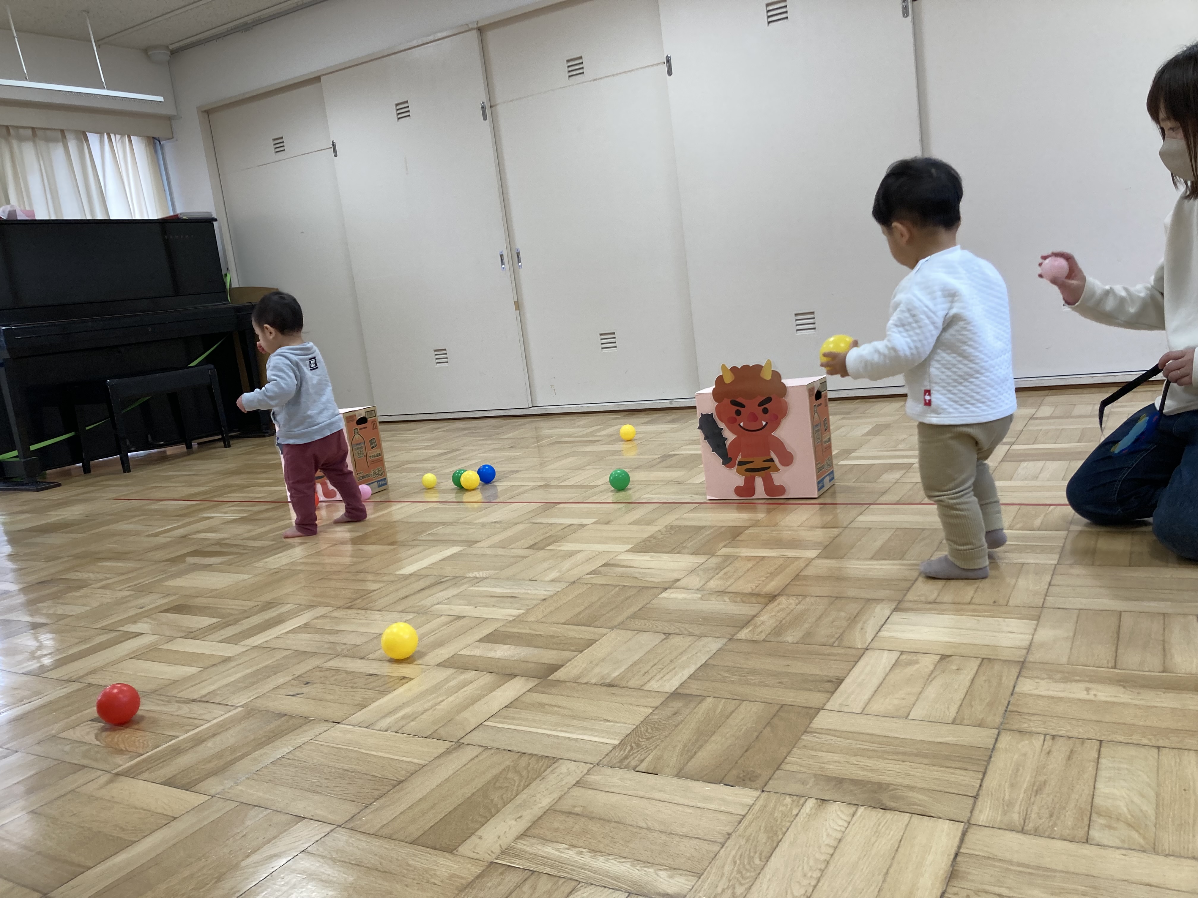 色とりどりのカラーボールに目を輝かせて鬼のパネル目掛けて投げるのをみんなで楽しみました。