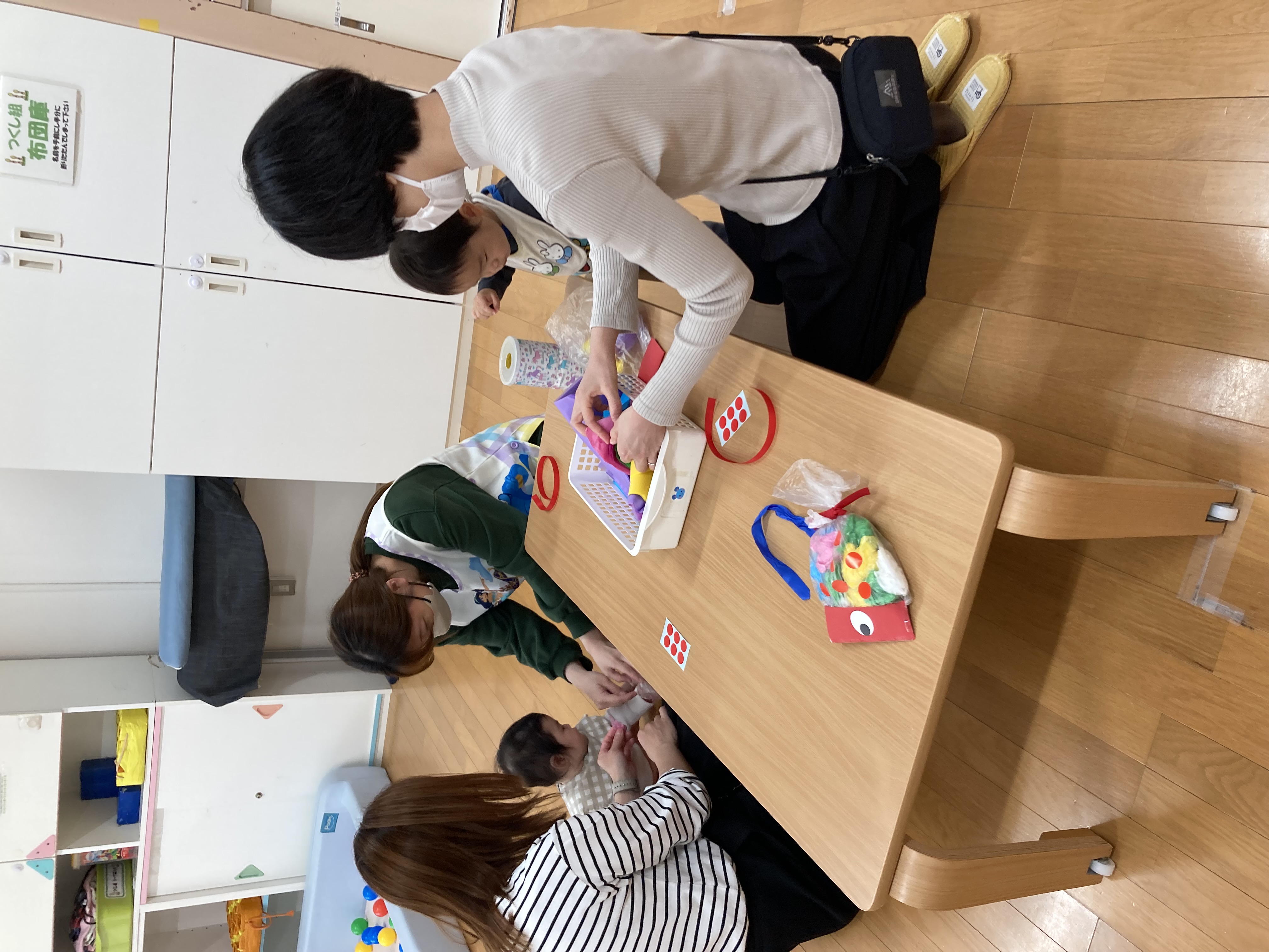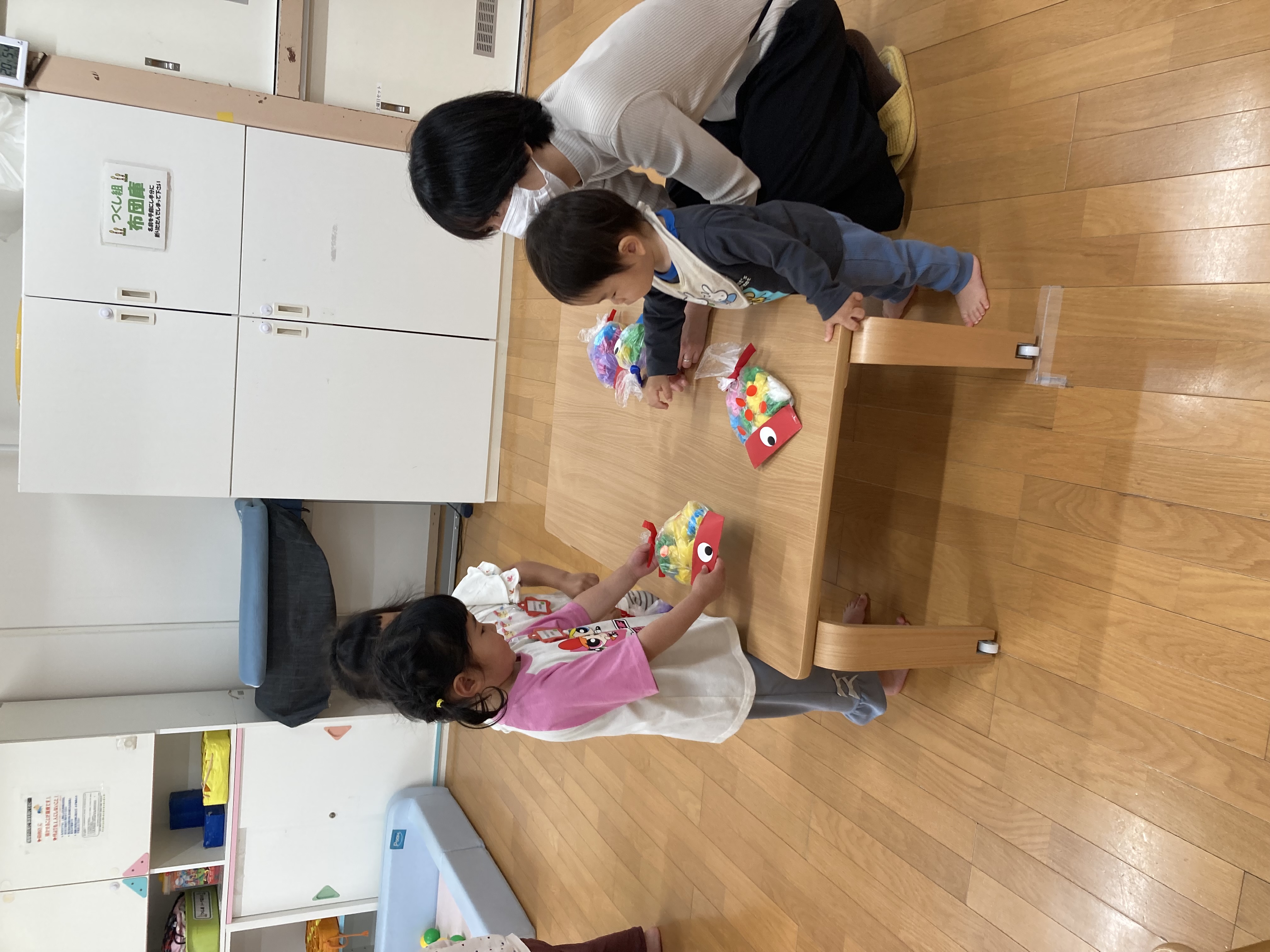 こいのぼりの製作では、お花紙をくるくる丸めたりちぎったりしました。ビニール袋にお花紙を入れることができると、保育士と大好きなママと両方から「できたね」パチパチと拍手をされて嬉しそうでした。