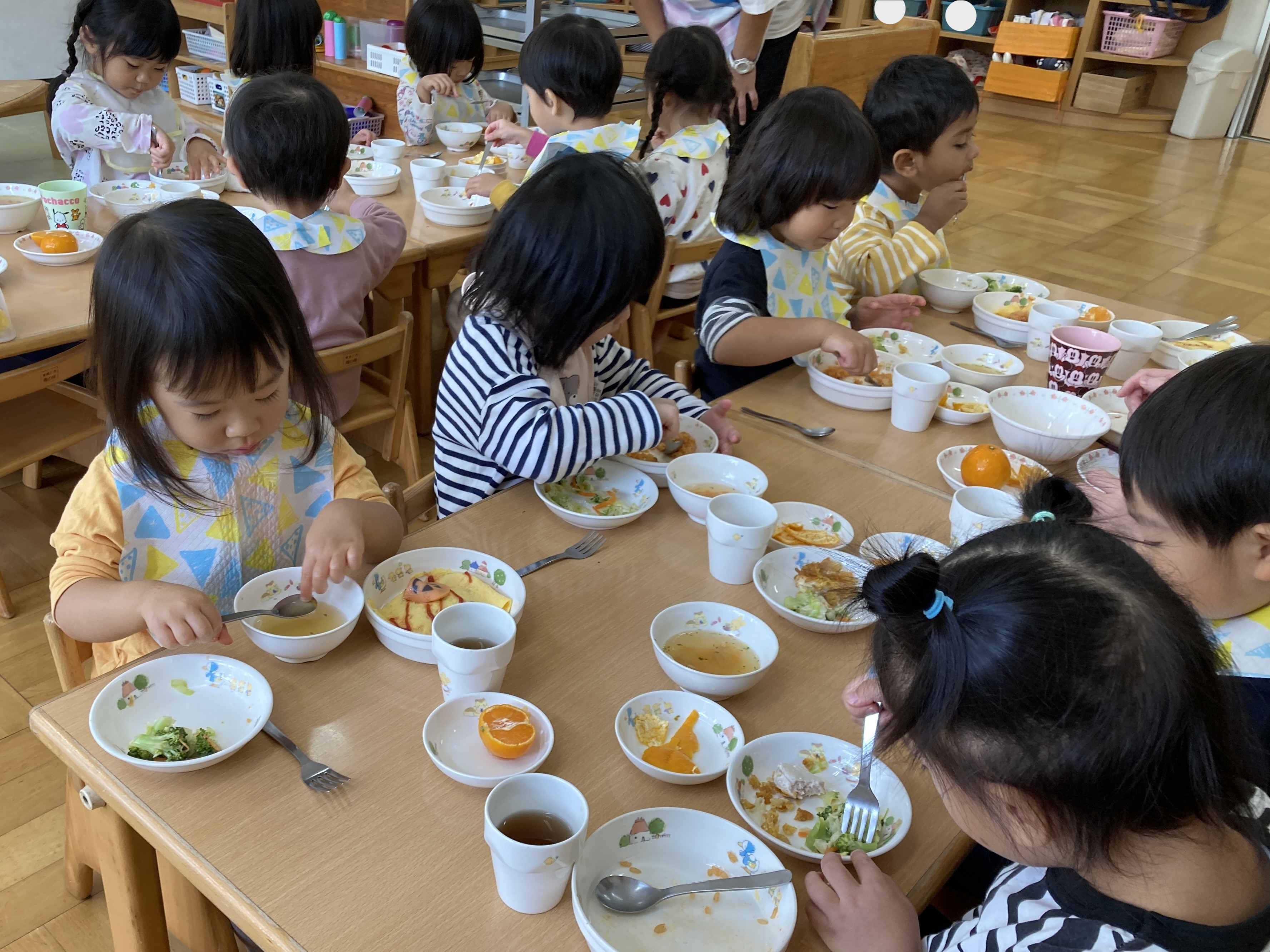 「オムライスだ!」と、みんなが大好きなオムライスに大喜び。