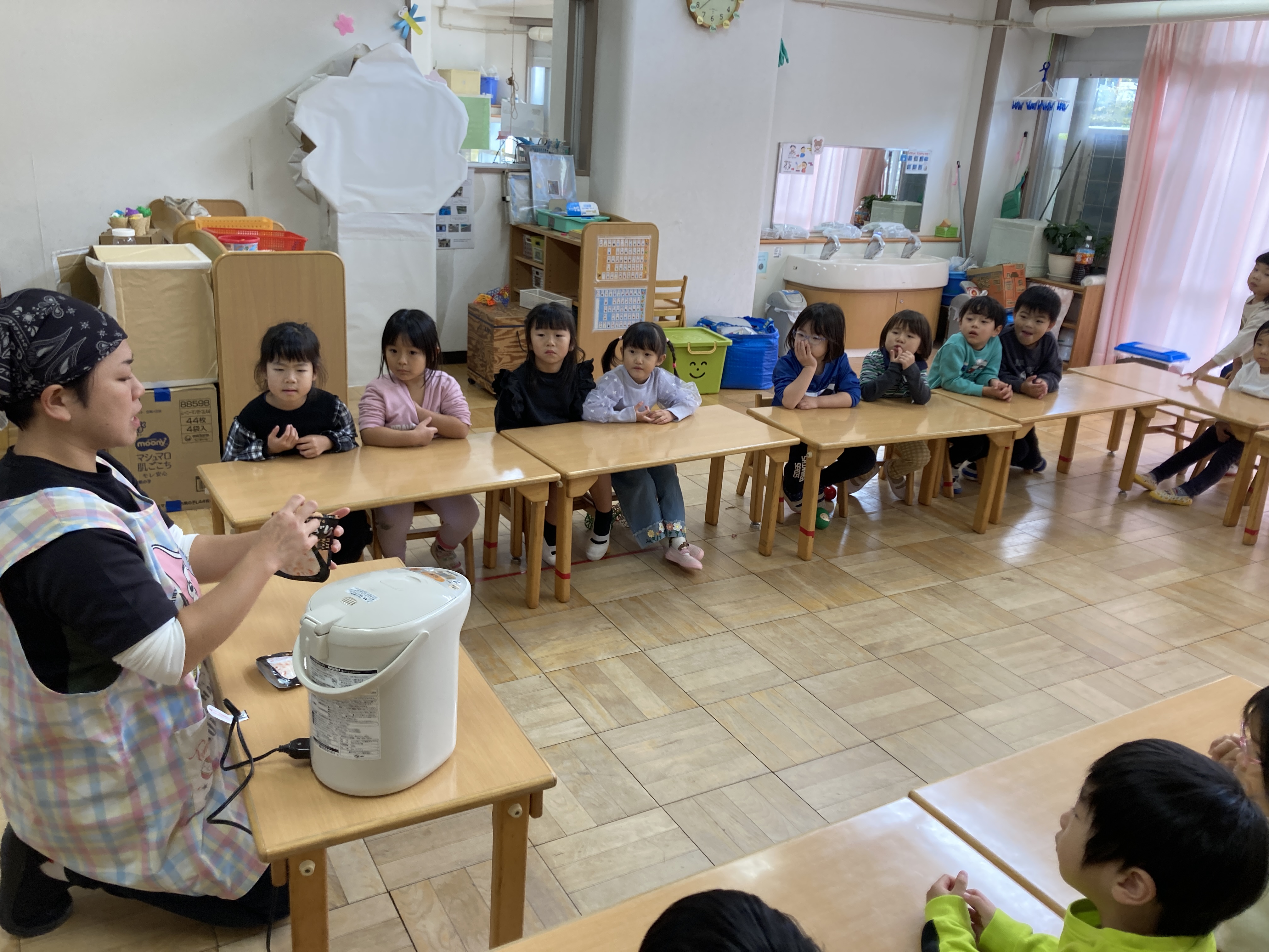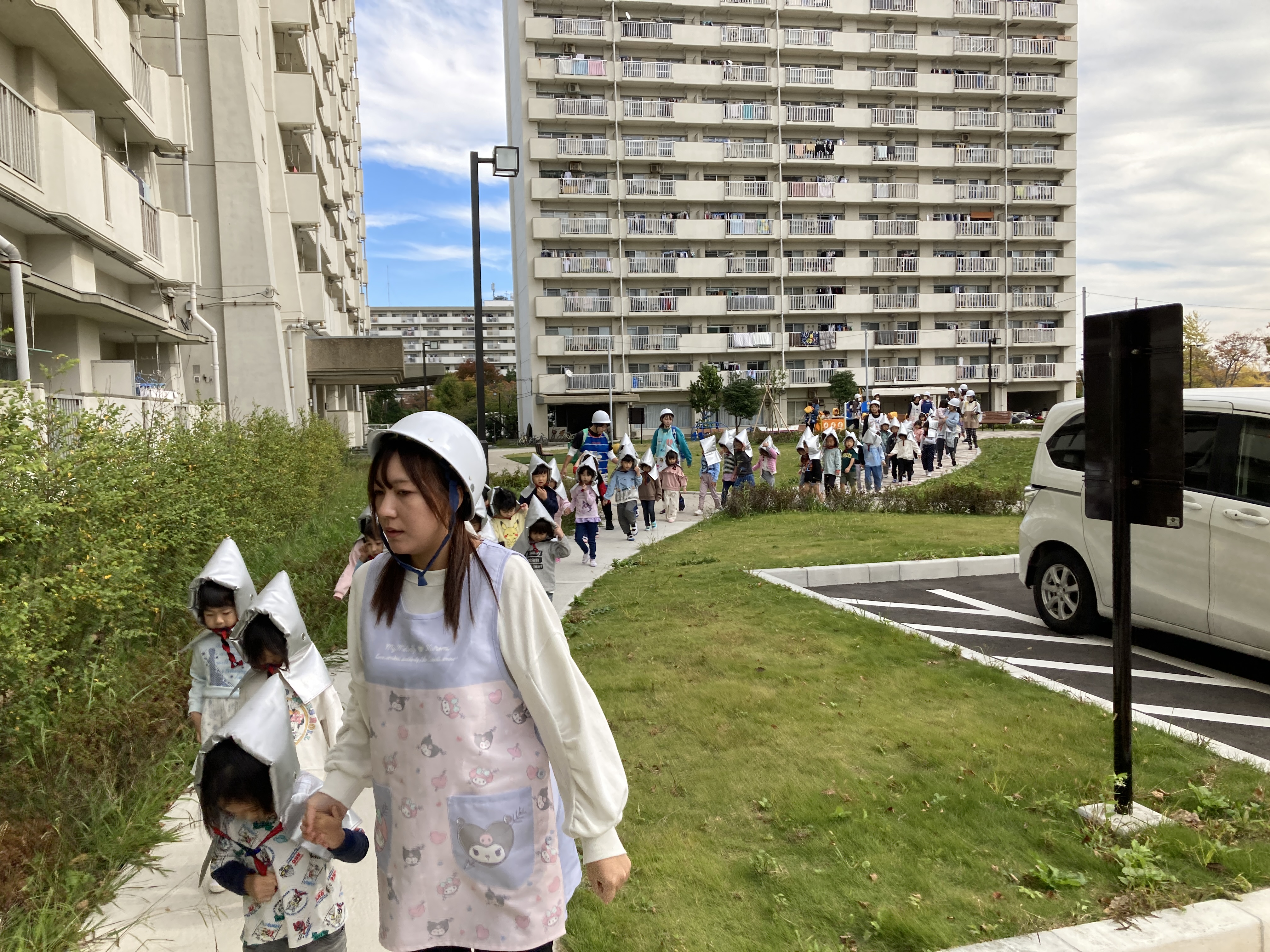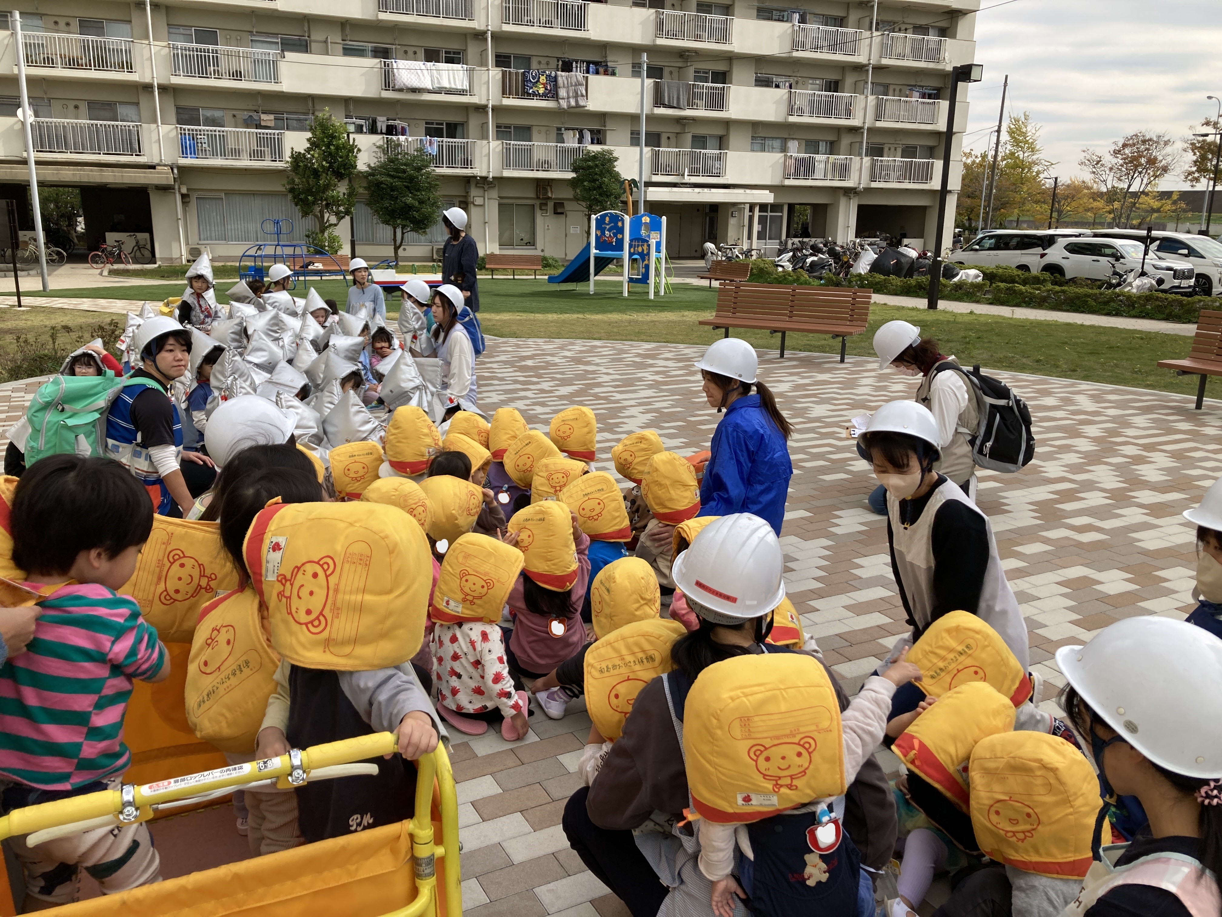 訓練は震度6の地震発生後園舎内で火災、ガラス破損を想定し、近隣の公園まで避難しました。