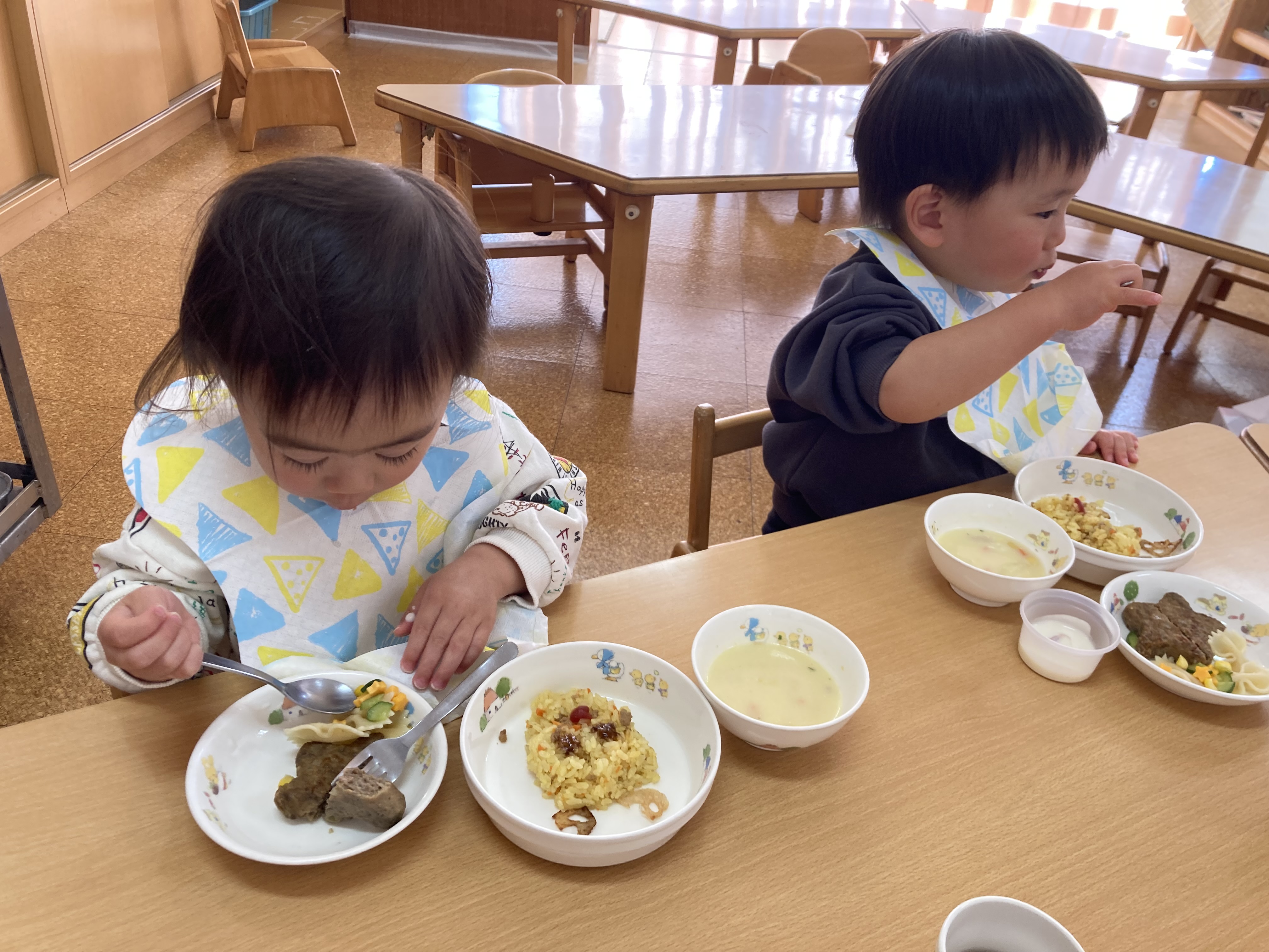 デザートにヨーグルトもあり、イチゴのソースもトッピングされていたので「いちごの味がする」ととても嬉しそうに食べている姿にほっこりしました。