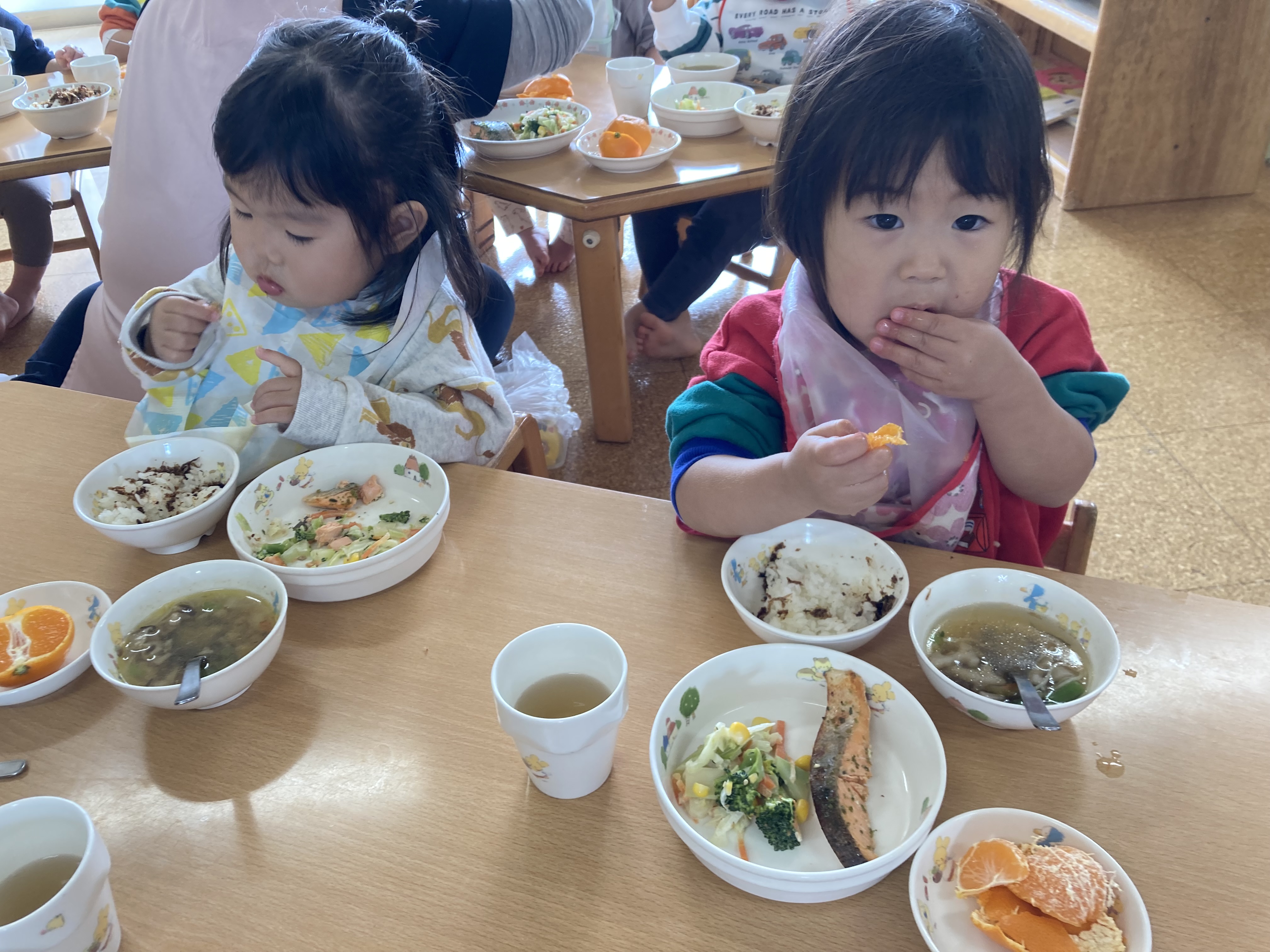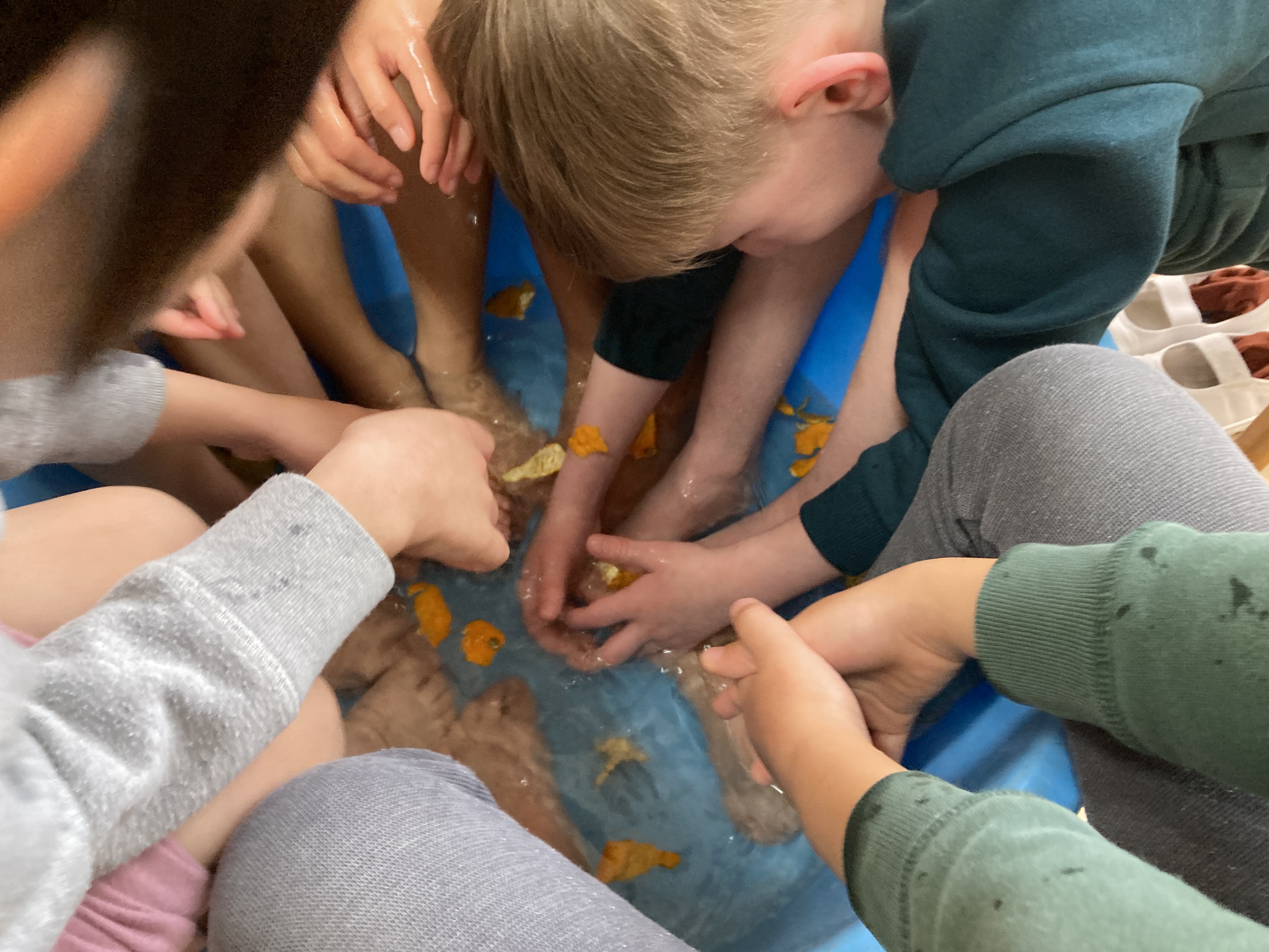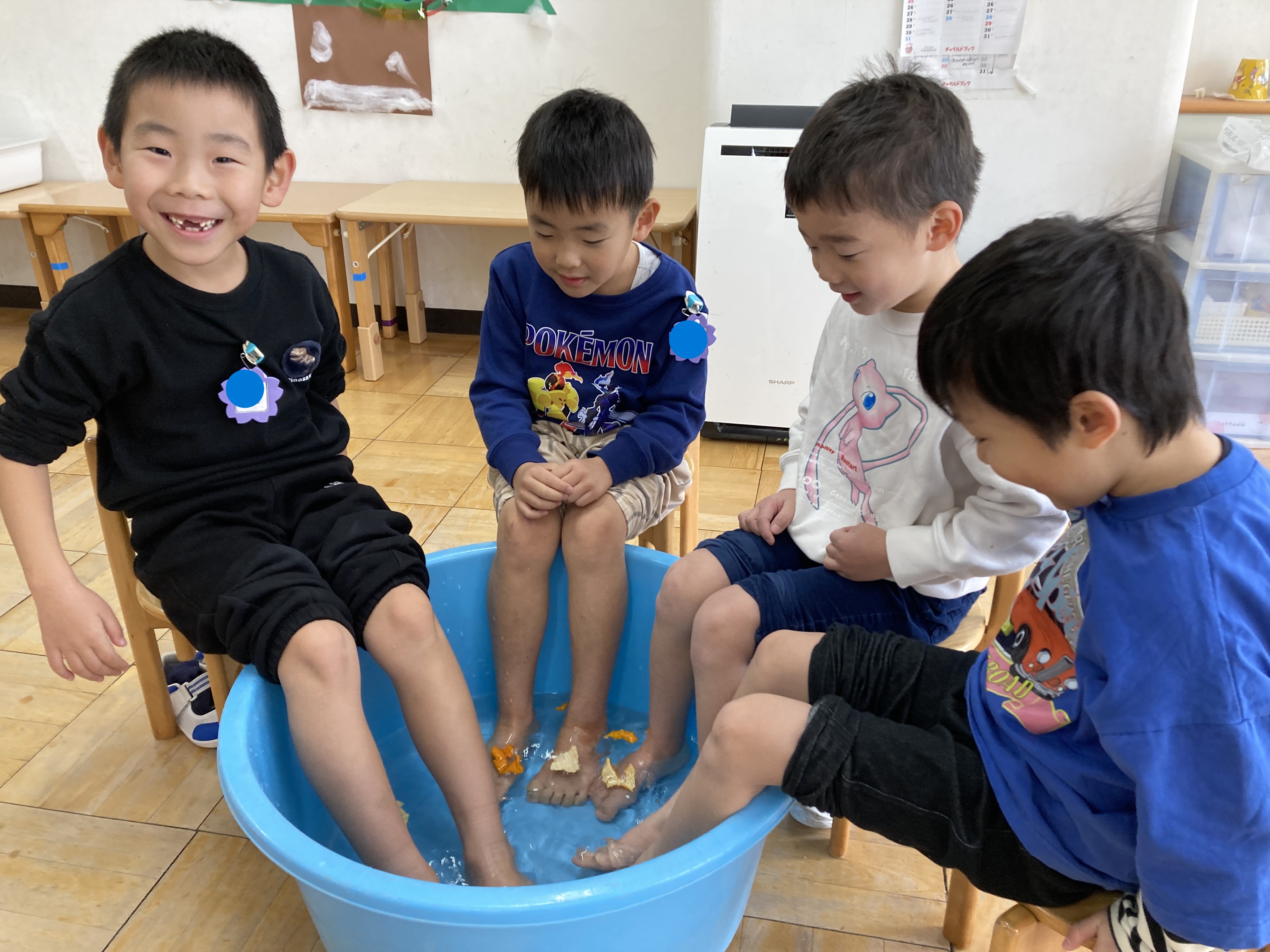 ひまわり組では足湯をして体を温めました。干して乾燥させていたみかんの皮をお湯に浮かべ、香りも感じながら楽しみました。「体がポカポカしてきた」「みかんの匂いがする」と楽しんでいた子ども達です。