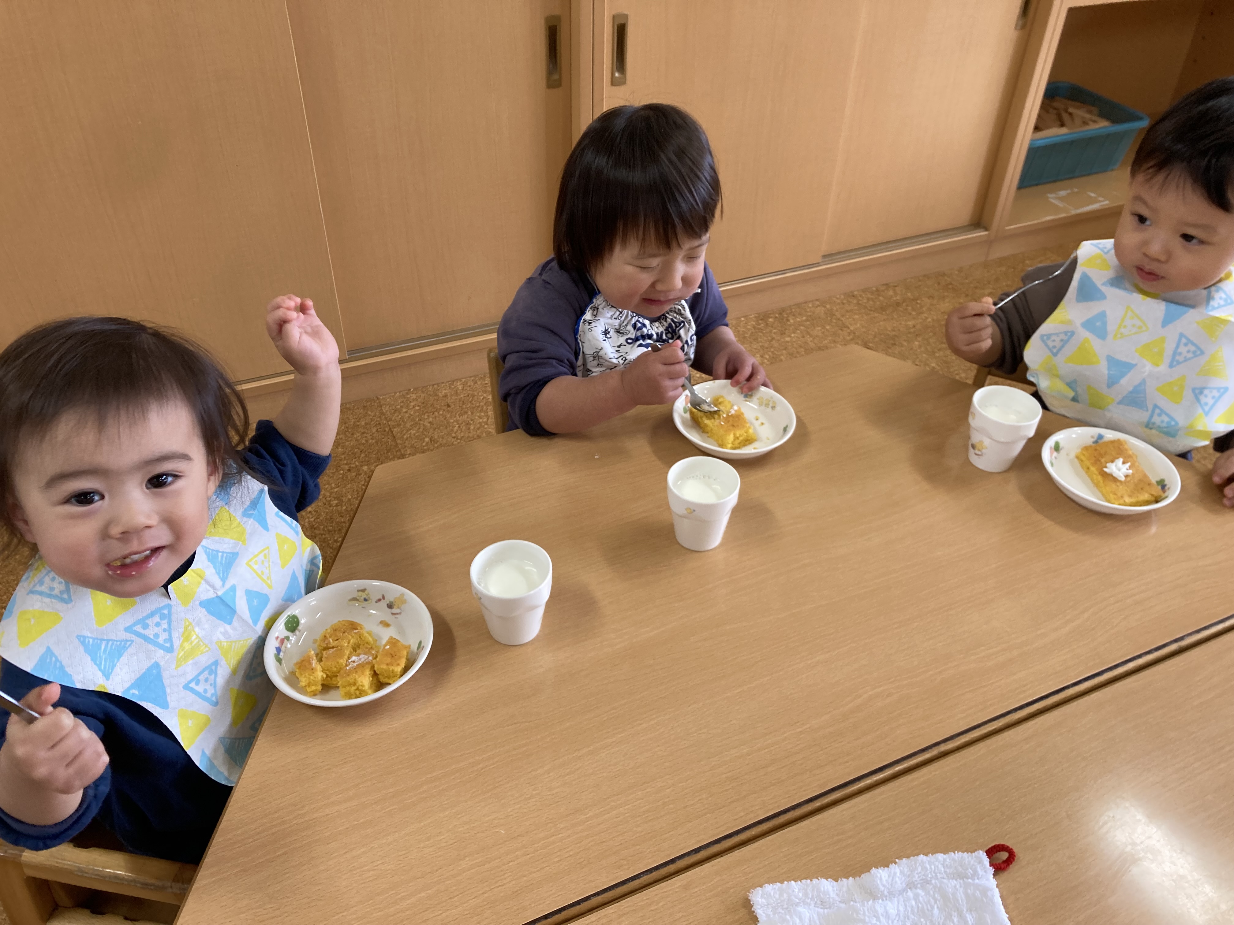おやつはかぼちゃケーキです。かぼちゃは別名南瓜で「なんきん」と読みますが、これも「ん」のつく食材で運が巡ってきますね。