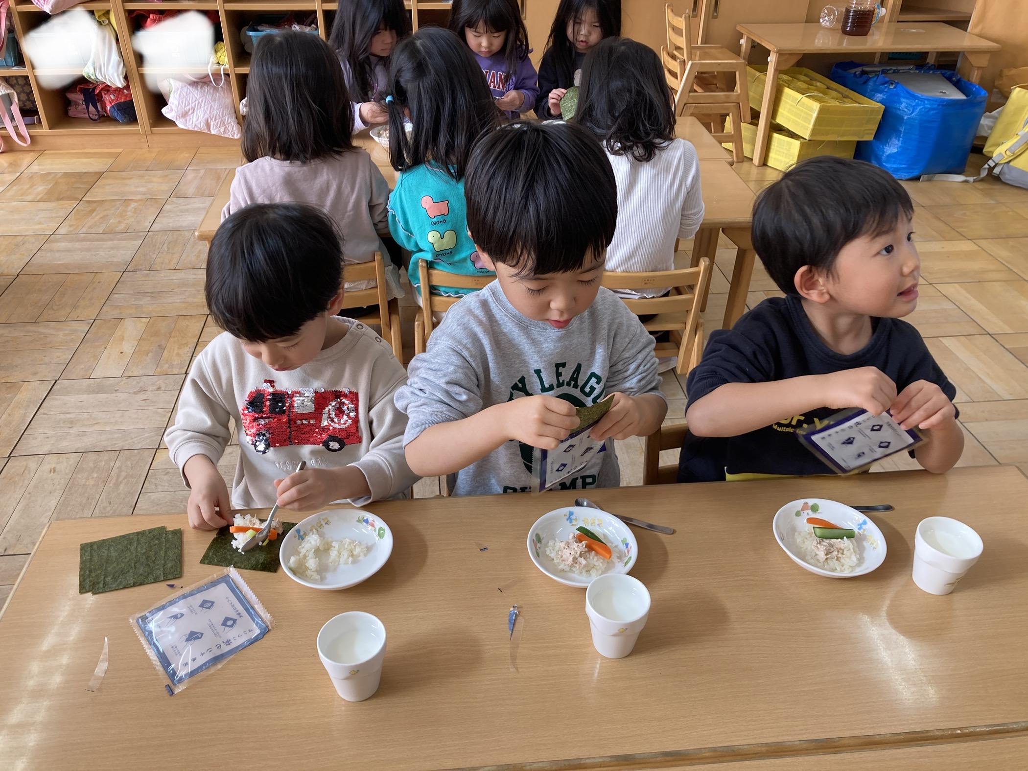 真剣な表情で具材をのせたり、巻いたり…