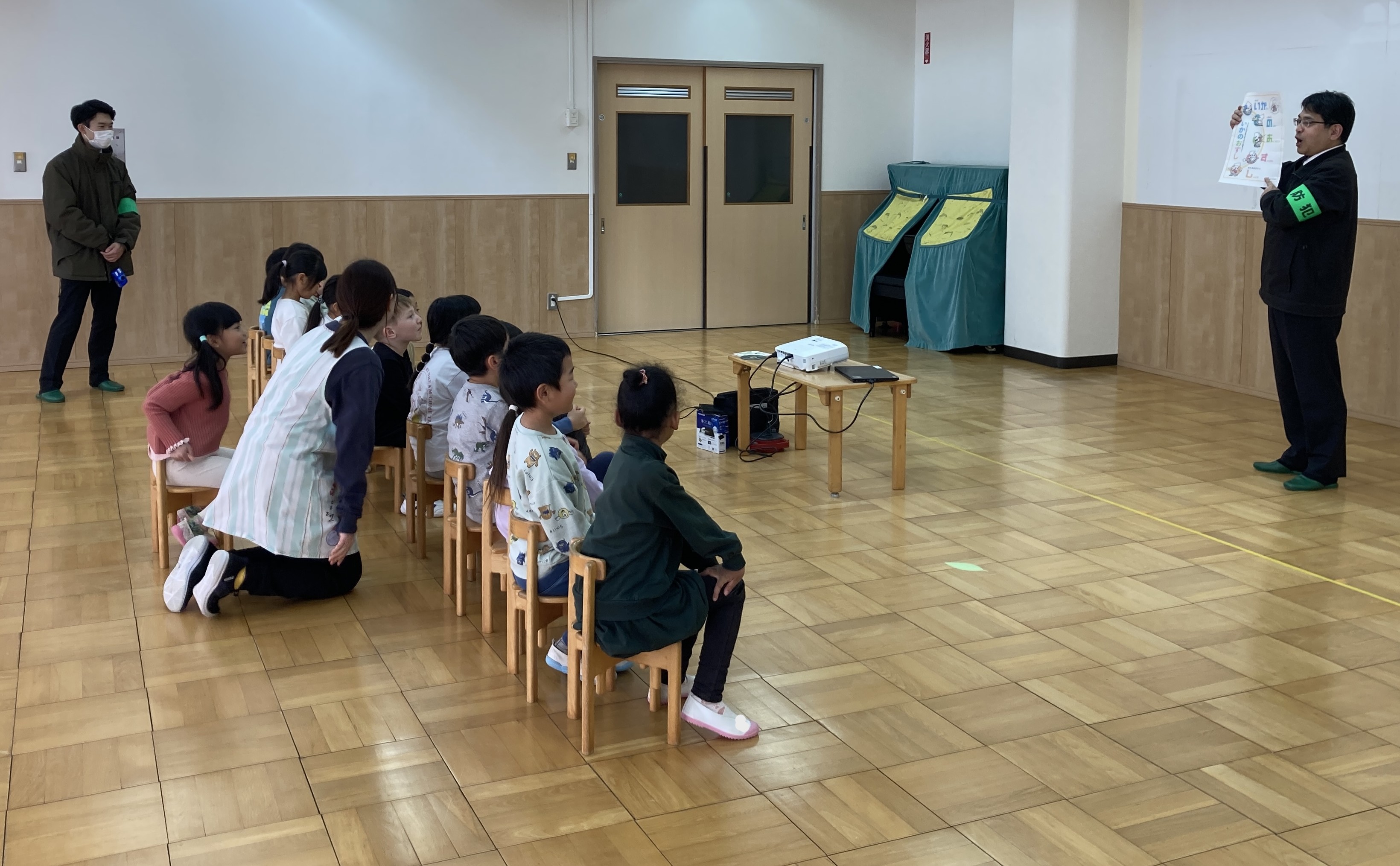 年長児クラスでは、「知らない人についてかない」のお話を観た後に、警察の方に話を聞き知らない人にこえをかけられたら?もし連れていかれそうになったらどうしたらいいのか?を教えてもらいました。大切なことは「い・か・の・お・す・し」