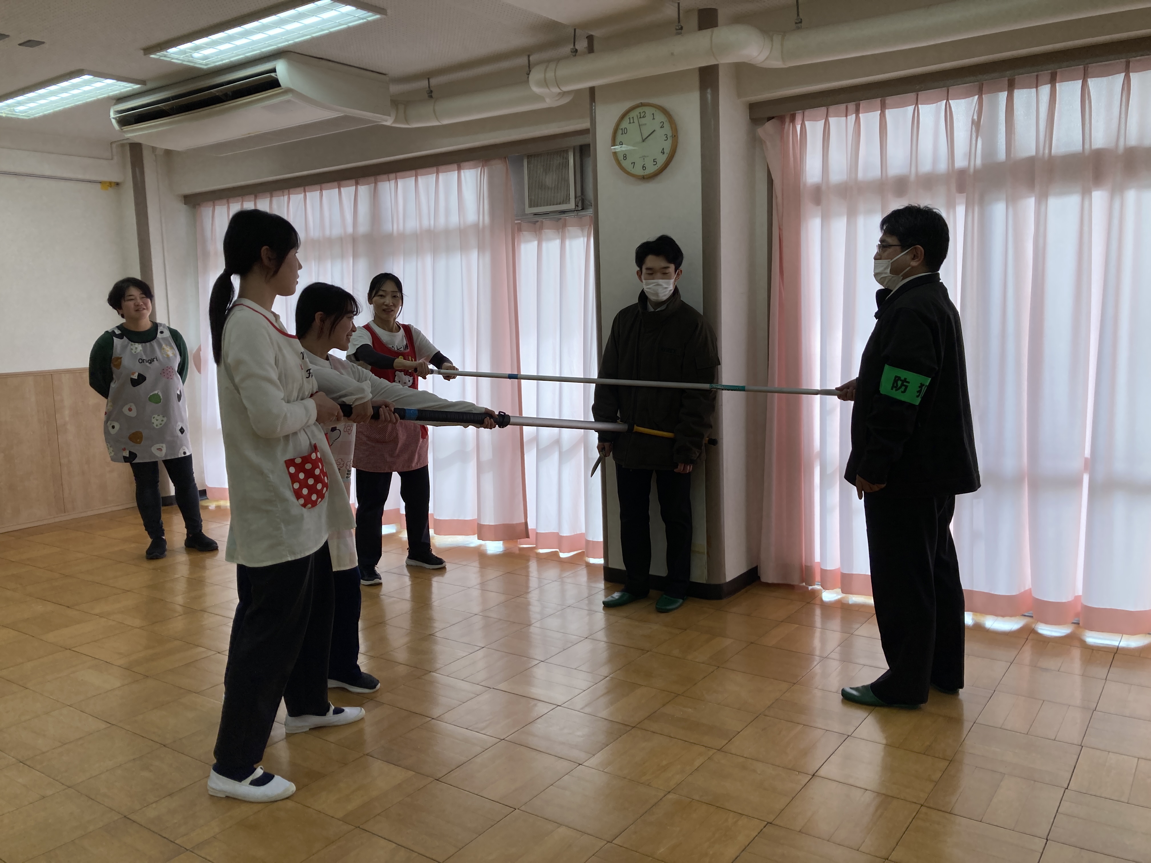 その後は職員向けの訓練として、知らない人が保育園に入ってきたときの想定でどうやって対応するのか?さすまたの使い方も実践的に教えてもらいながら訓練を行いました。