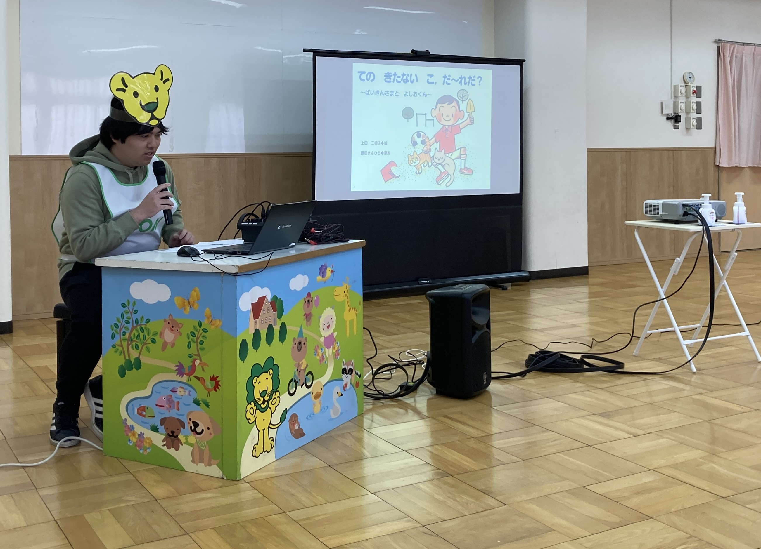 紙芝居「てのきたないこ だーれだ?」のお話を聞き、手を洗わないとお腹にばい菌が入ってしまう事を教えてもらい、手をきれいにする大切さを知りました。