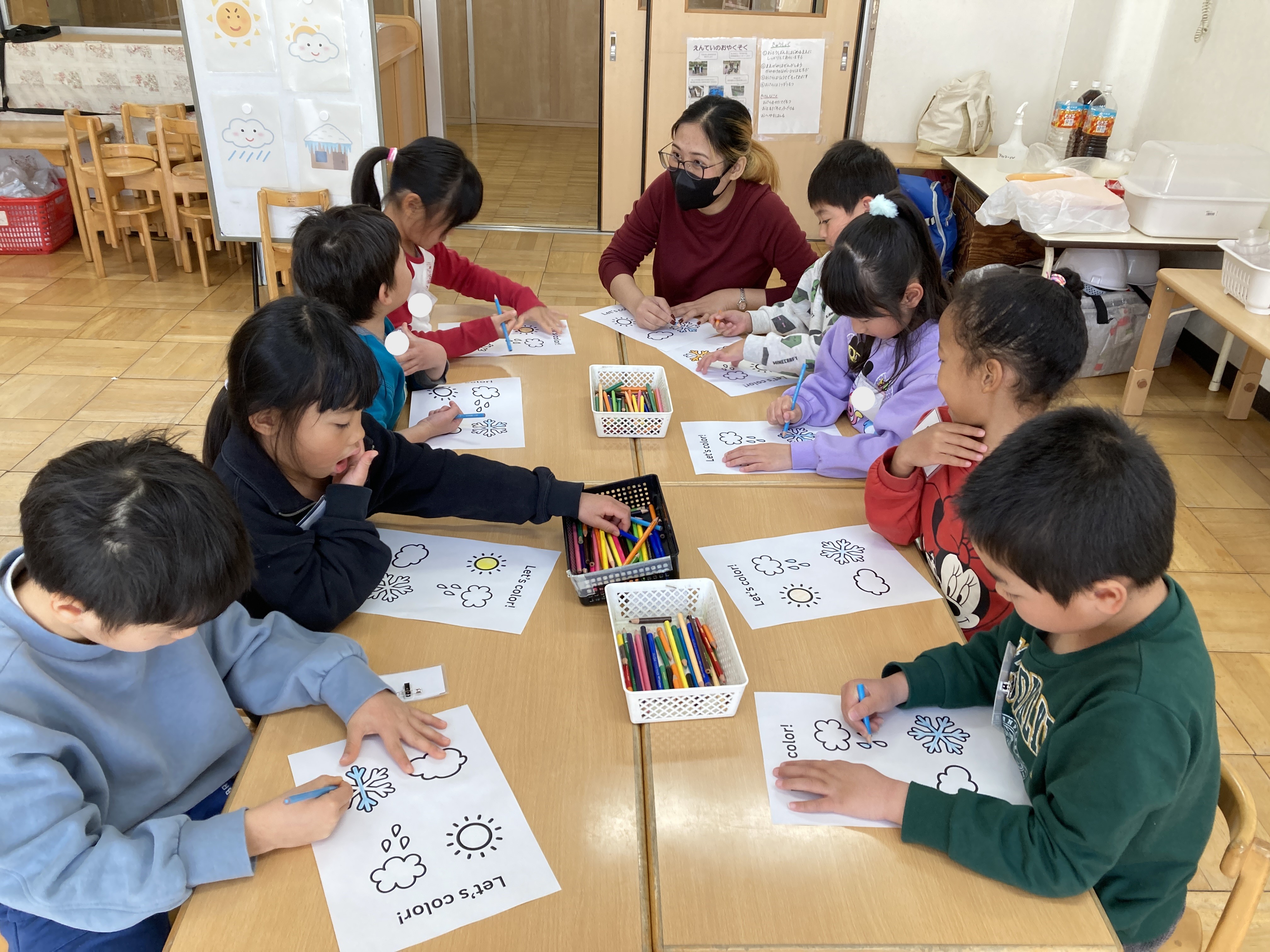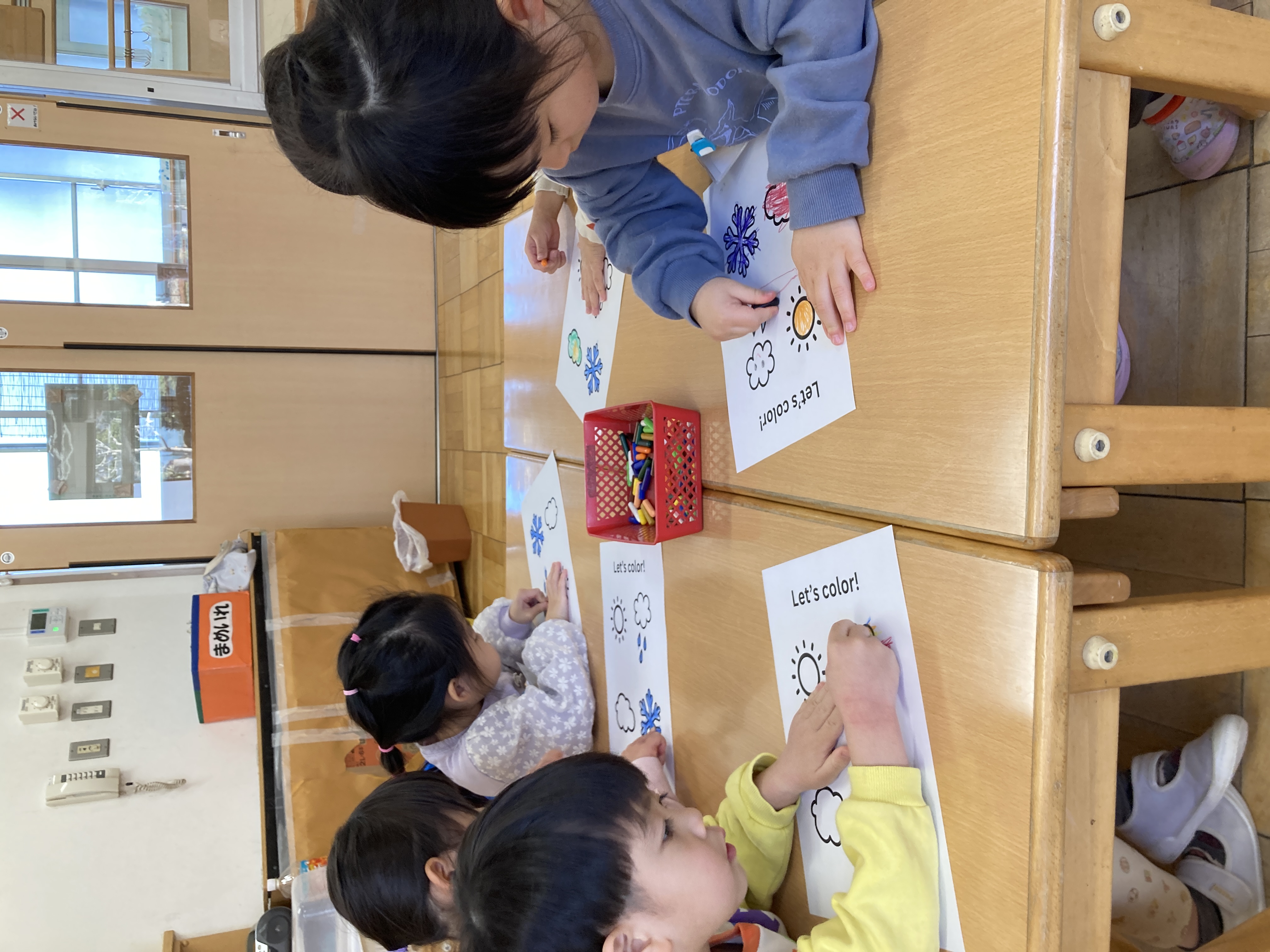 今日はすみれ組、あさがお組、ひまわり組で英語あそびがありました。
