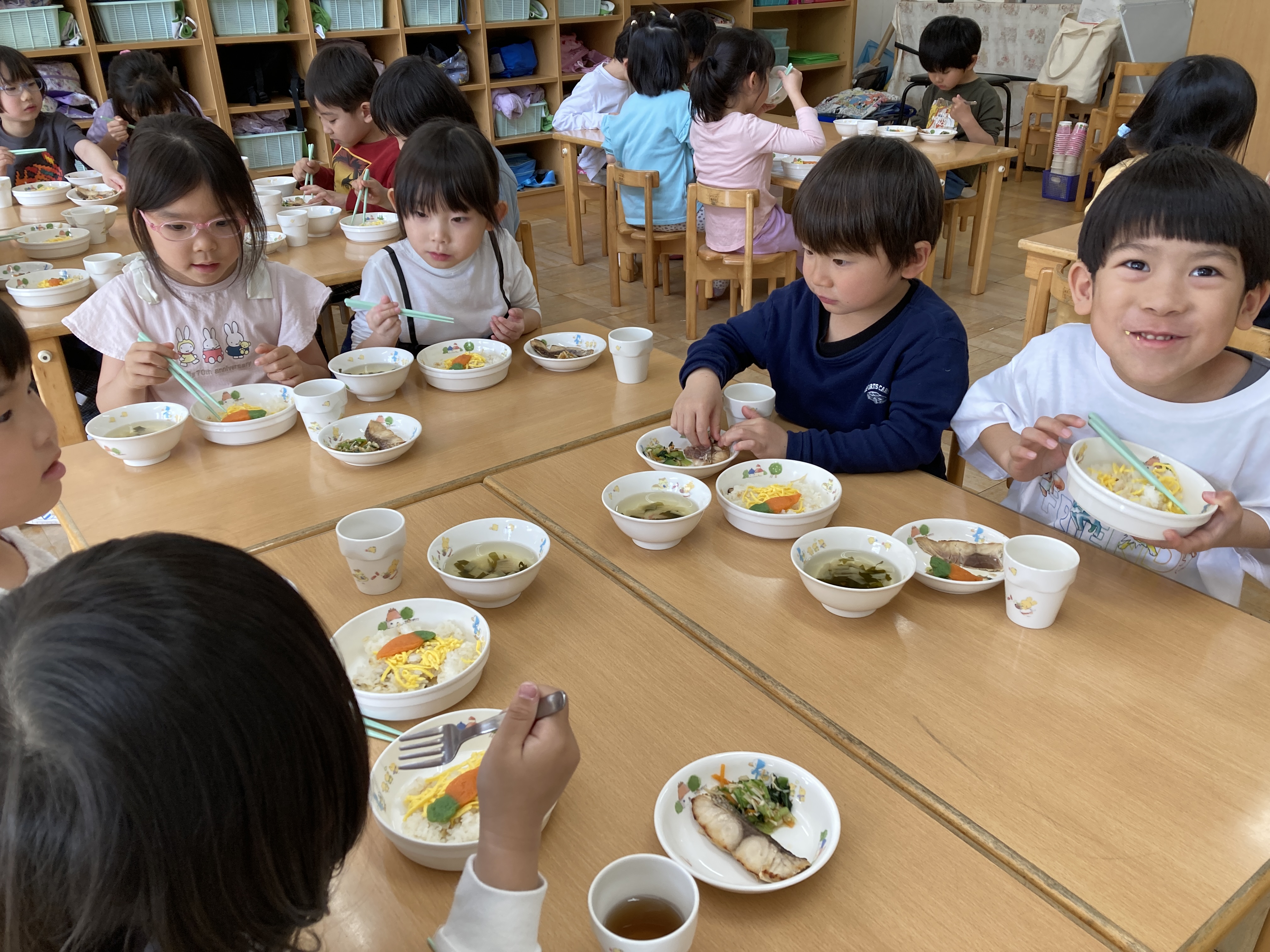子どもたちに「春色ごはん食べよう!」とお話をすると「やった~」と喜んでいました。