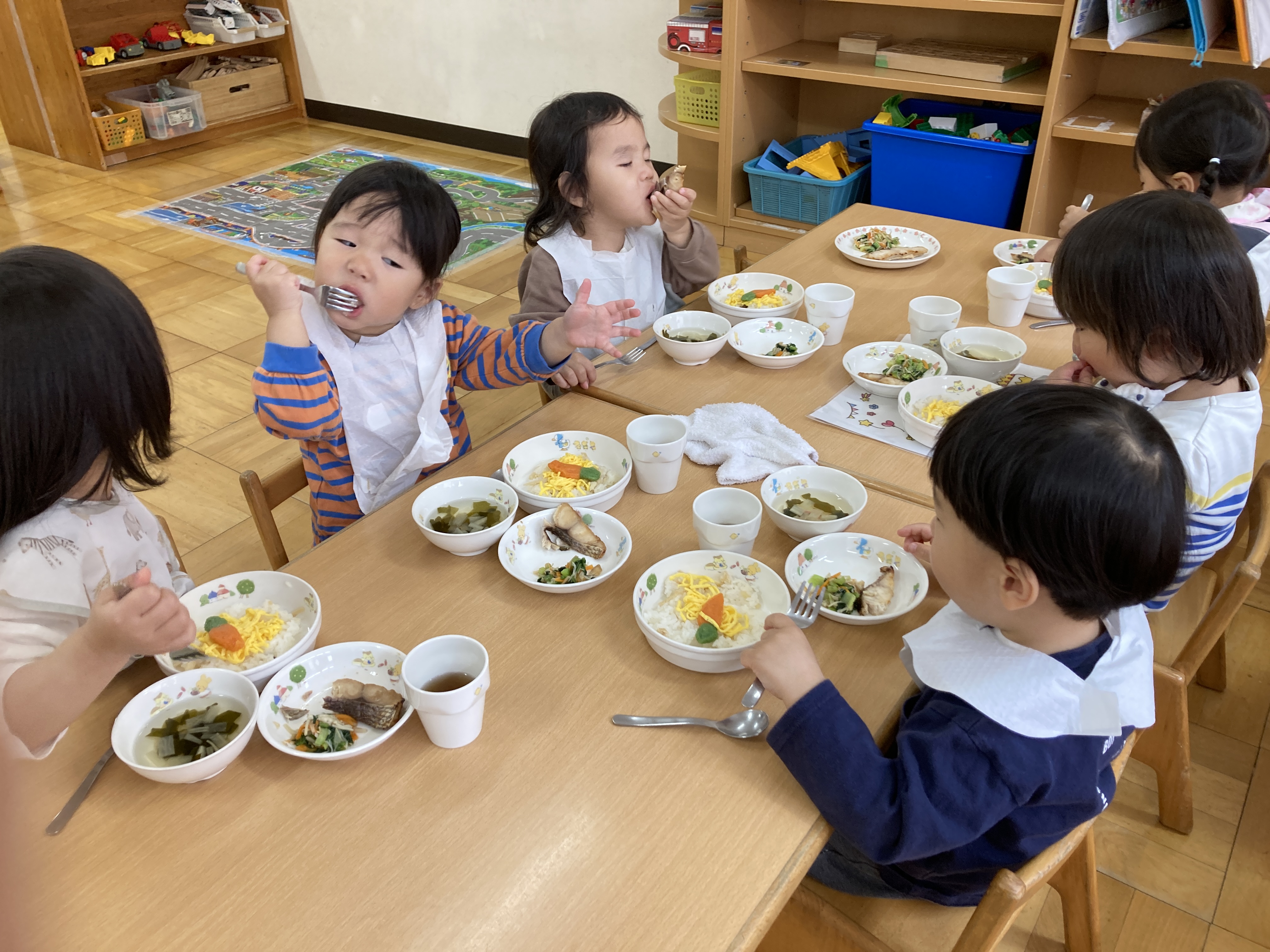 テーブルにご飯が配られると「可愛い~」「にんじんあるね~」など友だちと会話を楽しみながら