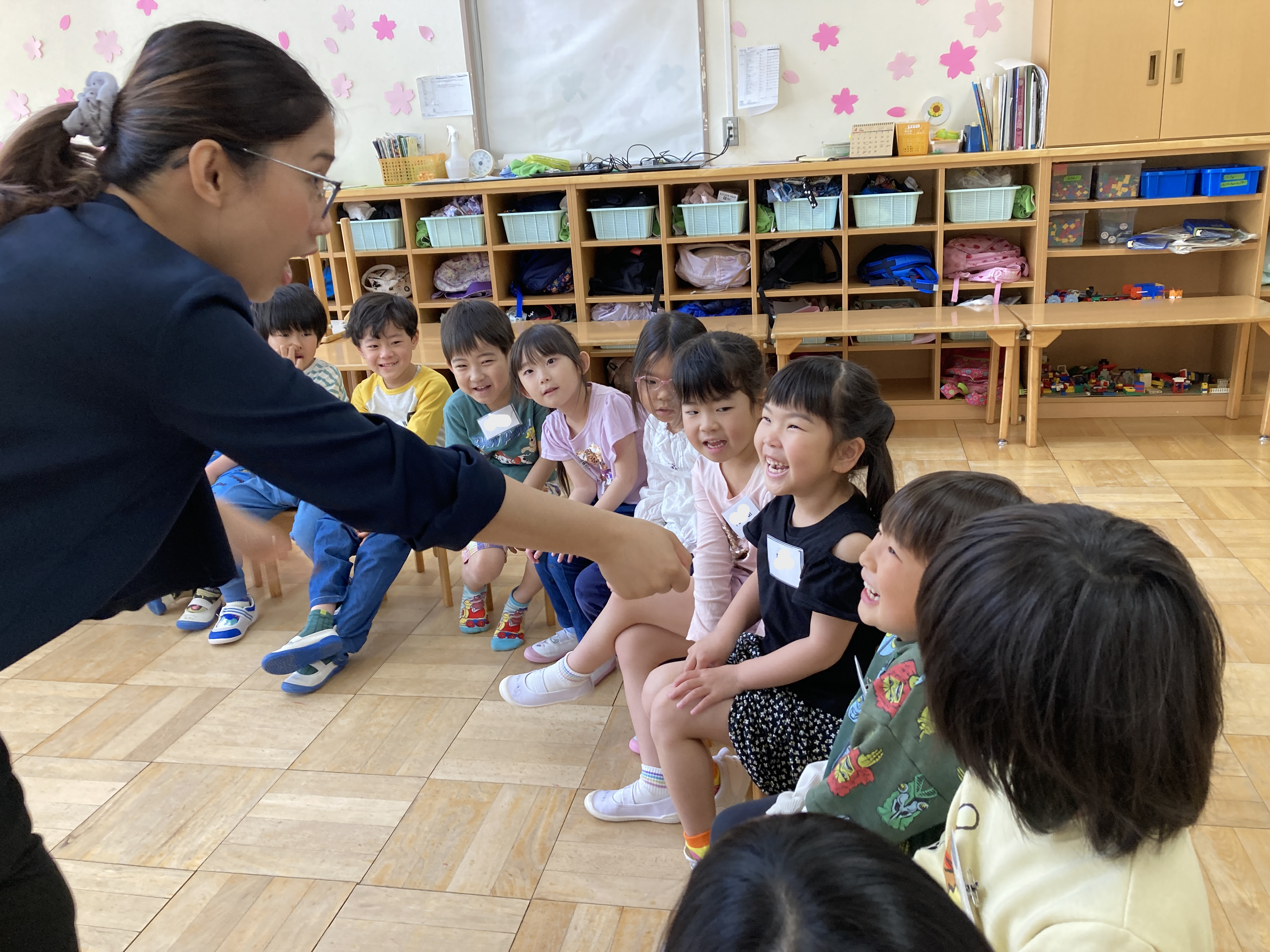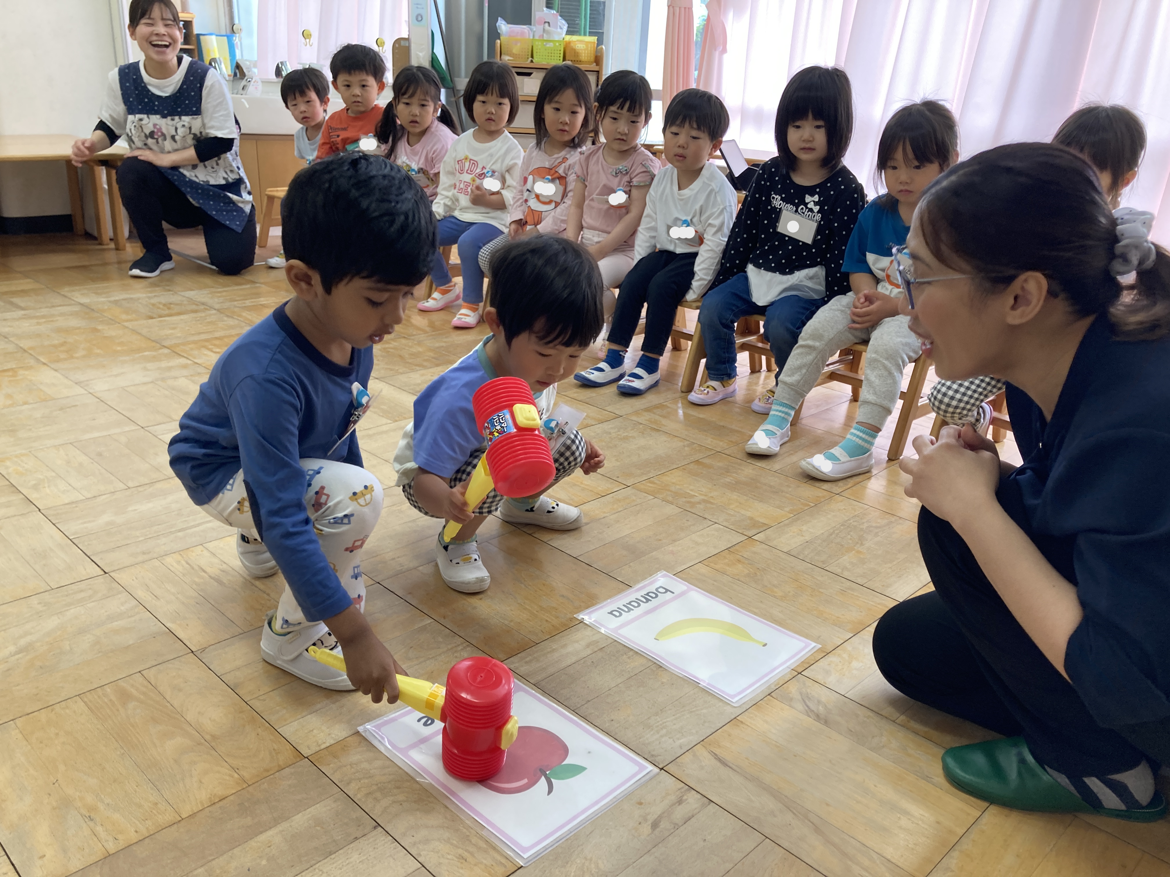 今日は「My name is ○○」と自分の名前を言ったり、果物の名前を教えてもらったりしました。