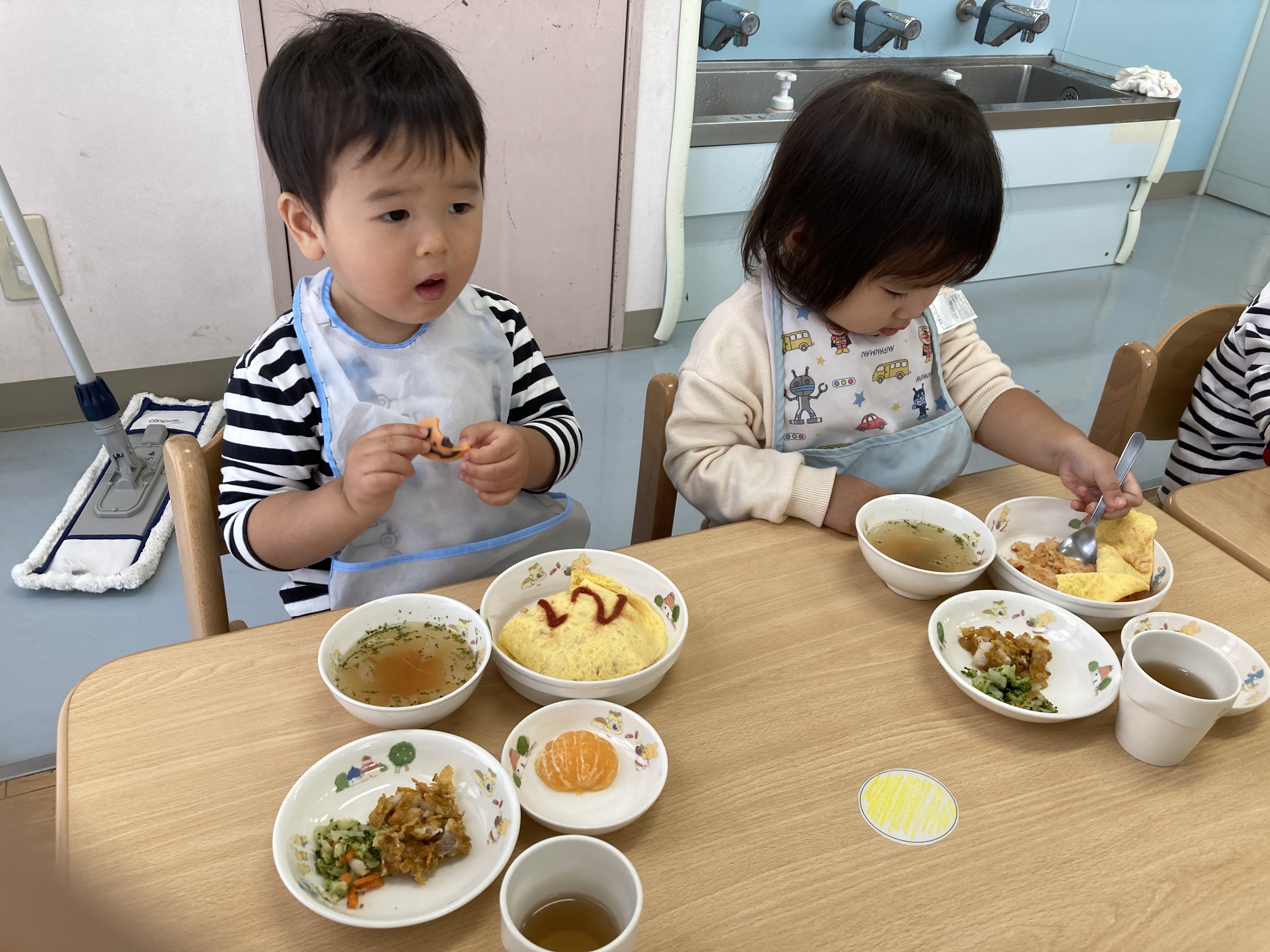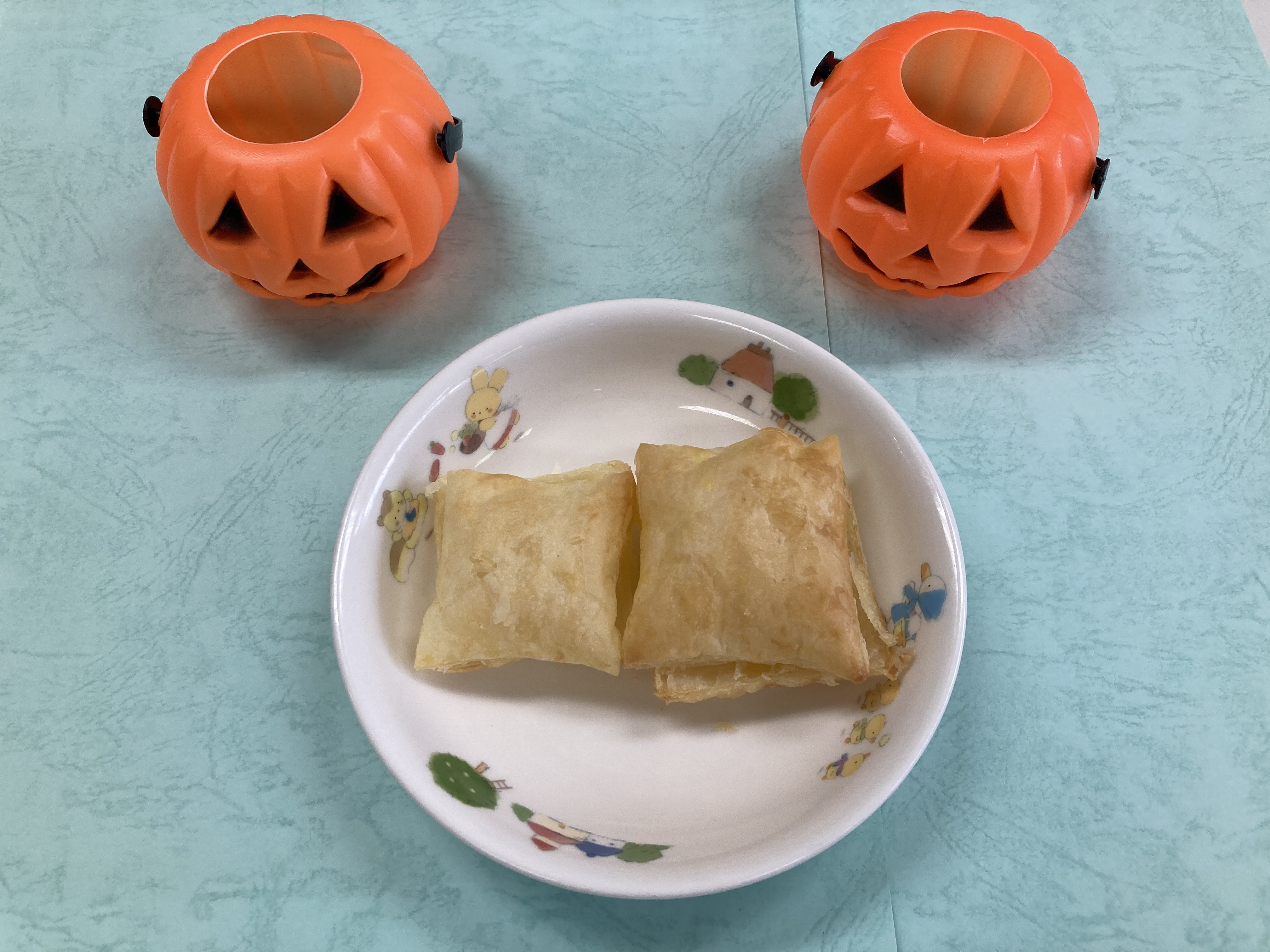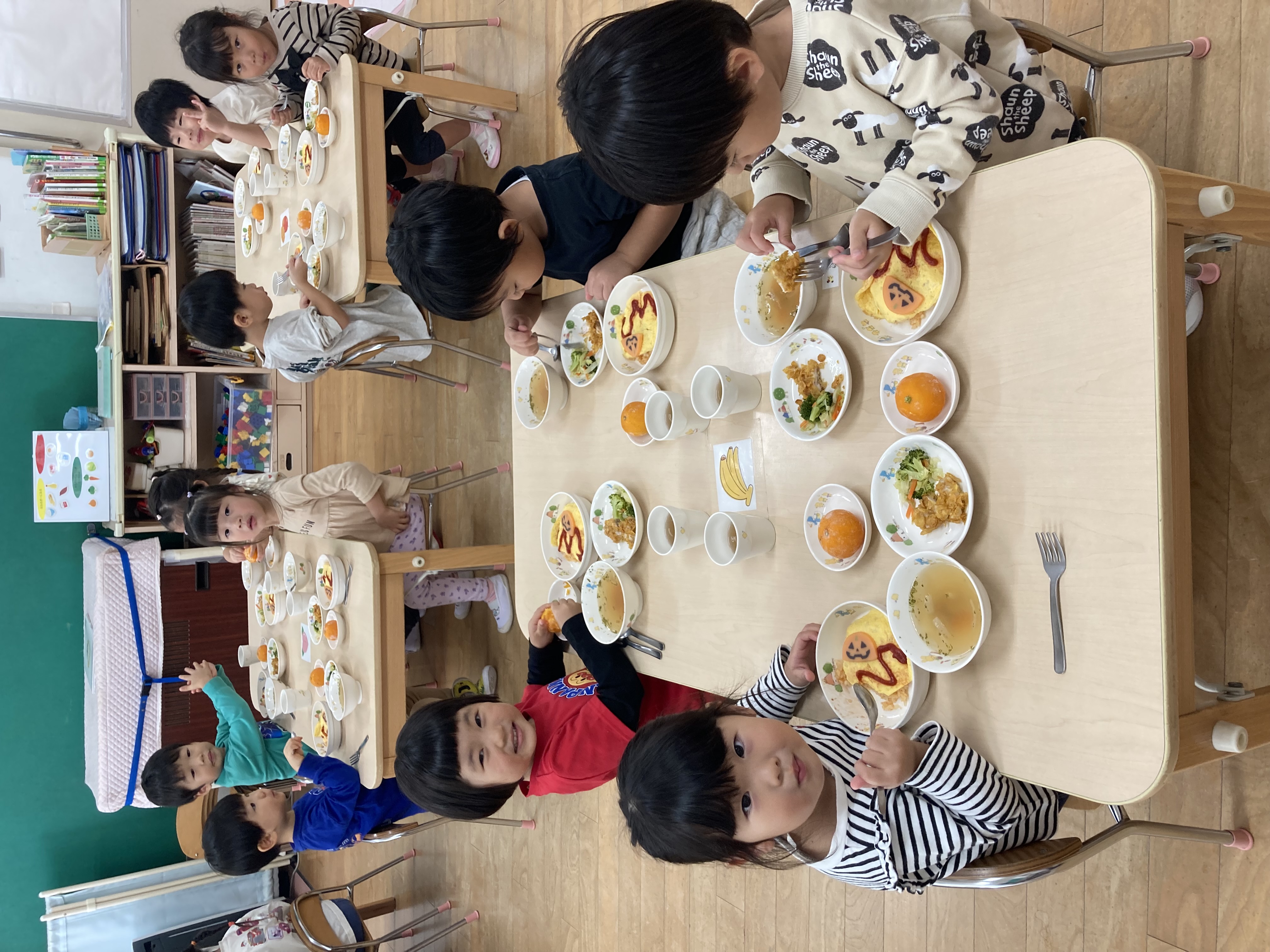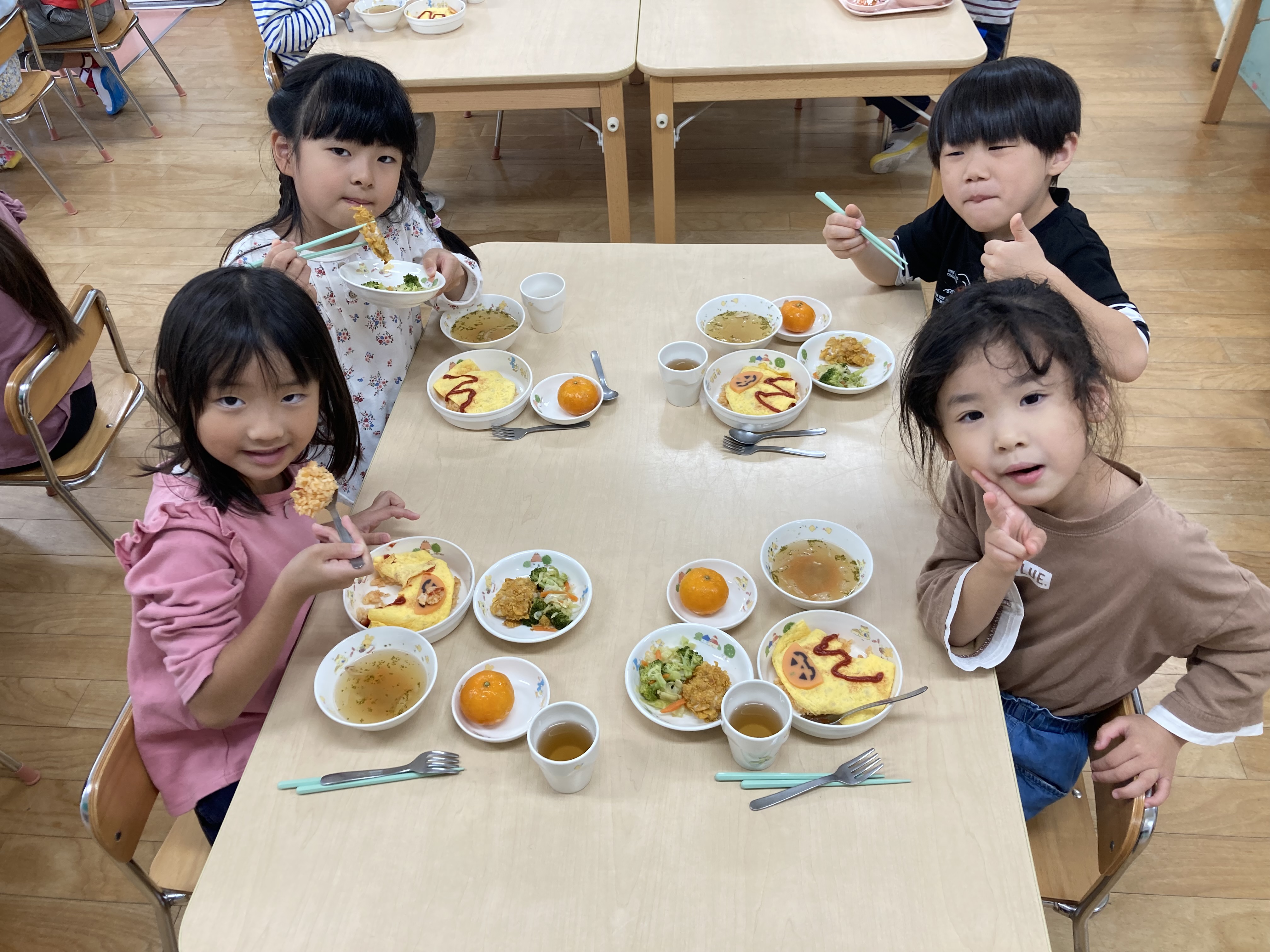 配膳の際に、オムライスの上に乗っていたかぼちゃのかまぼこを見て、「わー!」や