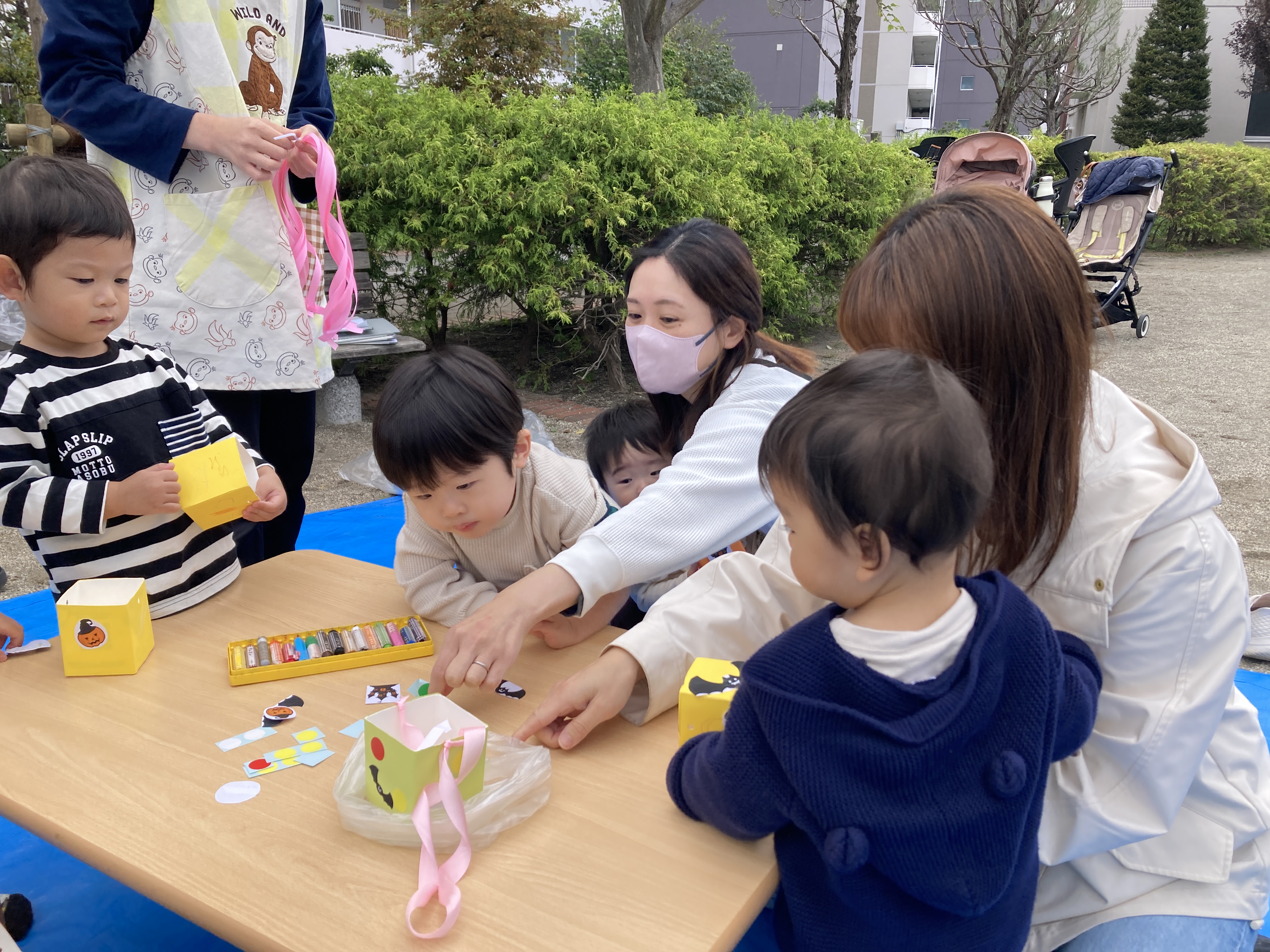 牛乳パックの入れ物の制作を行い、「秋を探しに行こう!」とどんぐりや石、葉っぱなど公園を散策しました。制作では、丸シールやカボチャやコウモリなどのハロウィンのを感じる事が出来るようなシールを自由に貼り付け、クレヨンでカラフルに仕上げたりなど、オリジナルの入れ物を作りました!