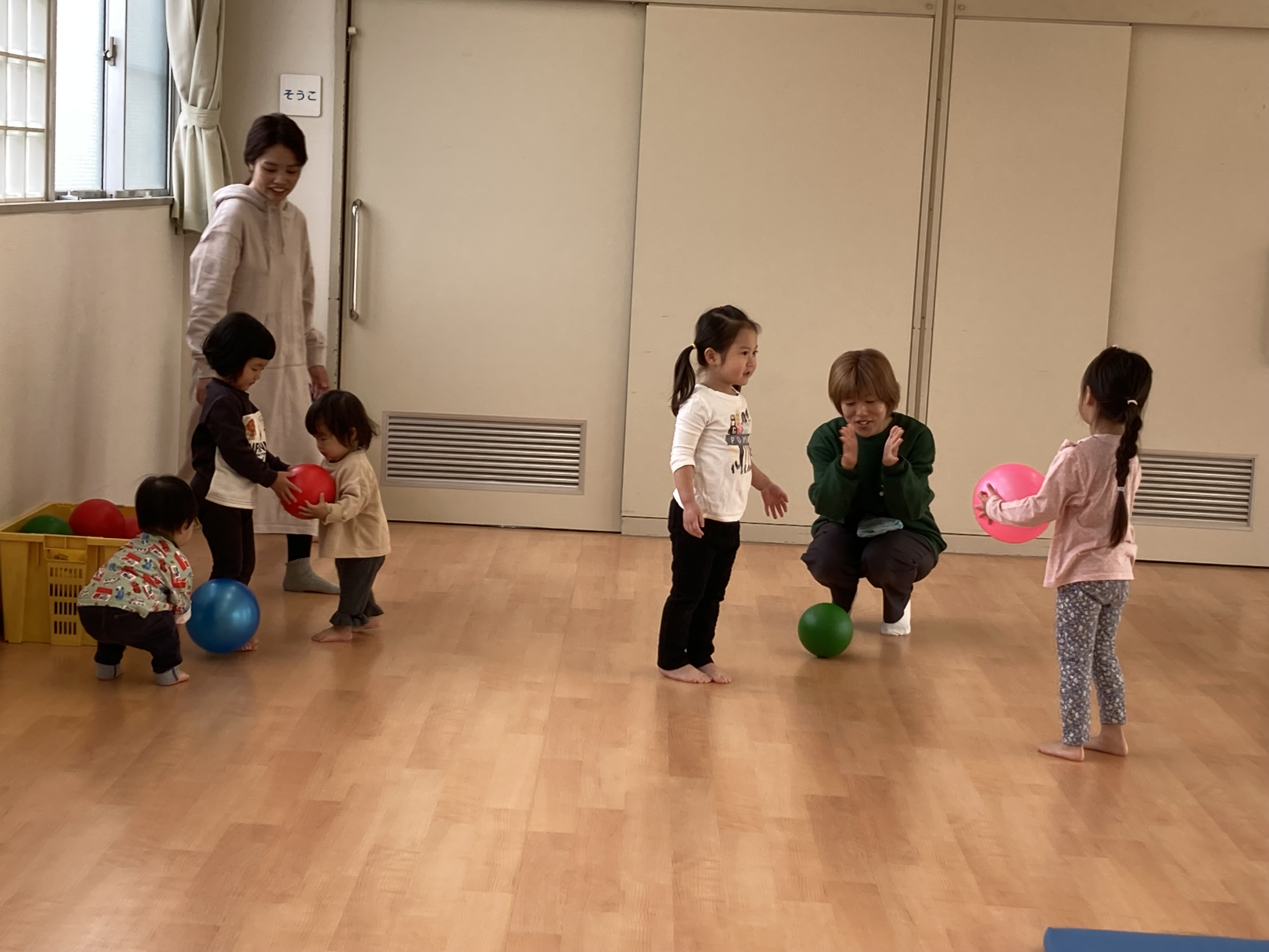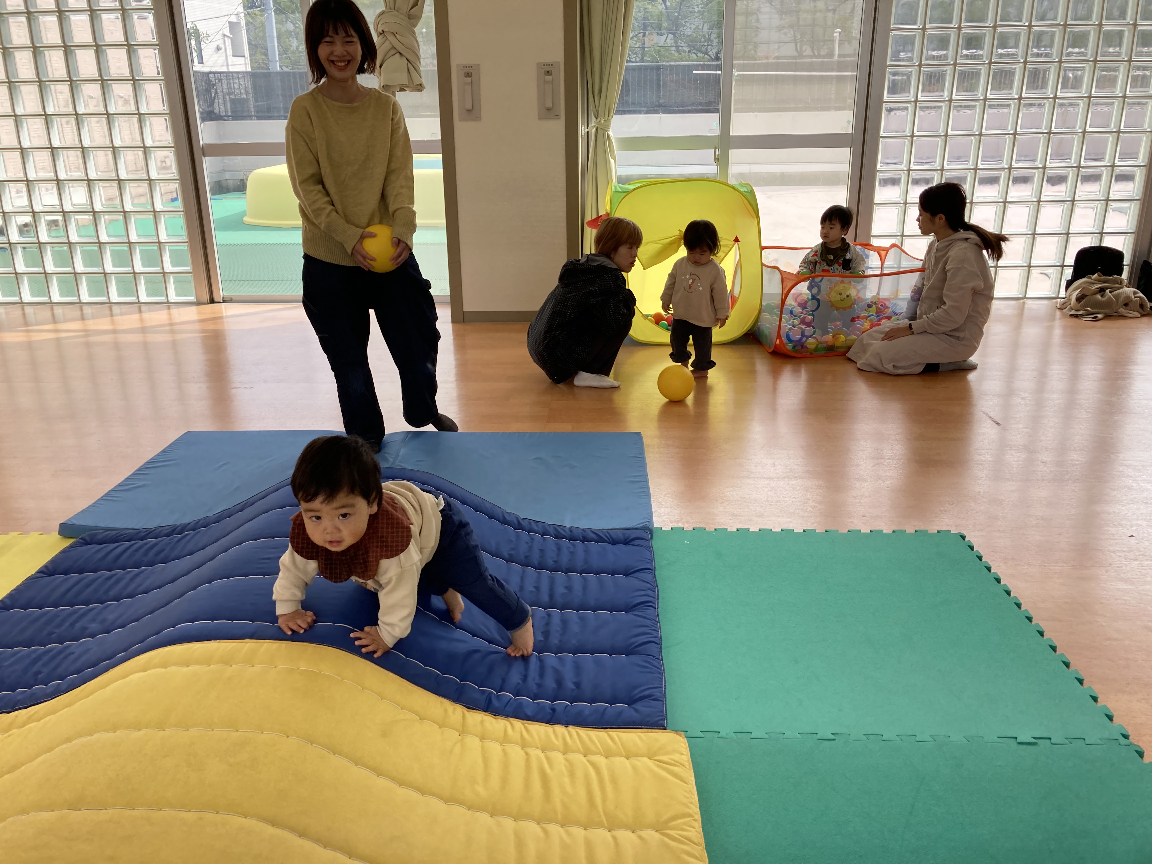巧技台で設定されたマット山やボール、ボールプールで楽しく遊ぶ姿が見られました。マット山では、上手にハイハイをして登り滑り台のように滑って降りたり、ボールプールの中に入って沢山のカラーボールに囲まれて嬉しそうな表情で遊んでいましたよ。マット山で上手に登る事が出来て、保育士が「上手だね!」と拍手をすると、真似をして手をパチパチと叩いている姿が見られ、とても可愛らしかったです。