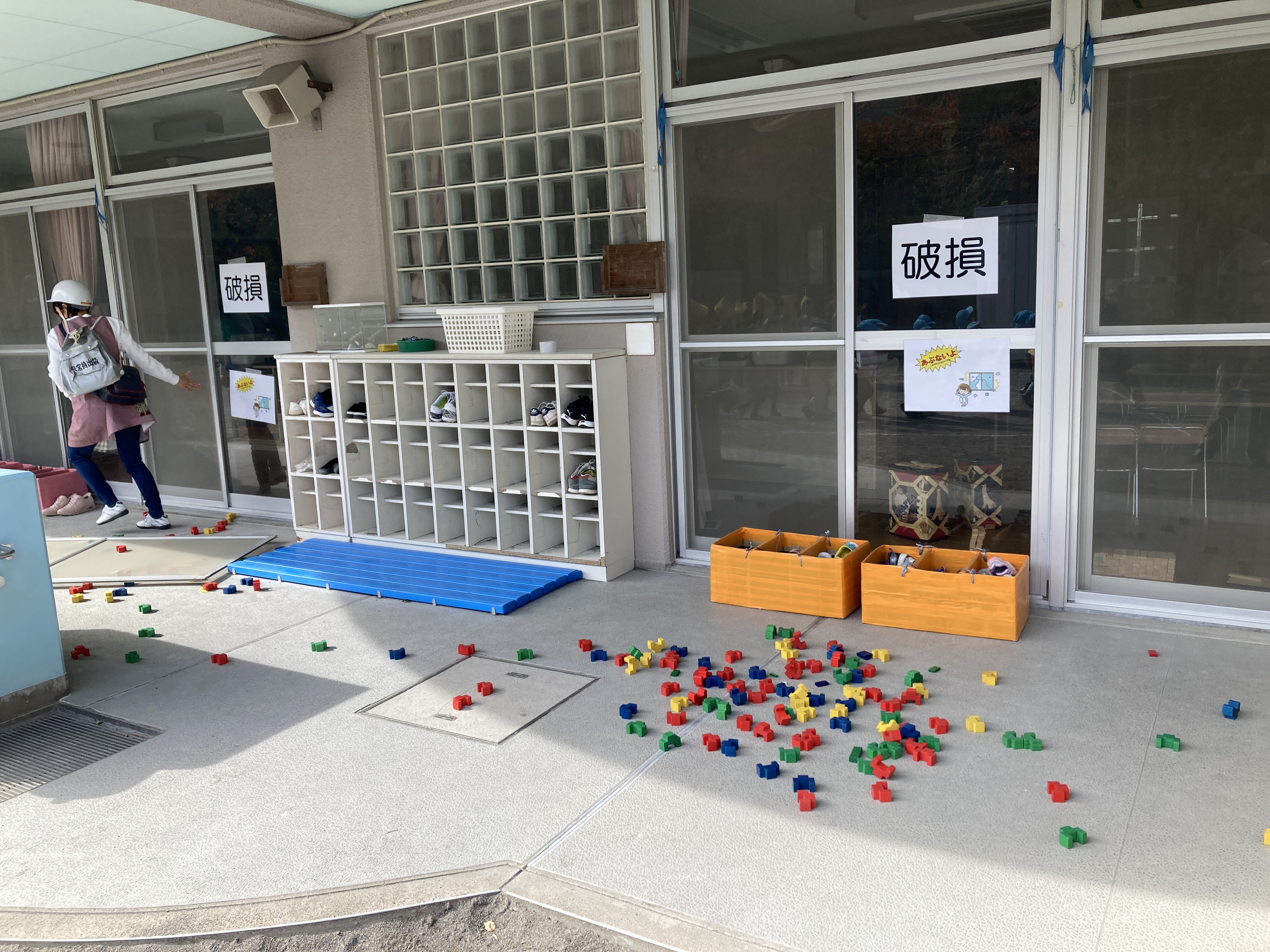 震度6の地震を想定したもので、今回は4歳テラス前のガラスが破損した設定で行いました。