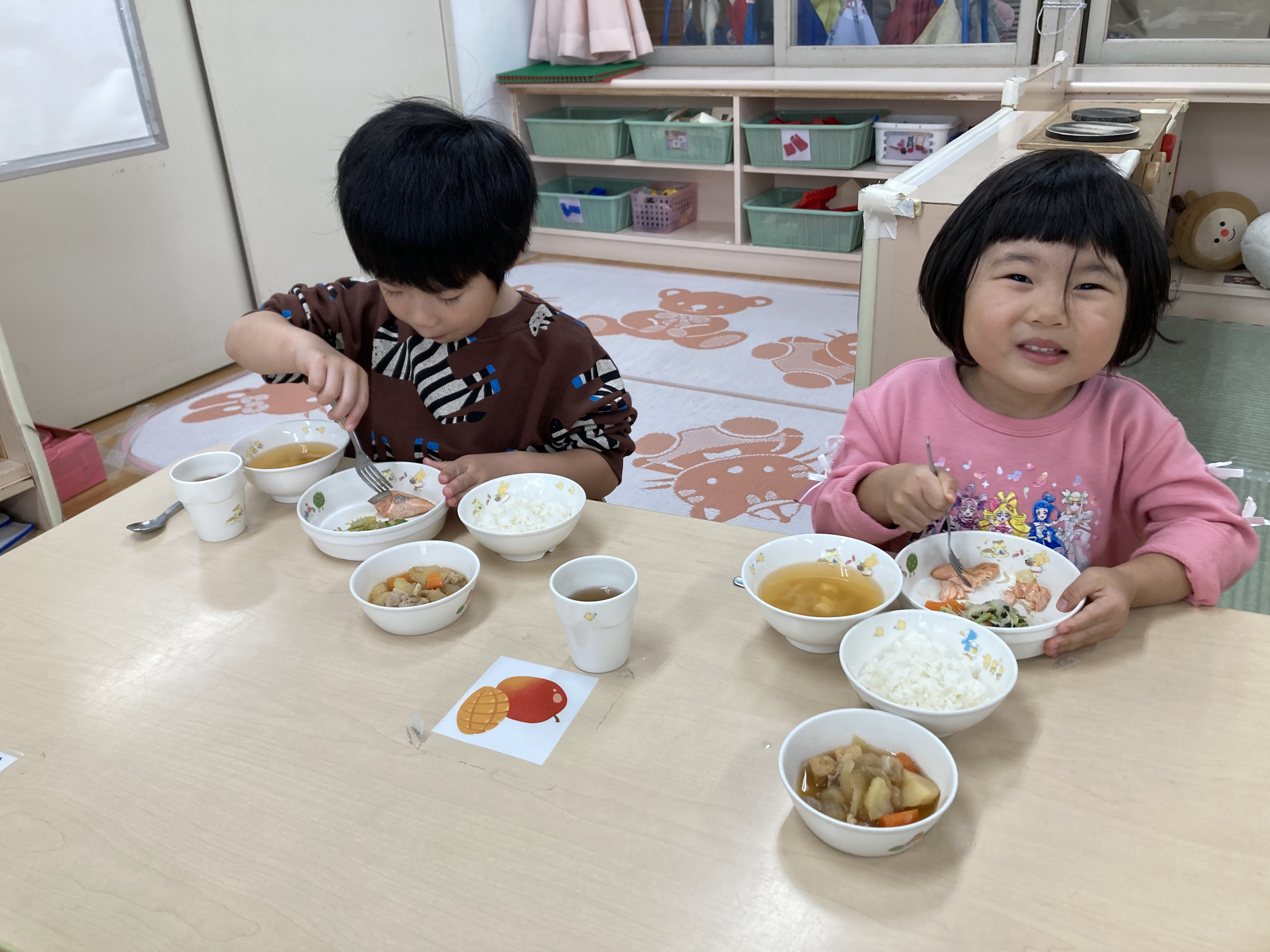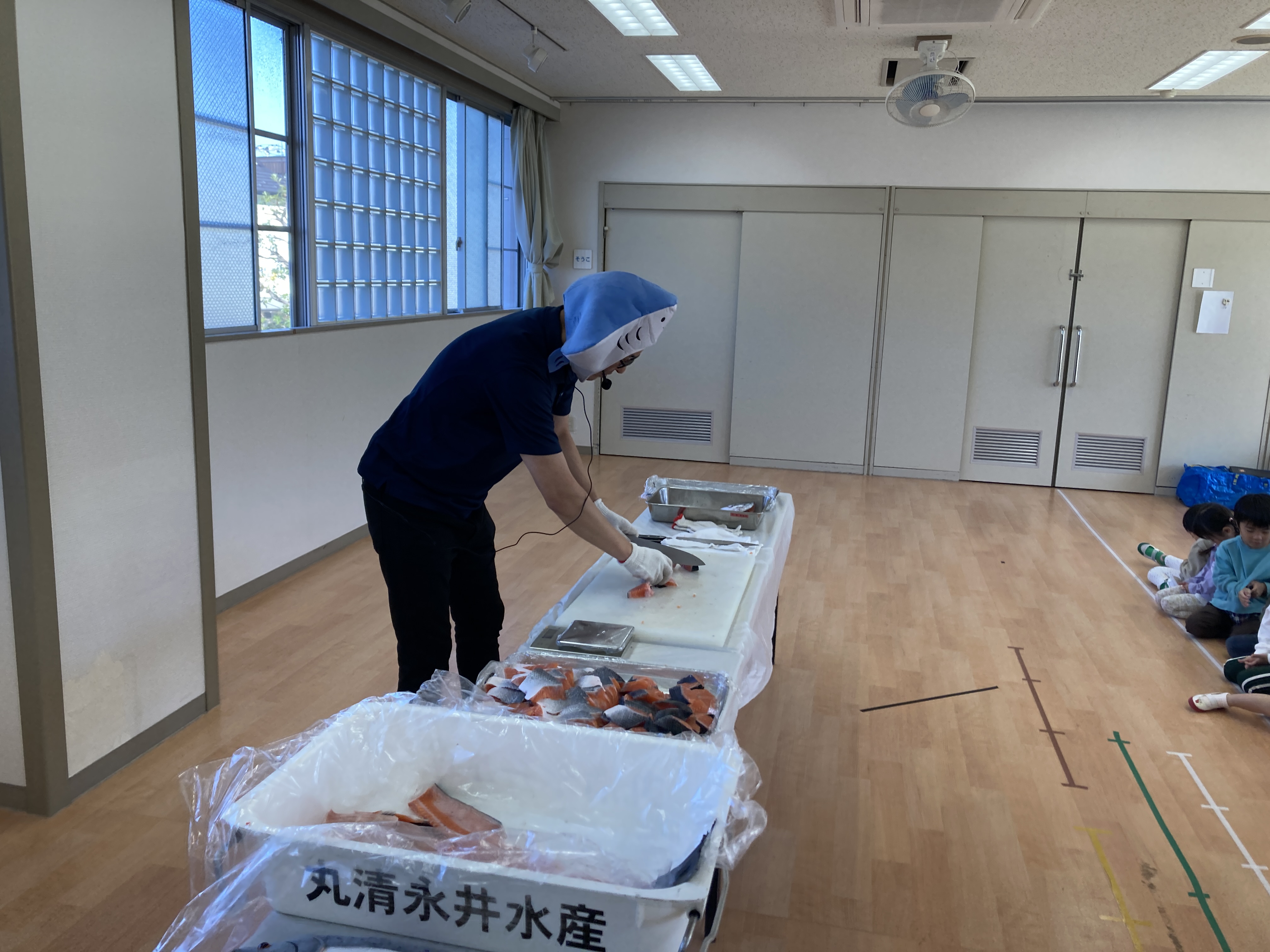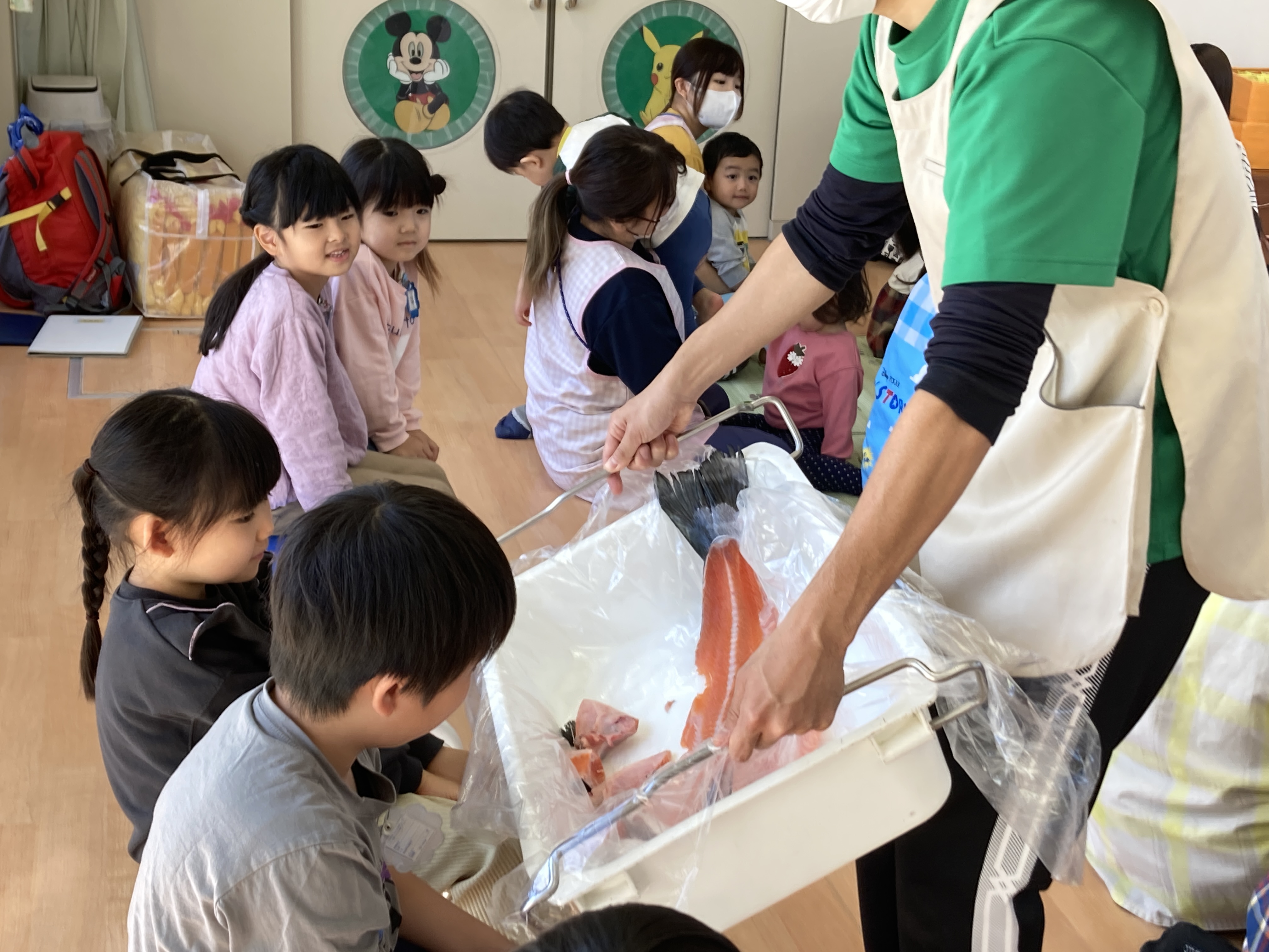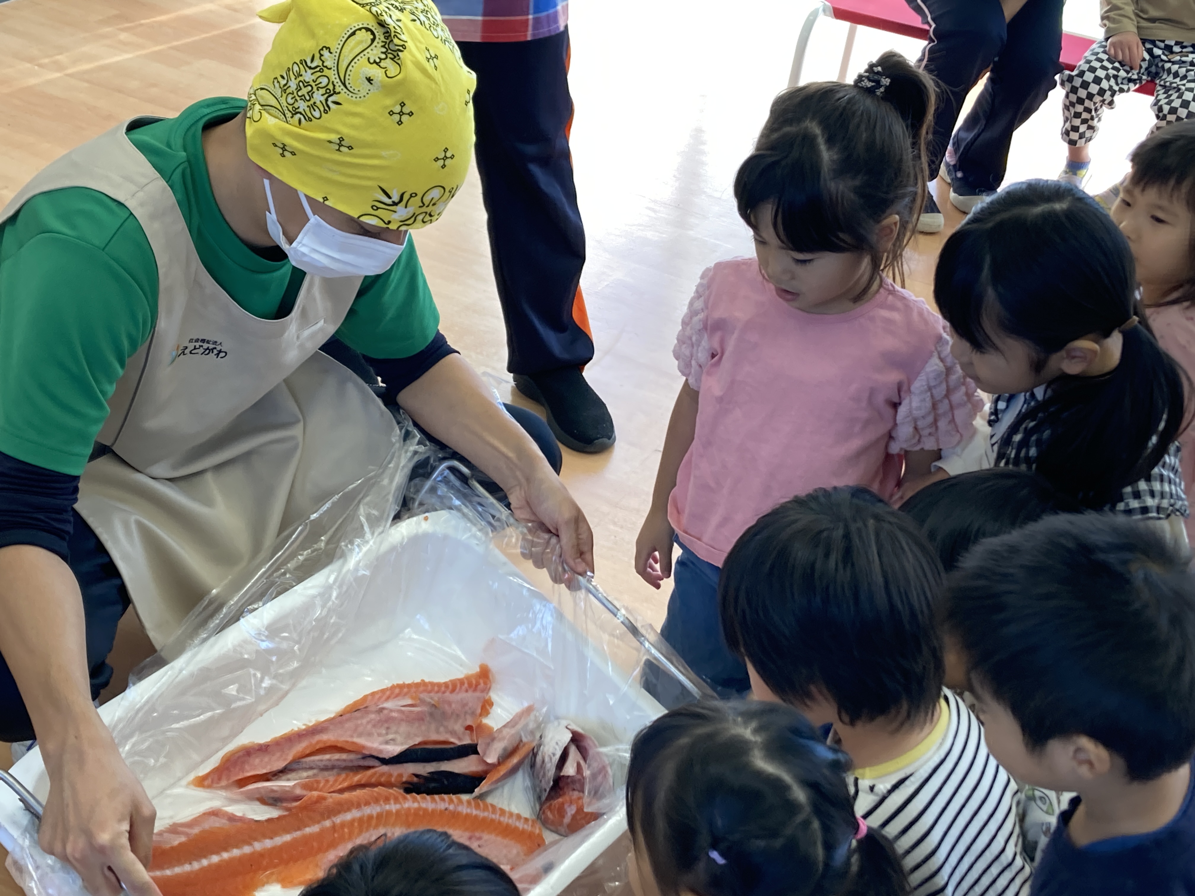 給食では、魚屋さんが切ってくれた鮭が出てきました。