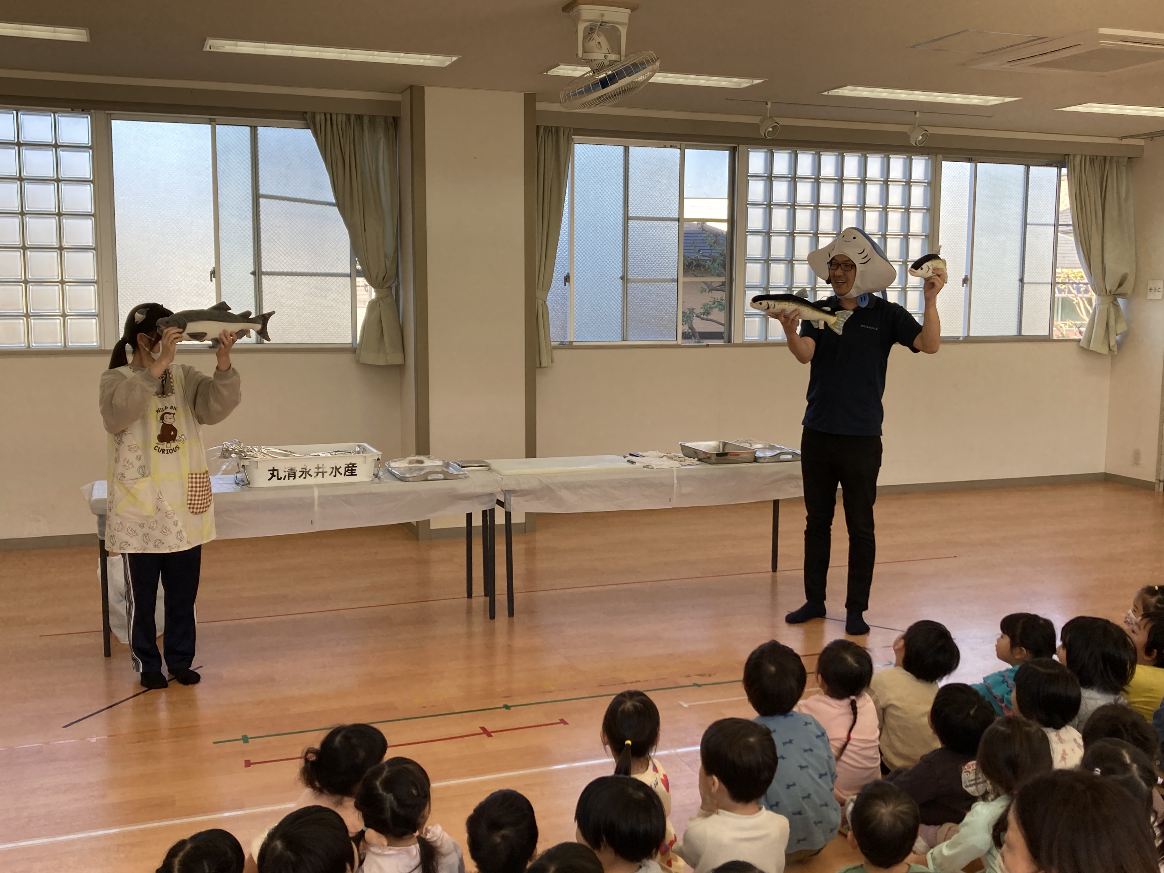 魚屋さんが最初に、鮭はどこで暮らしているかのクイズを行うと、海と川の両方で暮らしているということを知って驚く子どもたち。