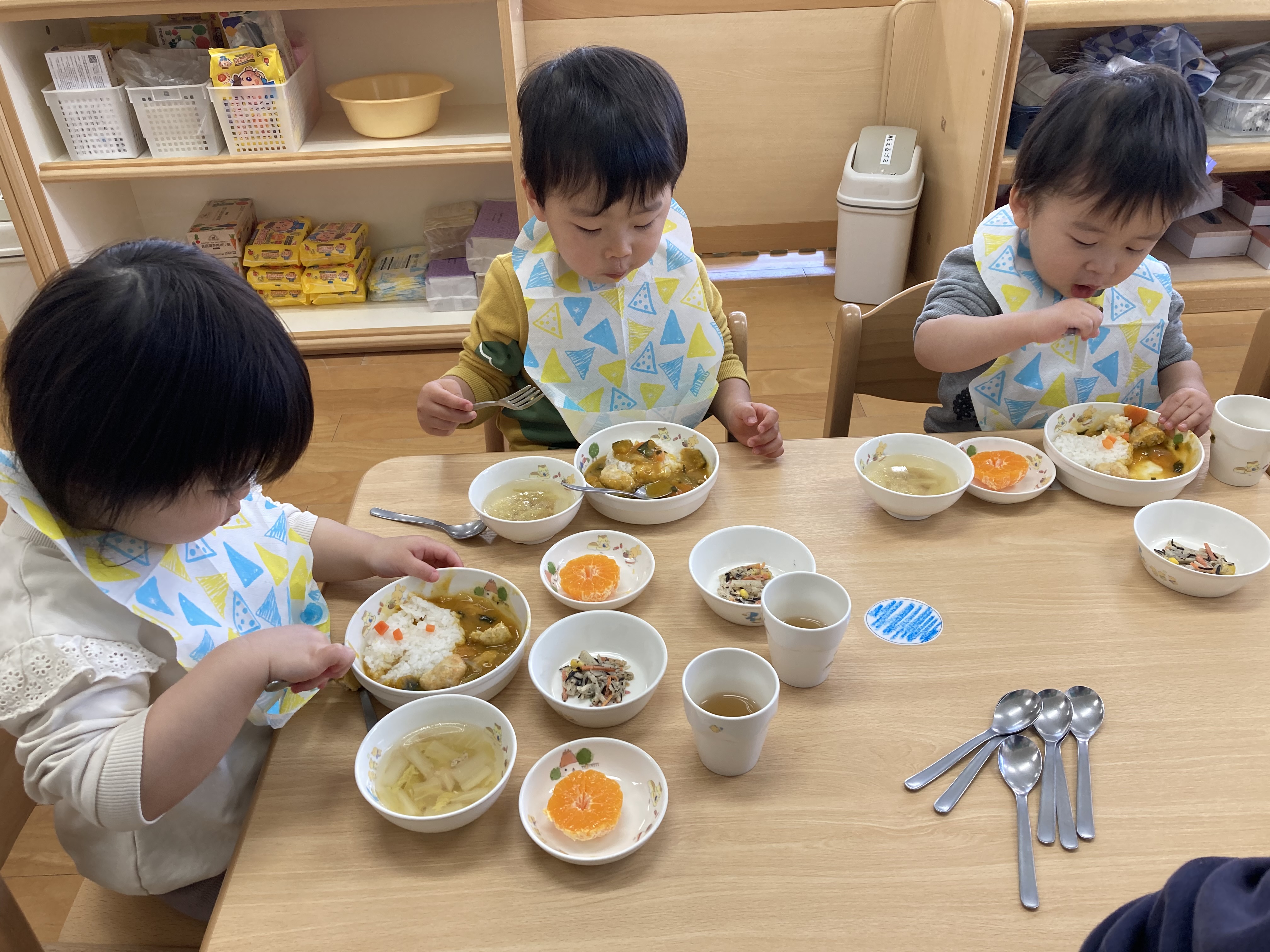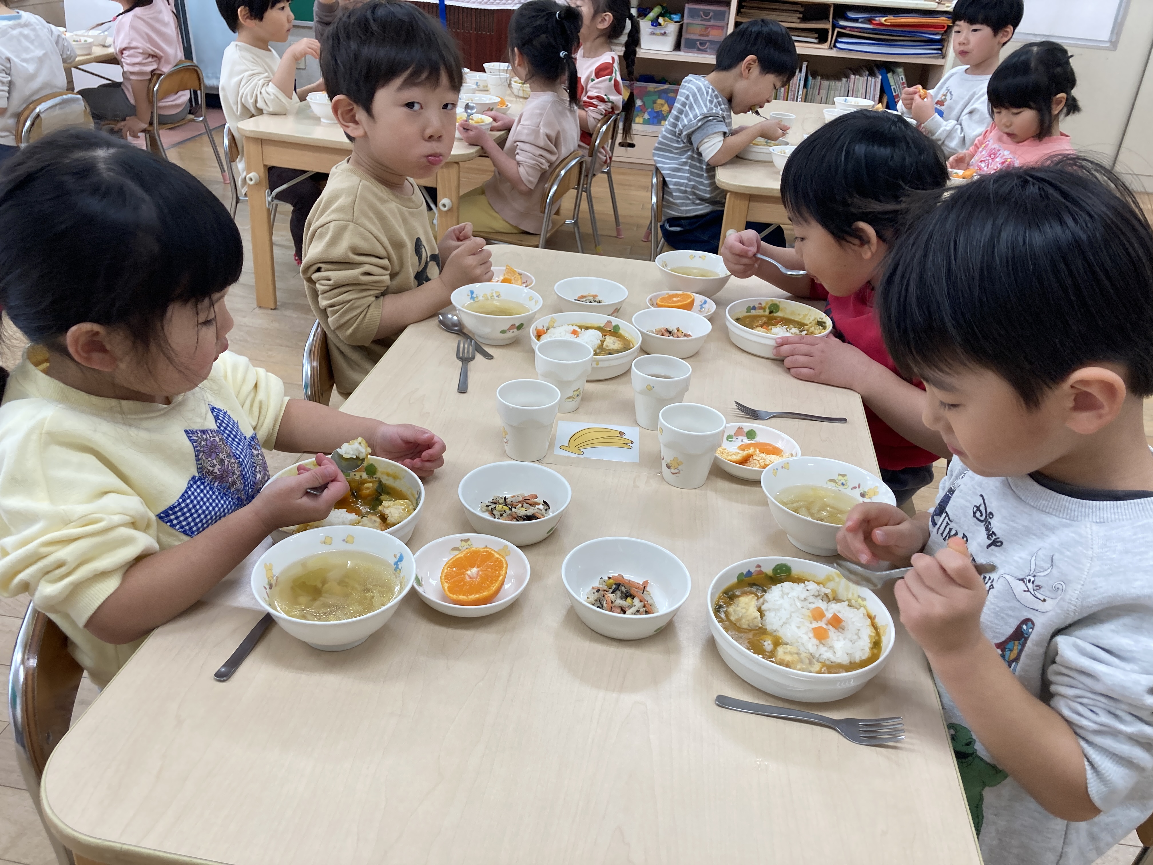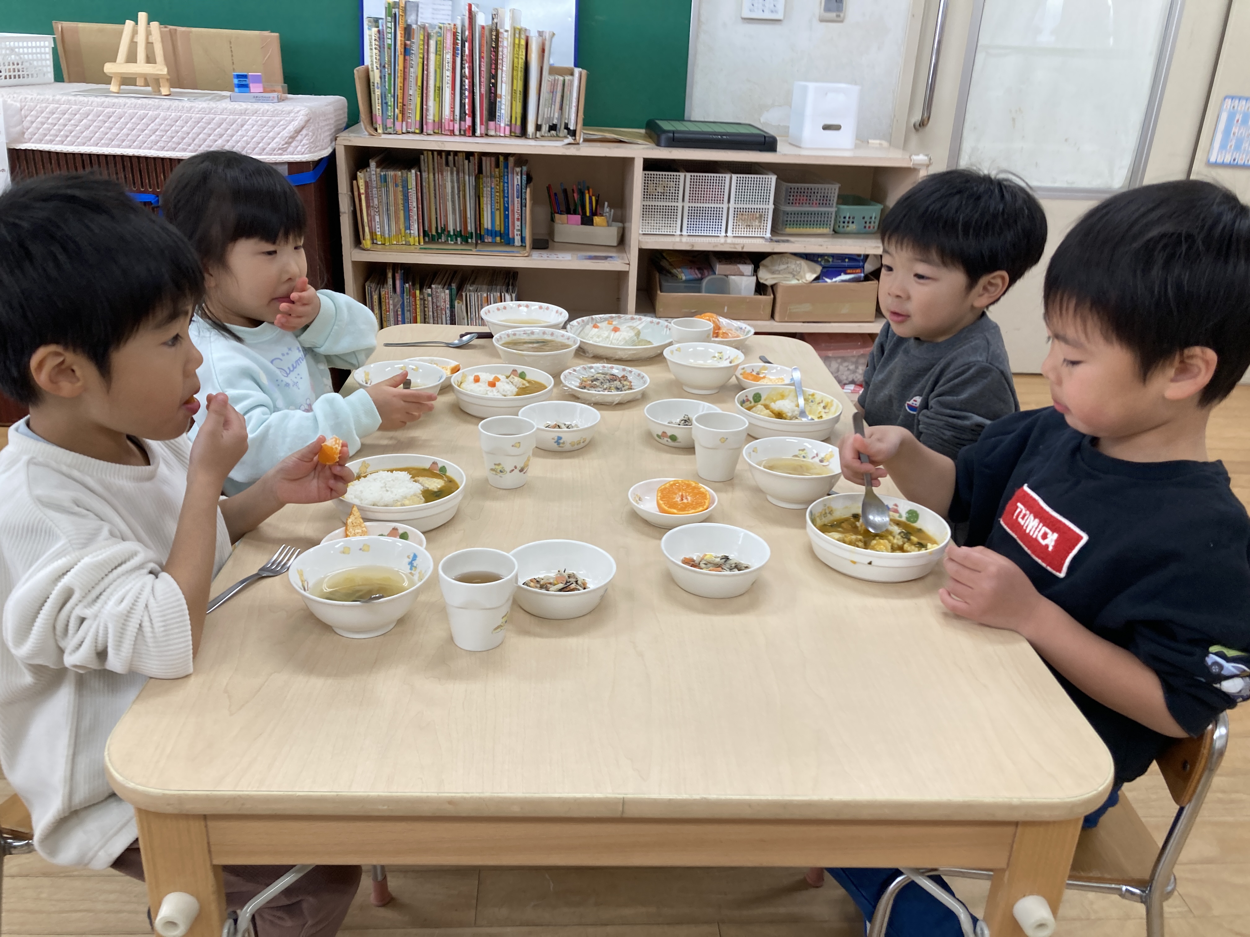 美味しそうに給食を頬張る子どもたち。みかんの皮も、上手に剥いて食べています。