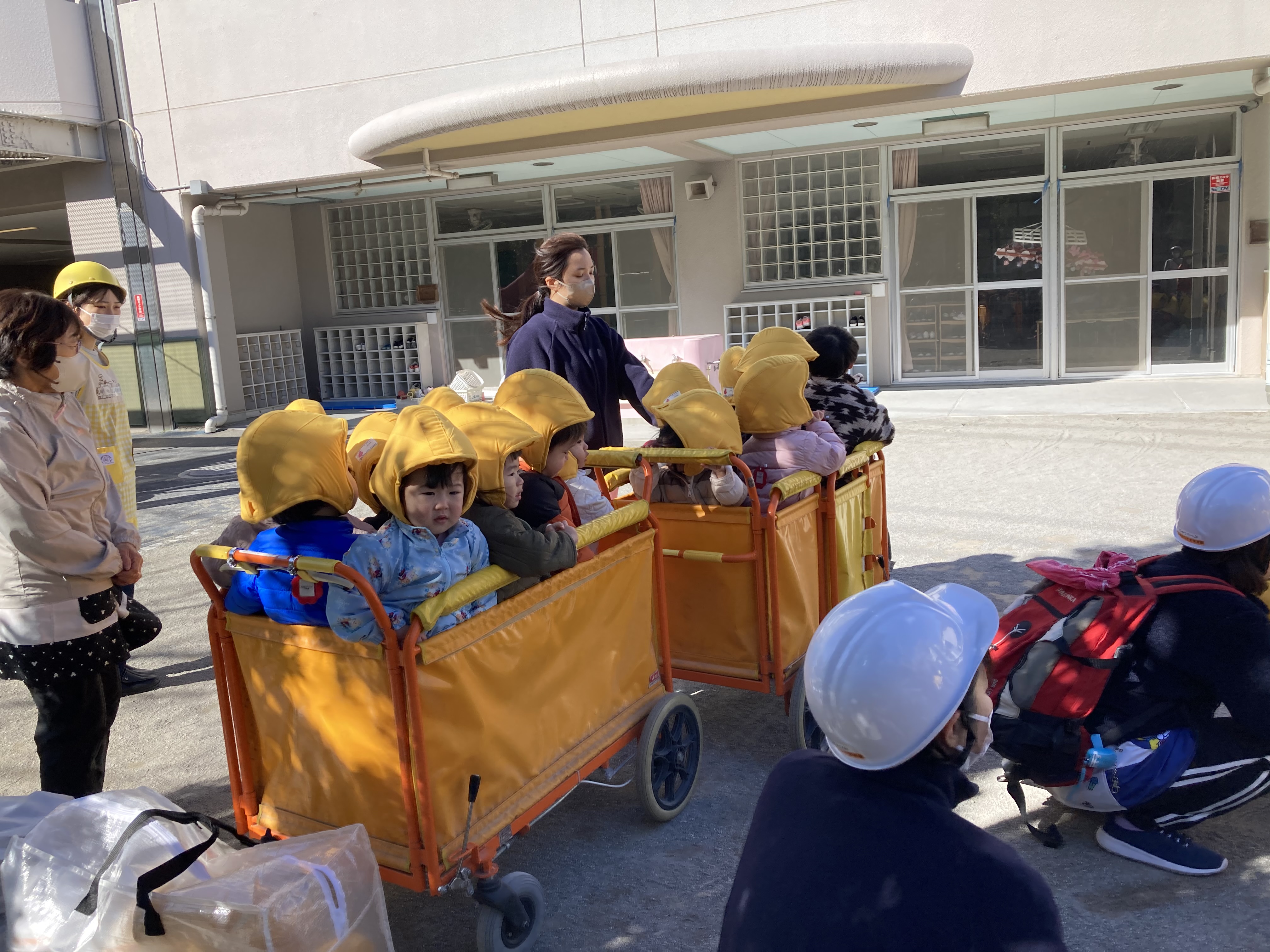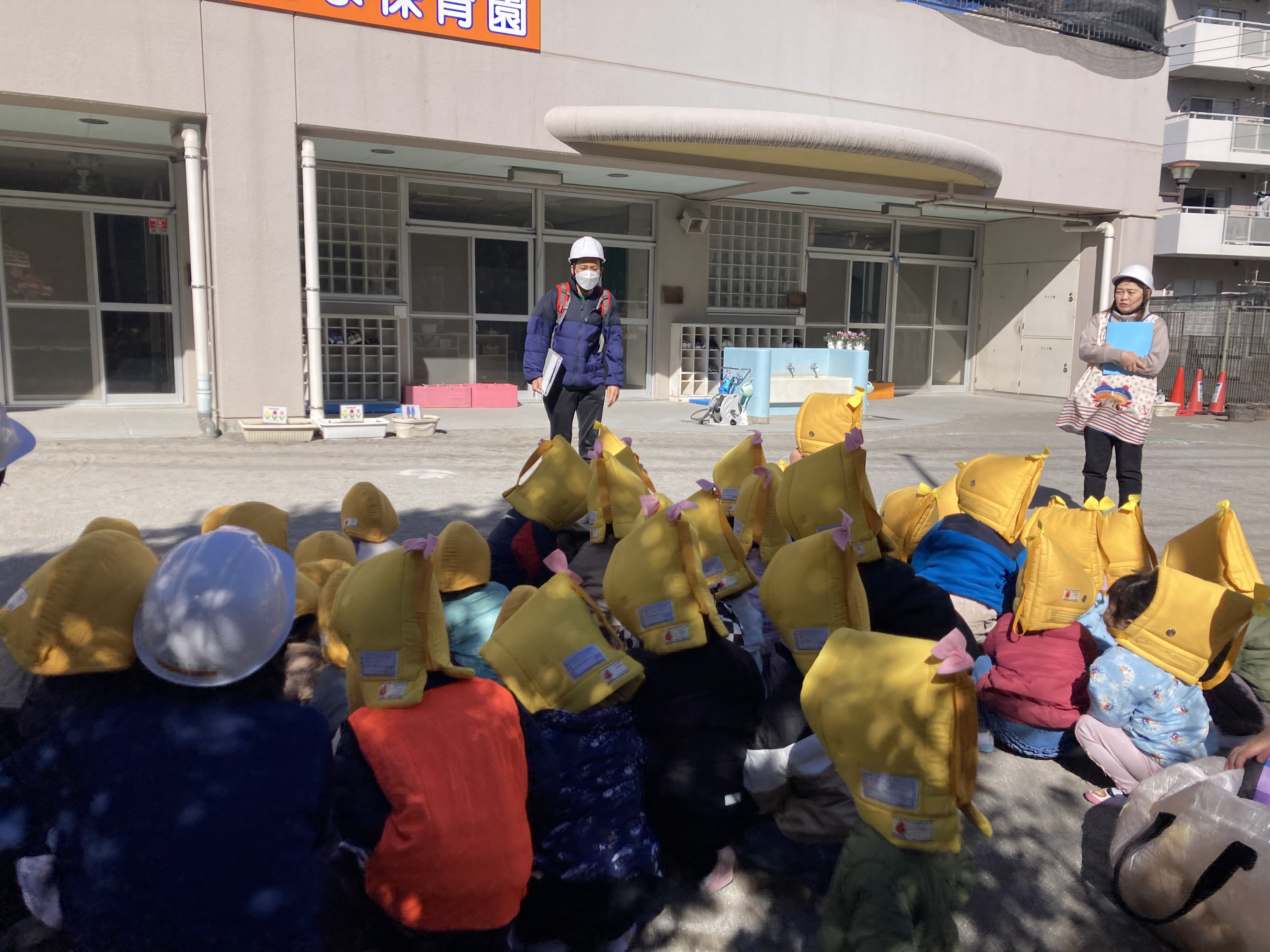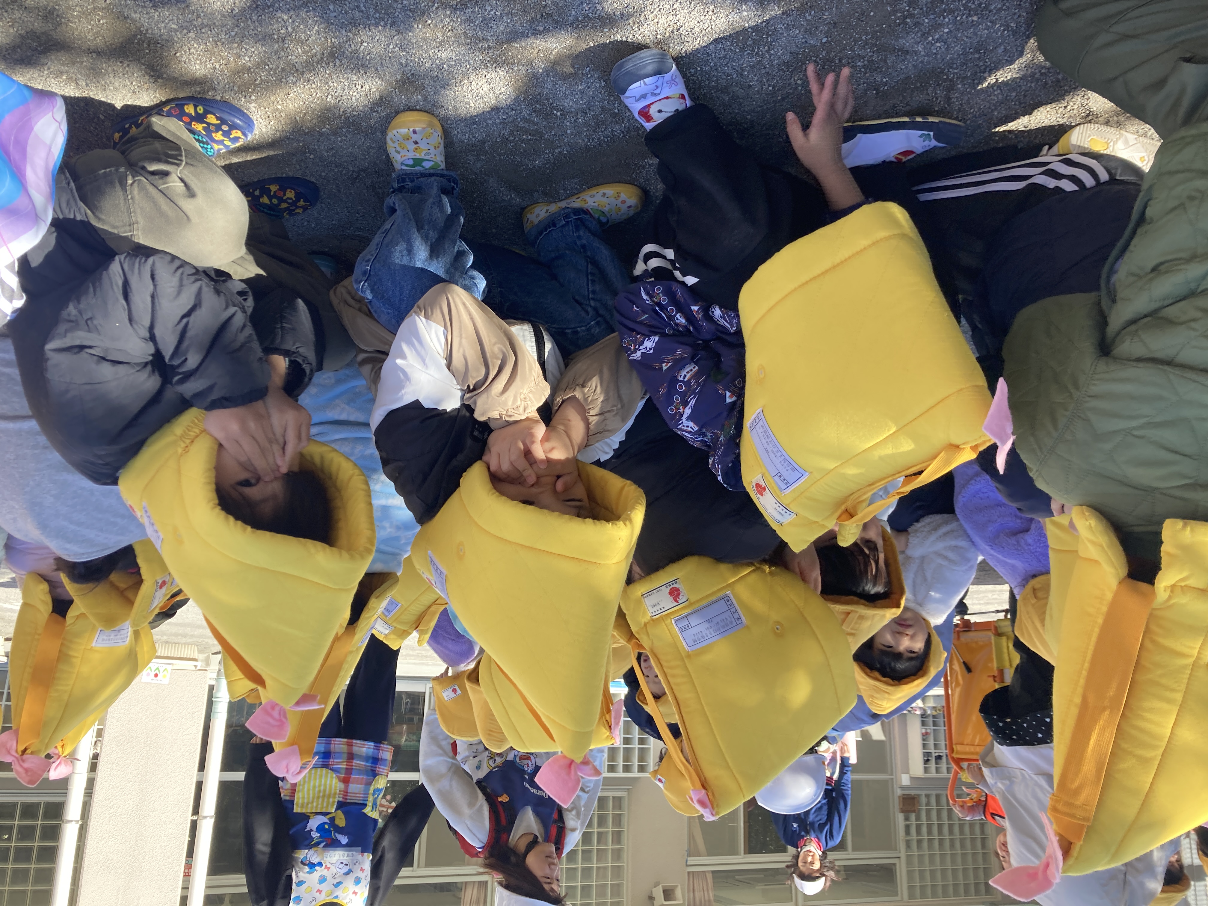 幼児クラスでは、防災頭巾の被り方も上達してきました。
