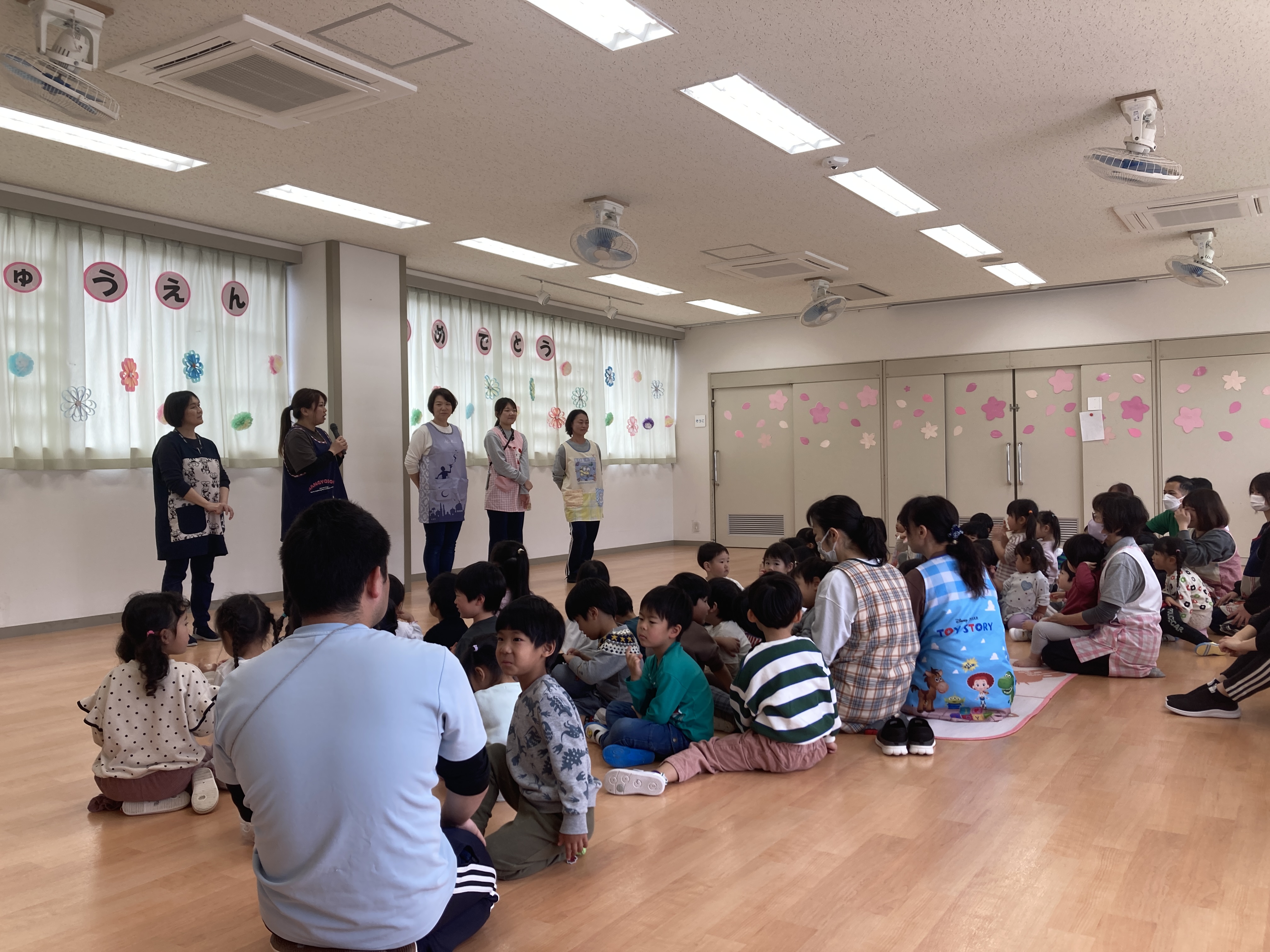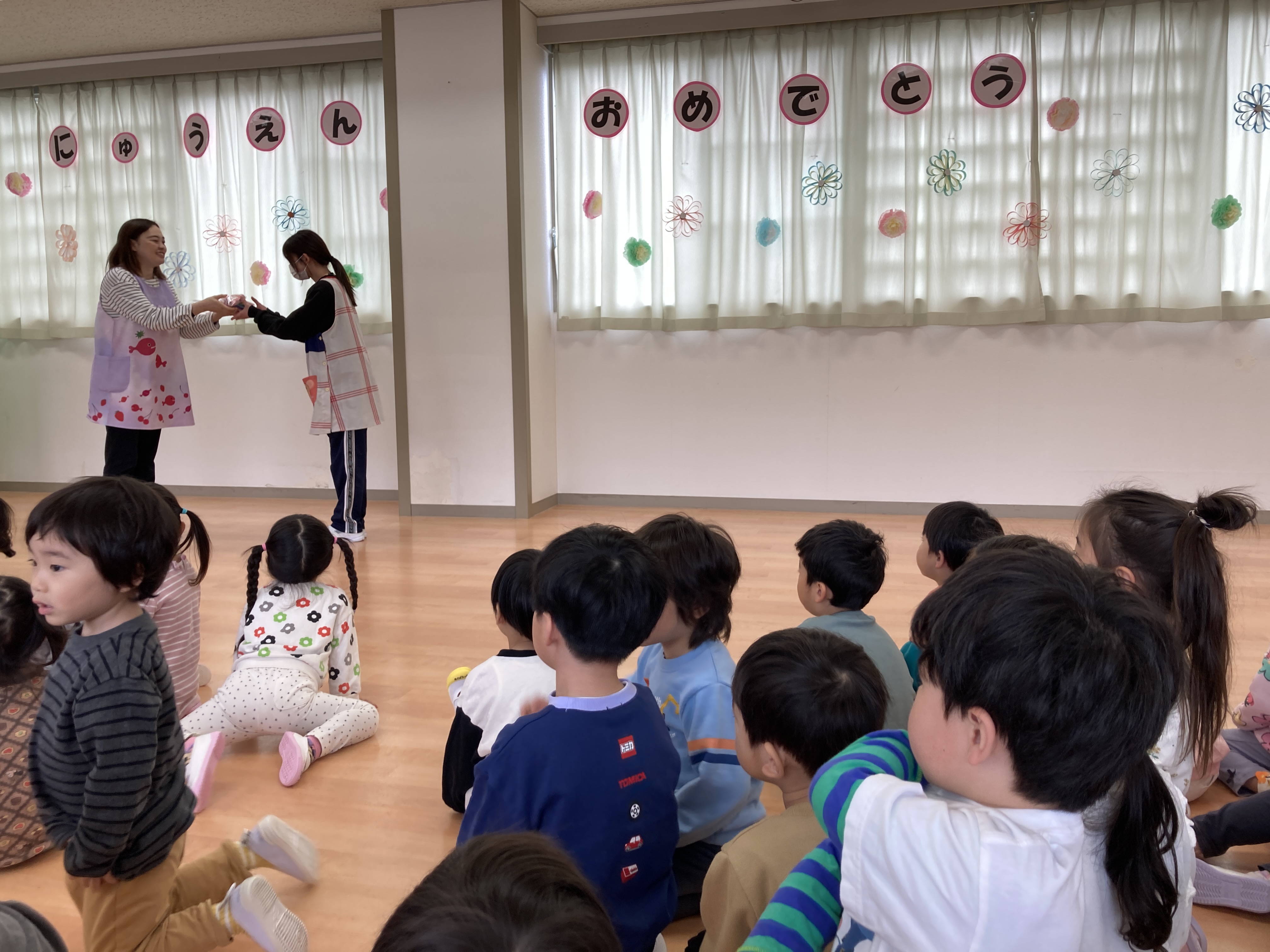 園長先生からのお話があり、その後に4月からの新しい担任の先生の発表や新しい名札・ひまわり組のお友だちが作ってくれたお誕生日カードが配られました。新しい先生が発表されると「○○先生だー!」と笑顔を見せていた子ども達でした。