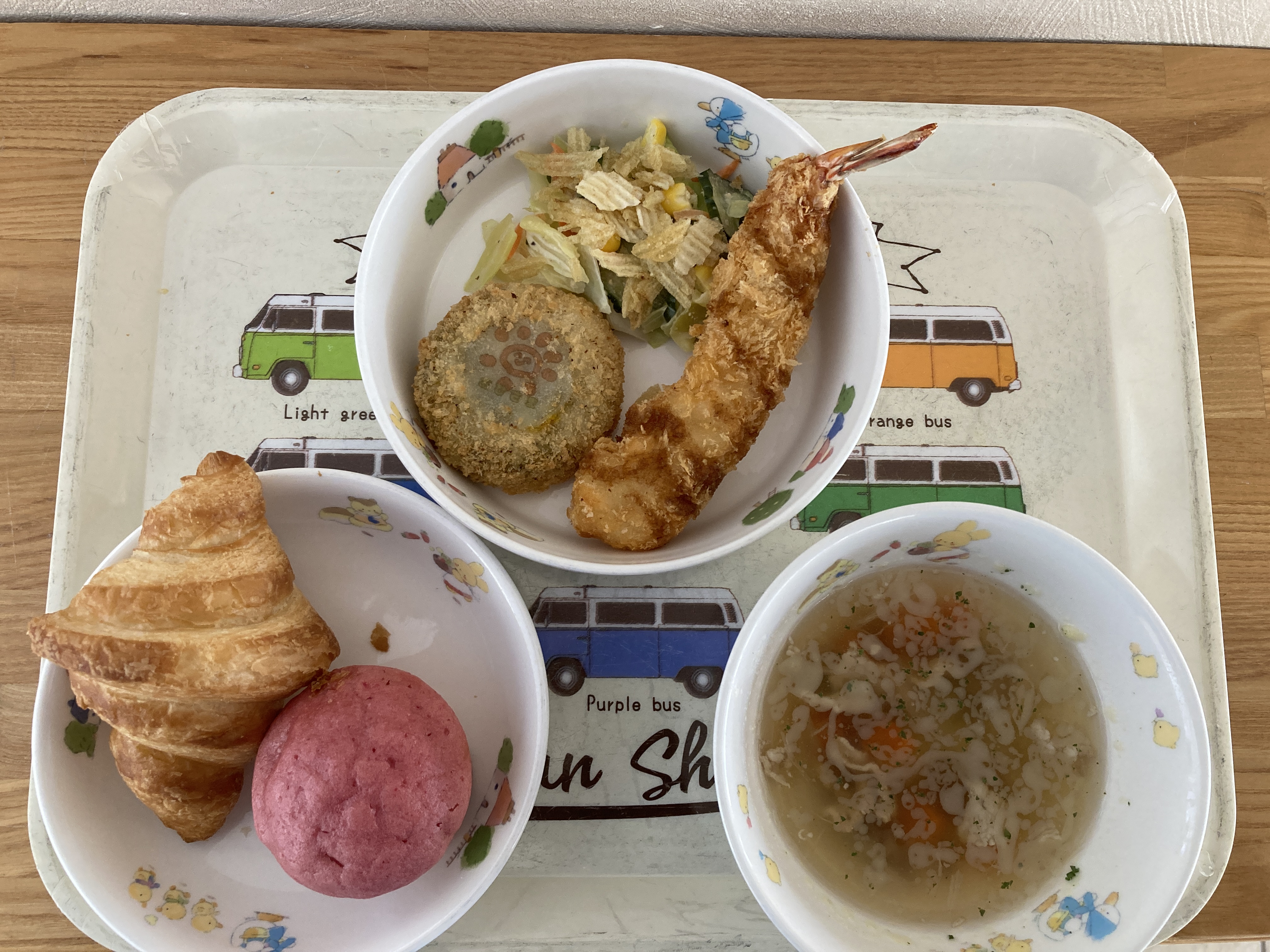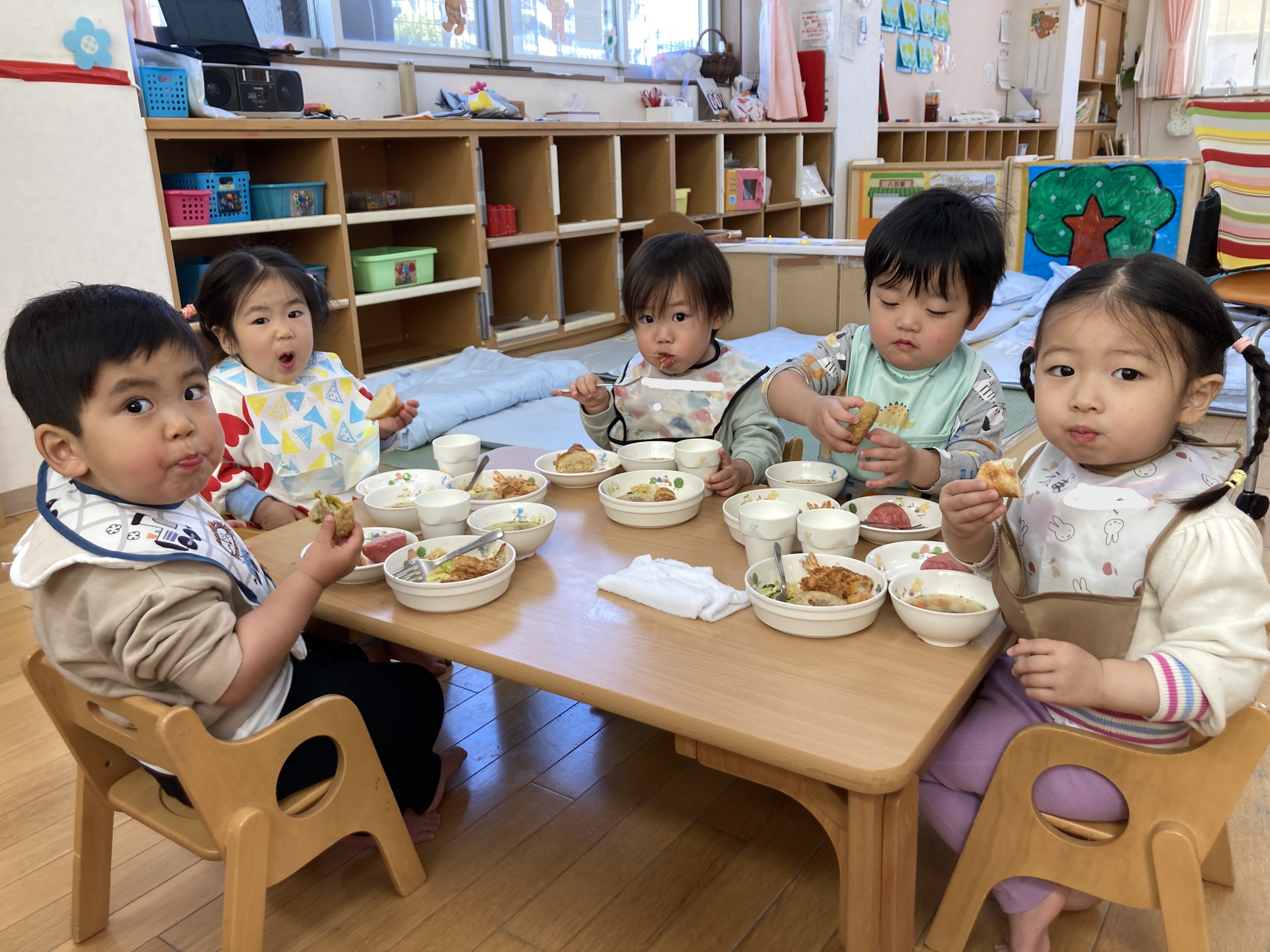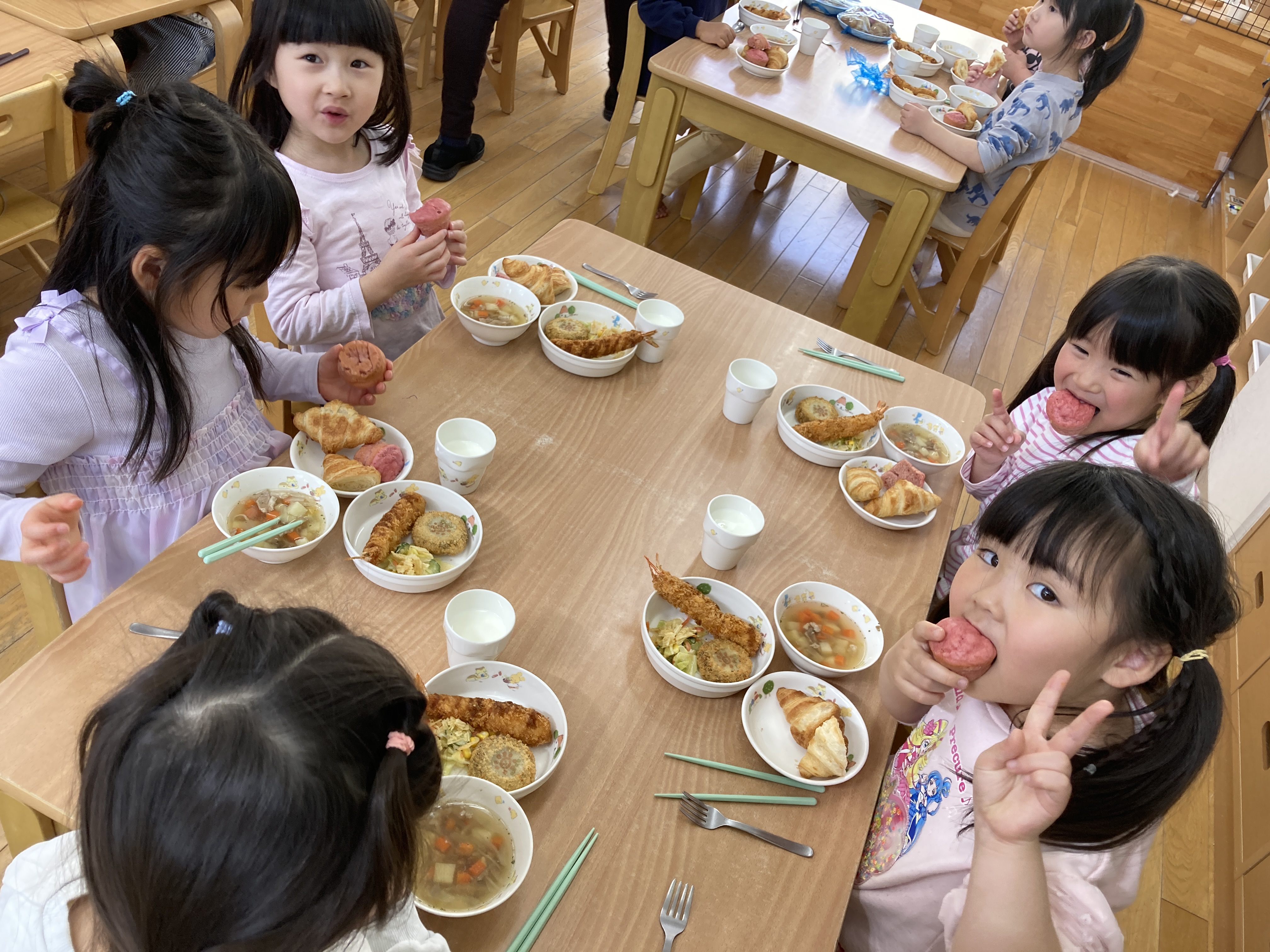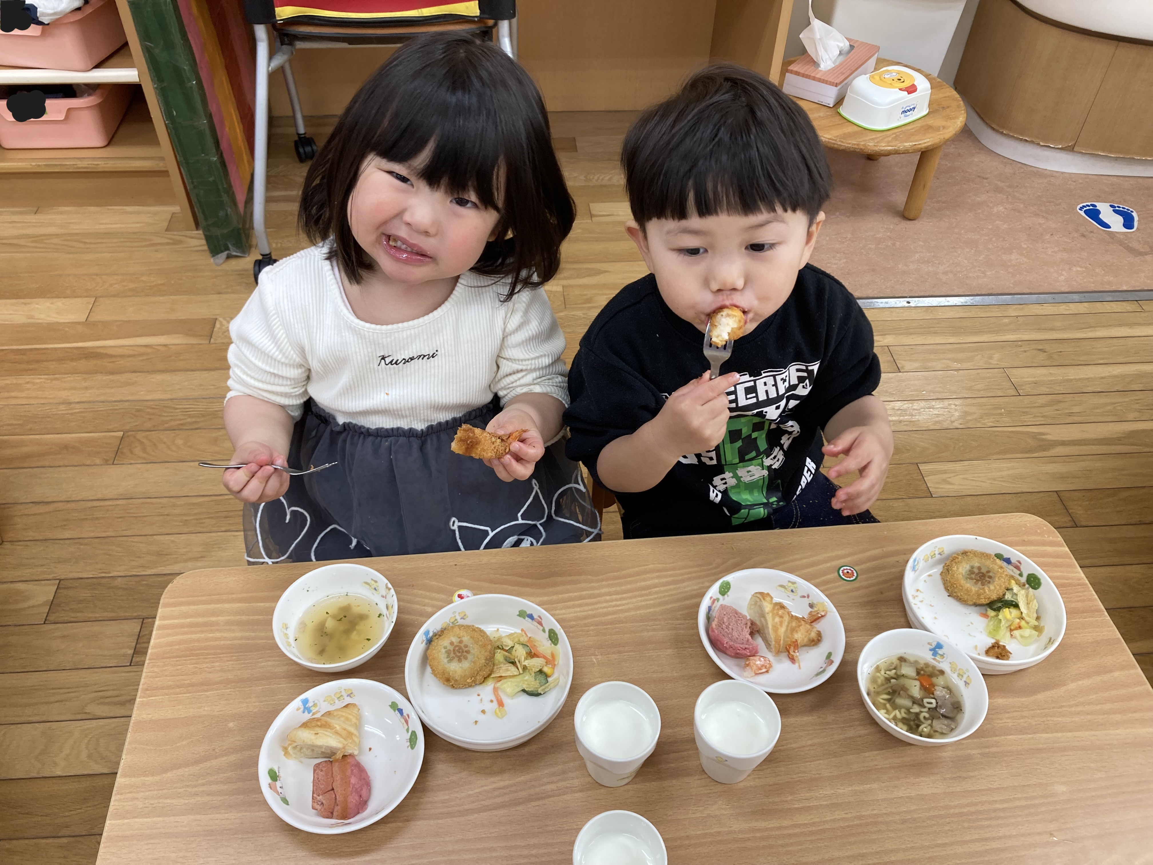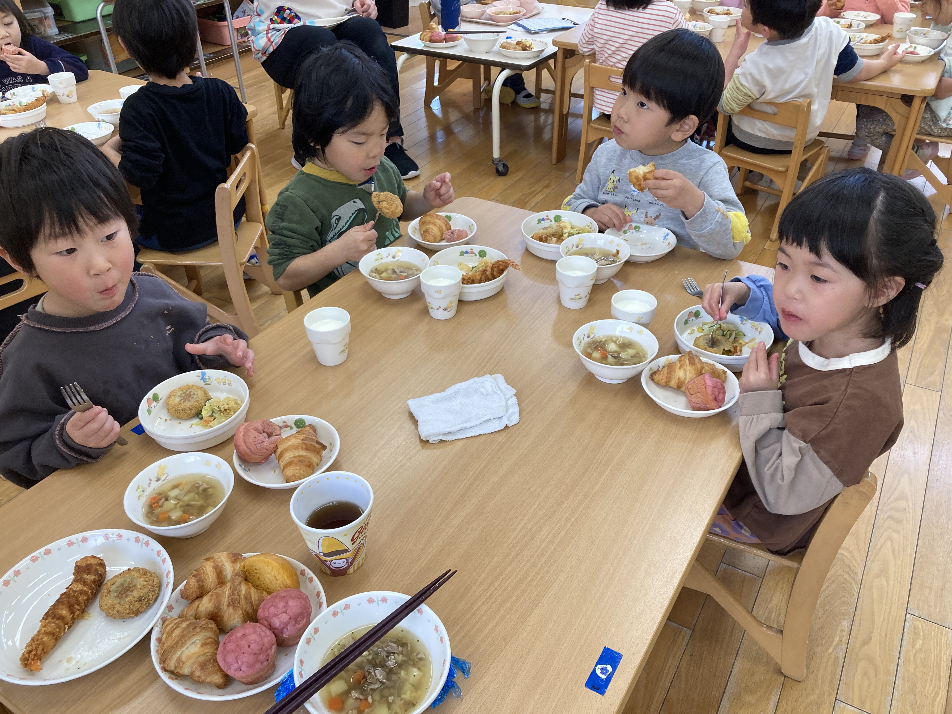 子どもたちが大好きなメニューで大喜びでした。ABCスープの中に入っているアルファベットを探したりコロッケのおひさまマークを見て嬉しそうに保育士に見せて楽しんで食べていました。