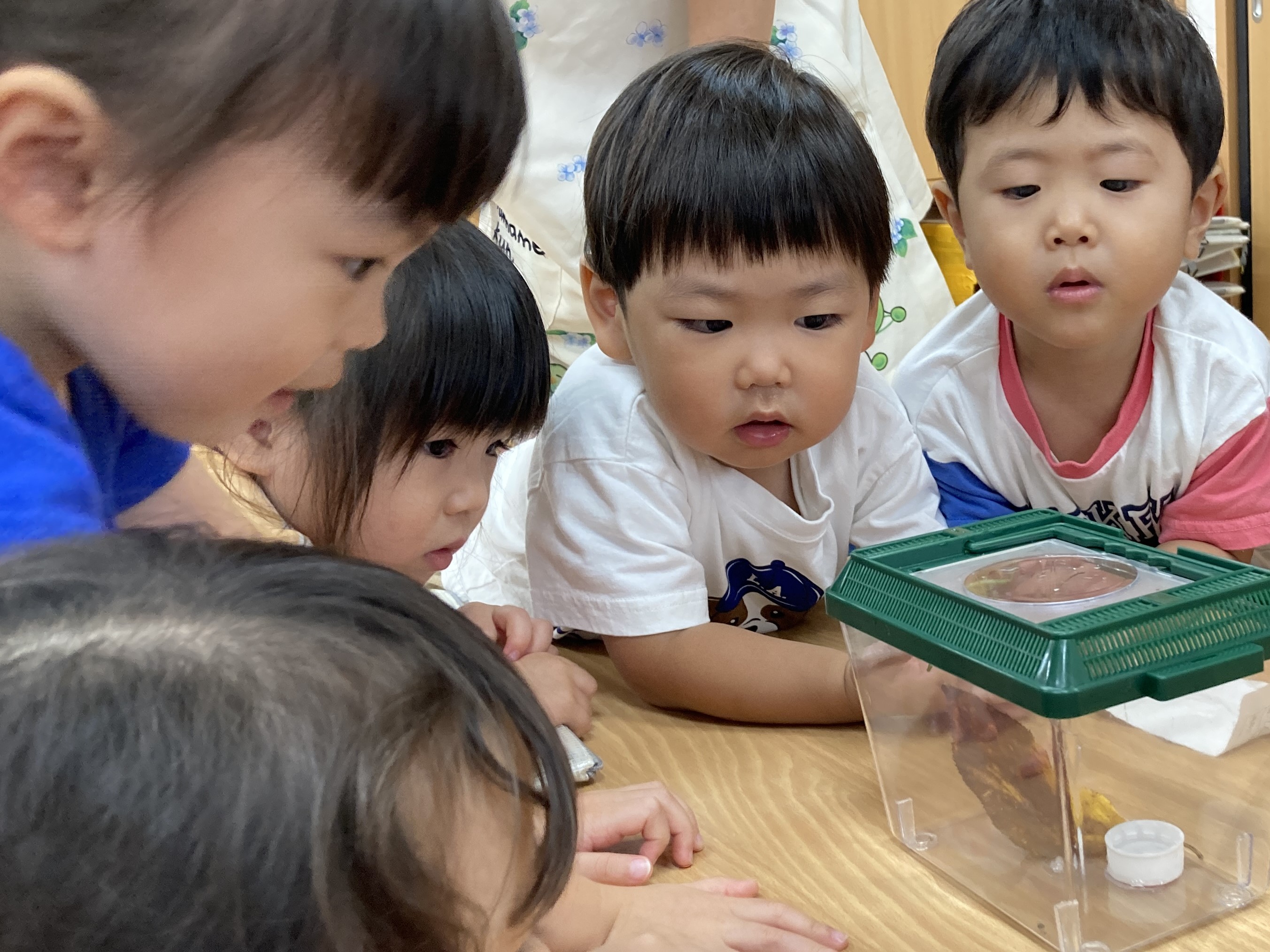ちょっぴり怖くて見ているだけの友達や「触ってみたい!」と手を伸ばすお友達もいましたよ!
