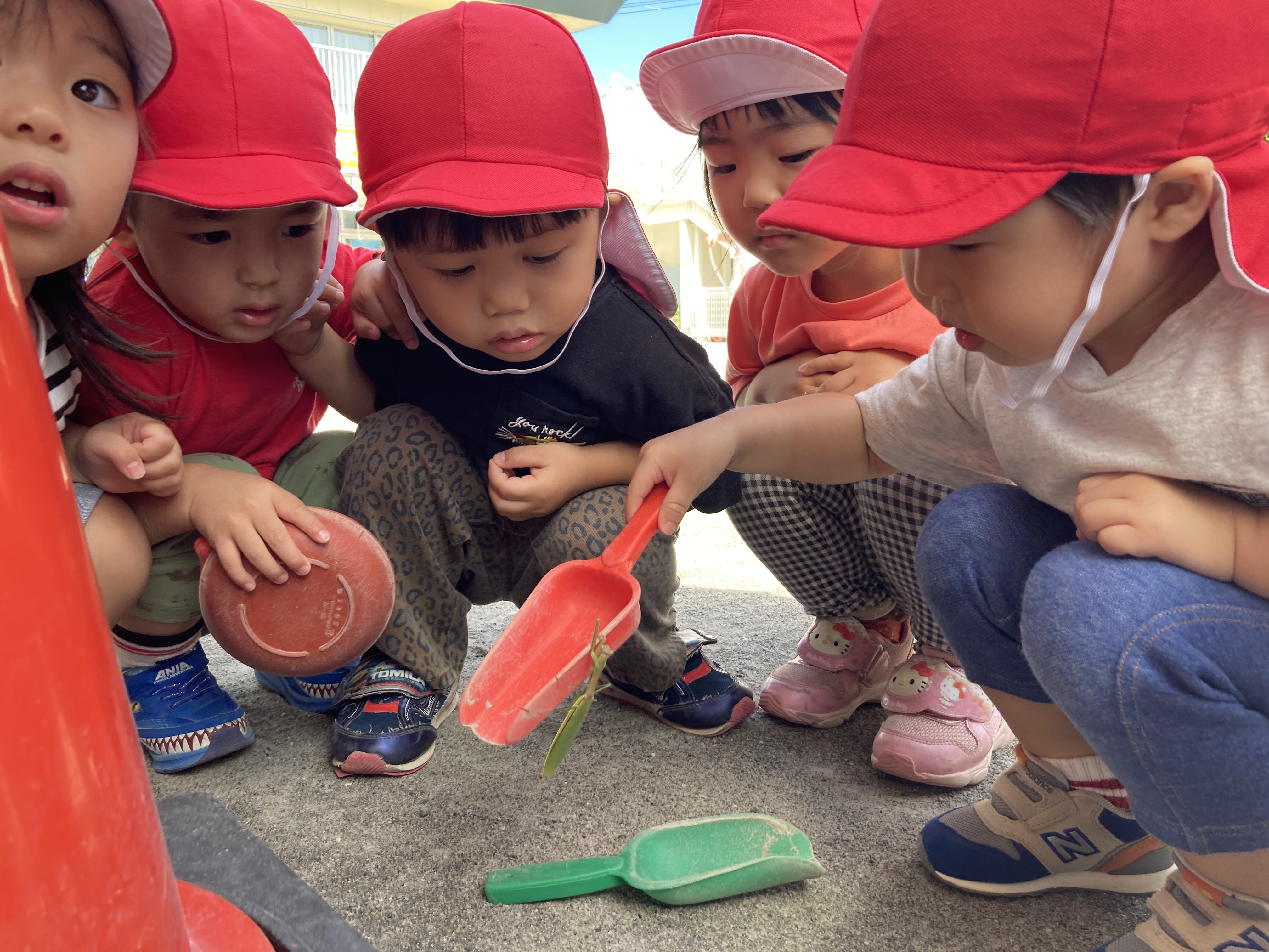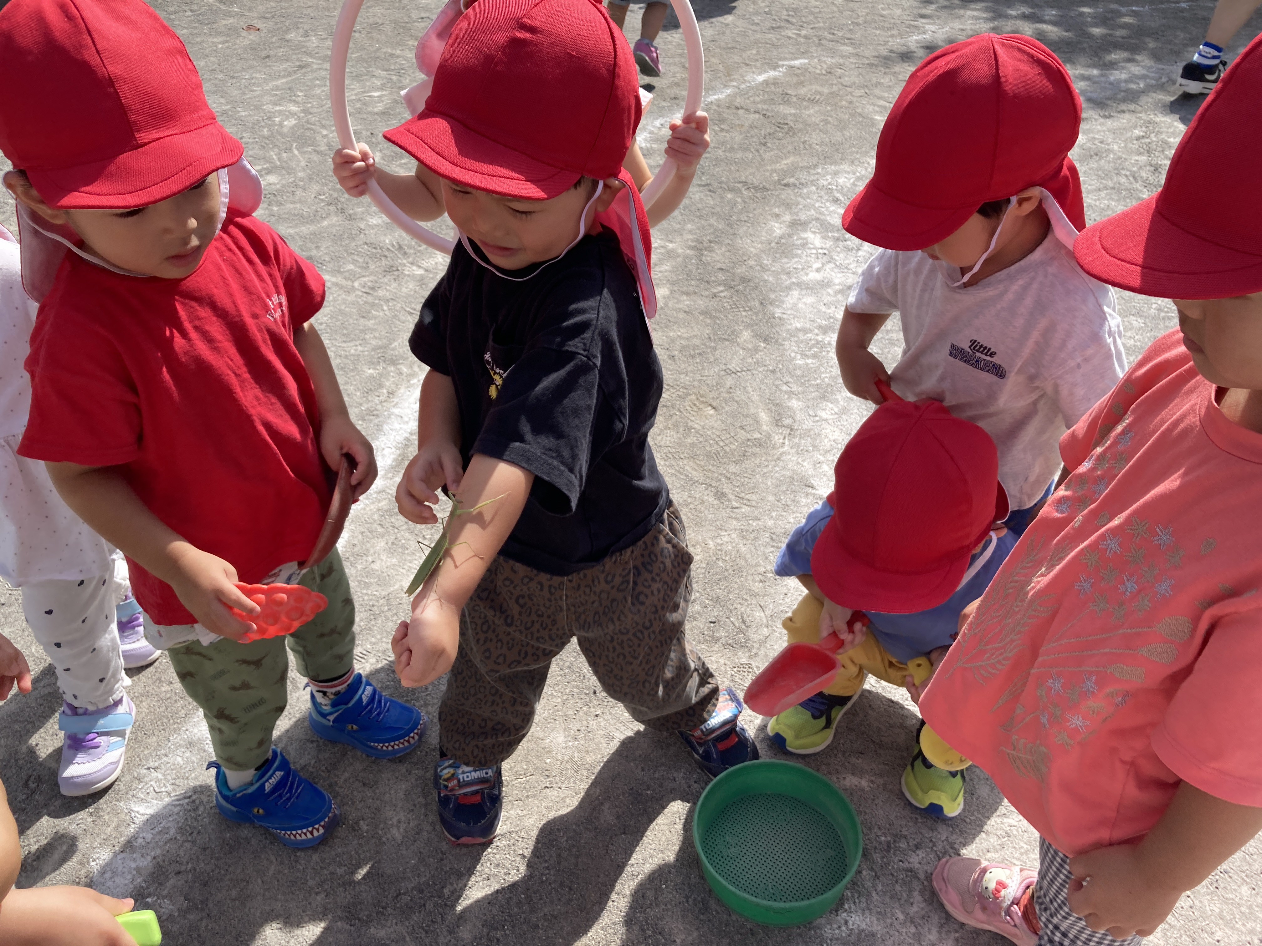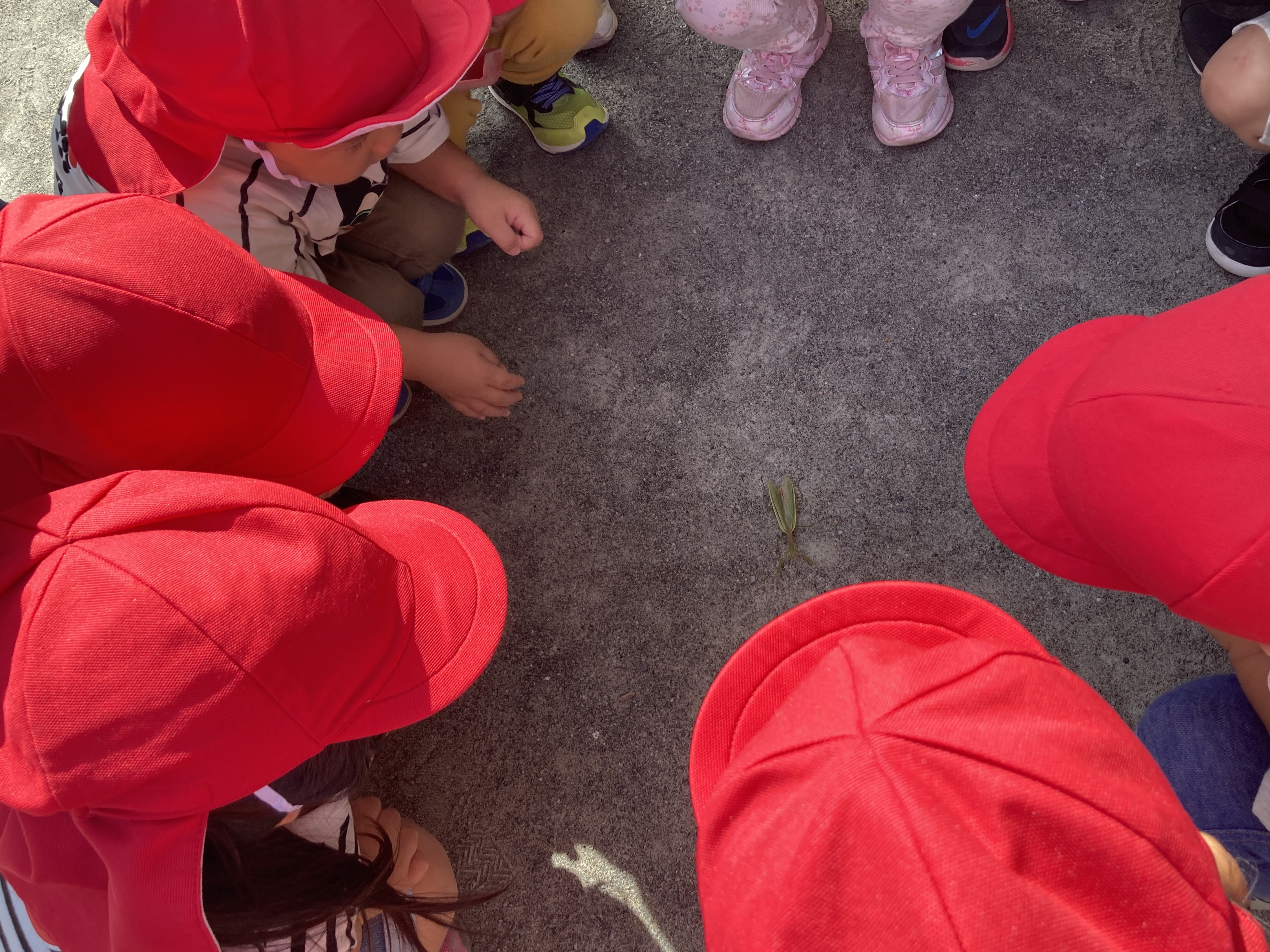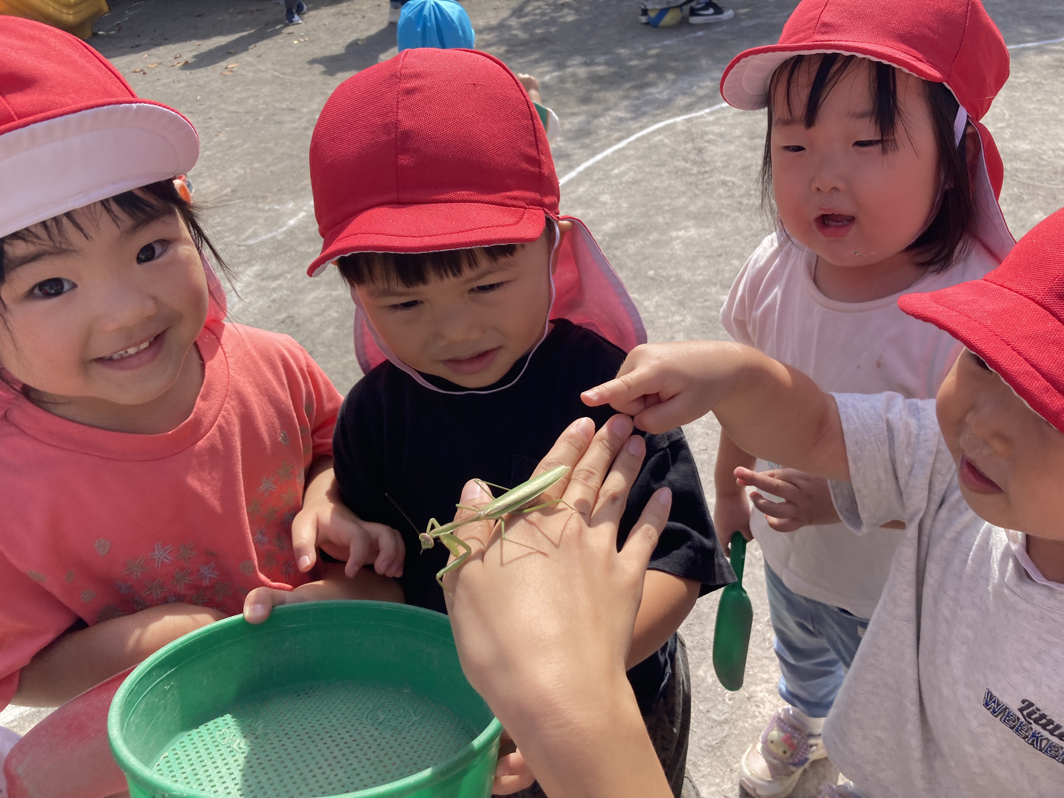 カマキリを見るのが初めてだったお友達もいた様で、「なにこれ~」「大きいね」と驚いている姿もありました。