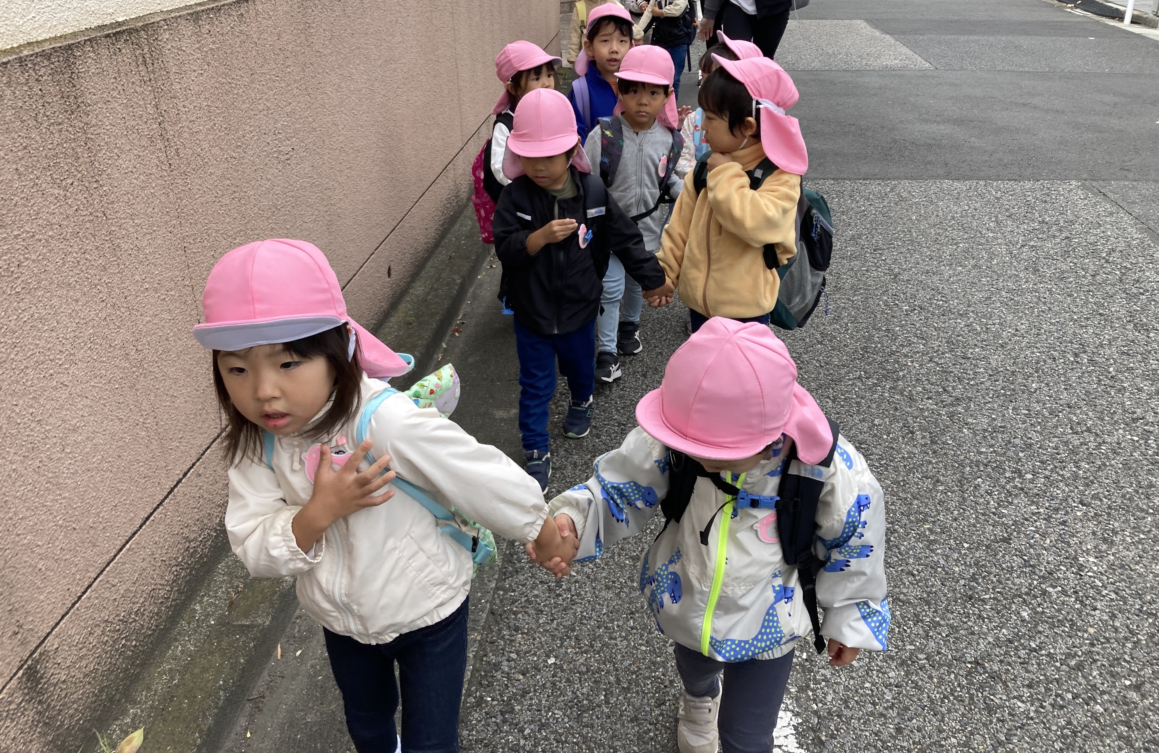 本日は肌寒く曇り空でしたが遠足に行くことが出来ました。初めての遠足にワクワクとドキドキした気持ちで公園まで行きました。